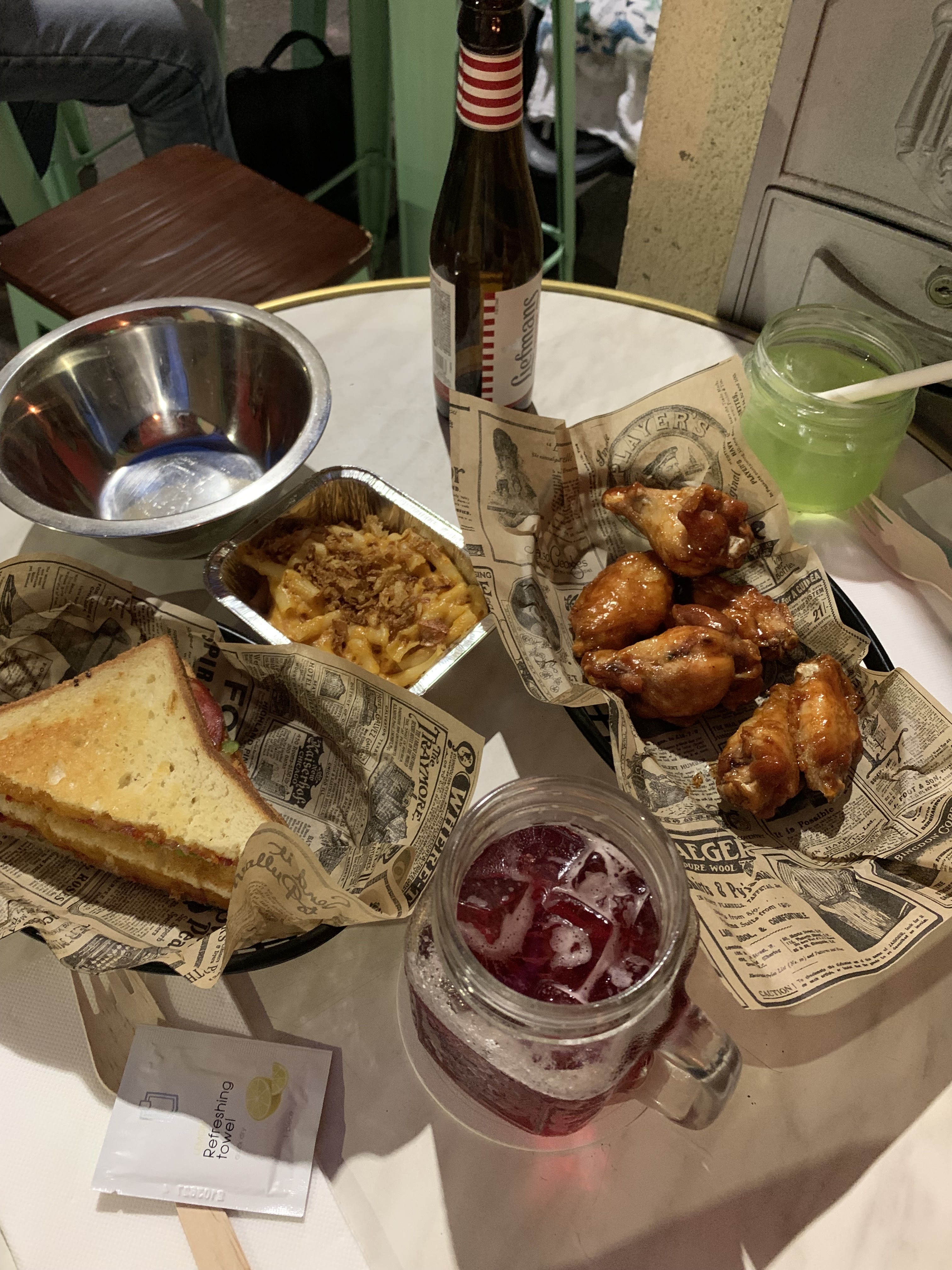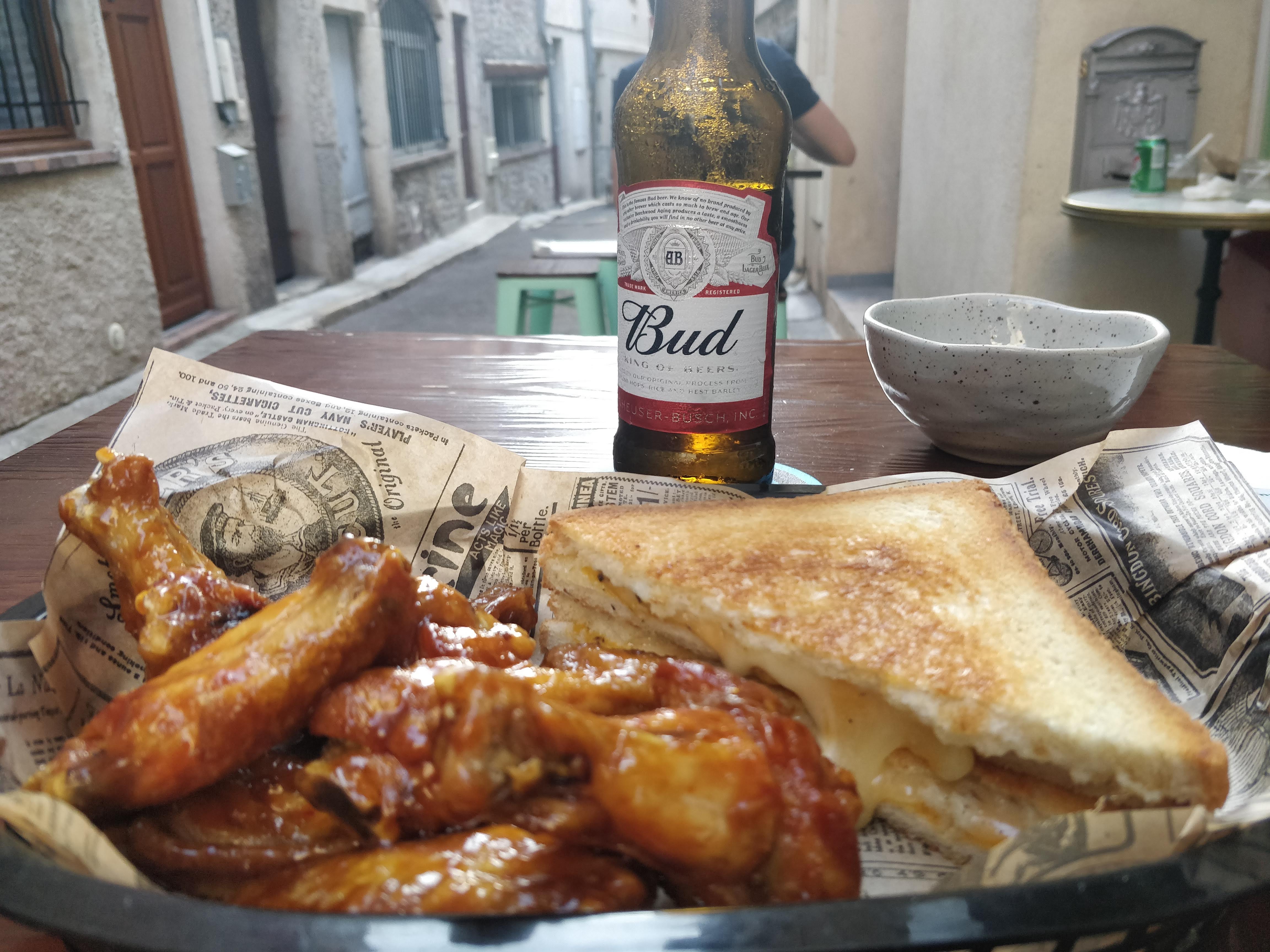 Je recommande fortement ce restaurant, tout d’abord pour la diversité des repas proposés, qui sont à des prix abordables. Je le recommande également pour l’hospitalité du gérant et de son serveur, Math et Chris, qui sont des personnes adorables et très gentilles. C’est un petit restaurant avec quelques tables en extérieur, ce qui pour moi fait tout son charme. Nous étions en vacances sur Antibes pendant 10 jours, ce restaurant nous a donnés envie de revenir en vacances dans le coin. Nous y allions presque tous les soirs durant nos vacances, nous avons donc testé la majorité des repas et tout est absolument délicieux. N’hésitez pas à tester leur délicieux cocktails également. Ma photo a été prises le mardi, ce qui signifie que c’est soir tacos, ce que je conseille fortement également. (Sur la photo : 15 wings avec 3 sauce différentes, 2 cheesy fries, 2 tacos et 1 grilled cheese Blue&Green + 1 cocktail Moscow Mule)