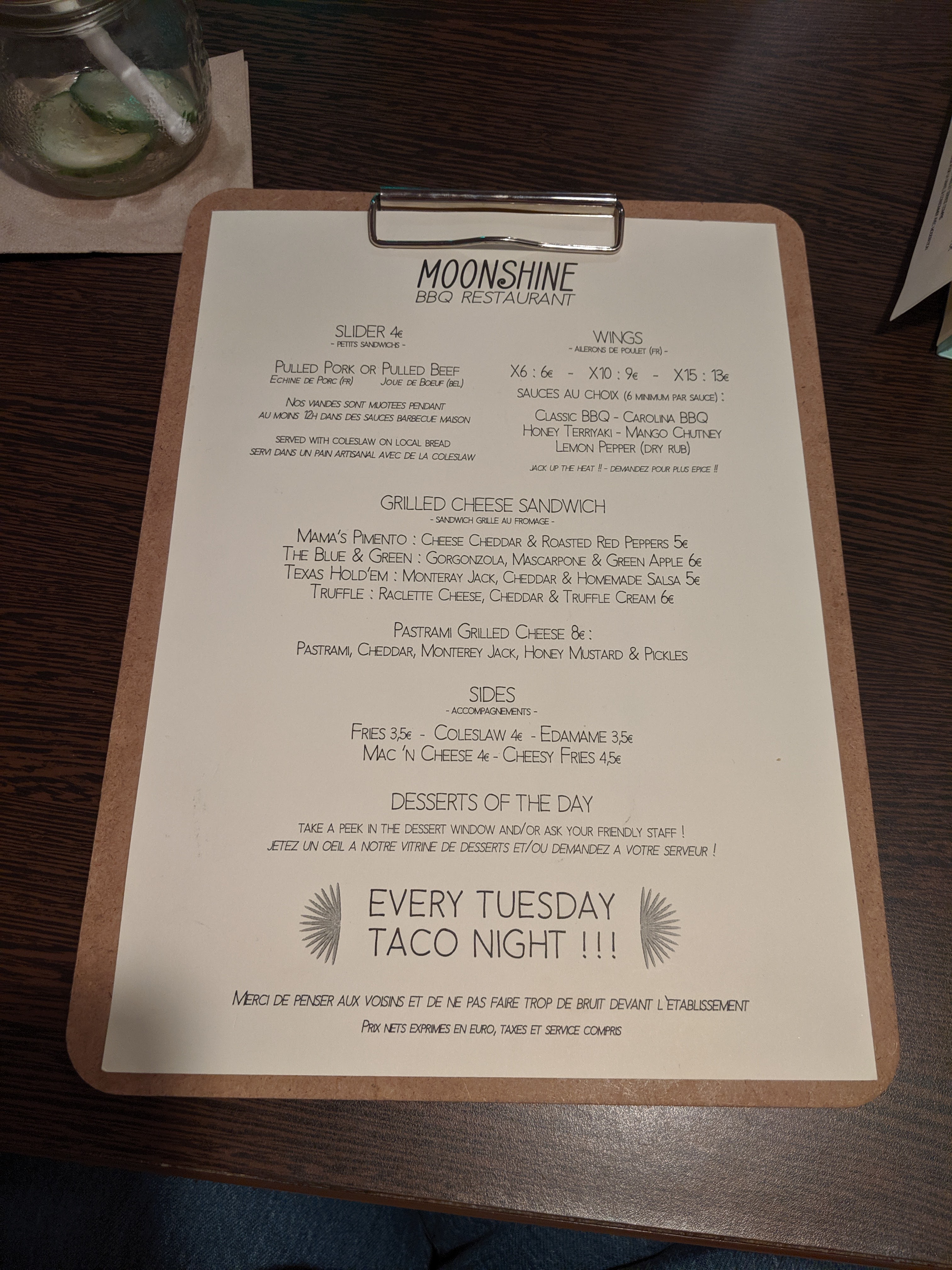 Cadre athipique resto cosi avec une déco originale ! personnel très sympathique et culinairement parlant: goûteux! 😉 les frites sheddar un régal! le cookies choco a tombé par terre! Tout était très bon...si vous souhaitez déconnecter le temps d'un repas, allez au Moonshine! 😉 Moi j'y retournerai sans hésiter!