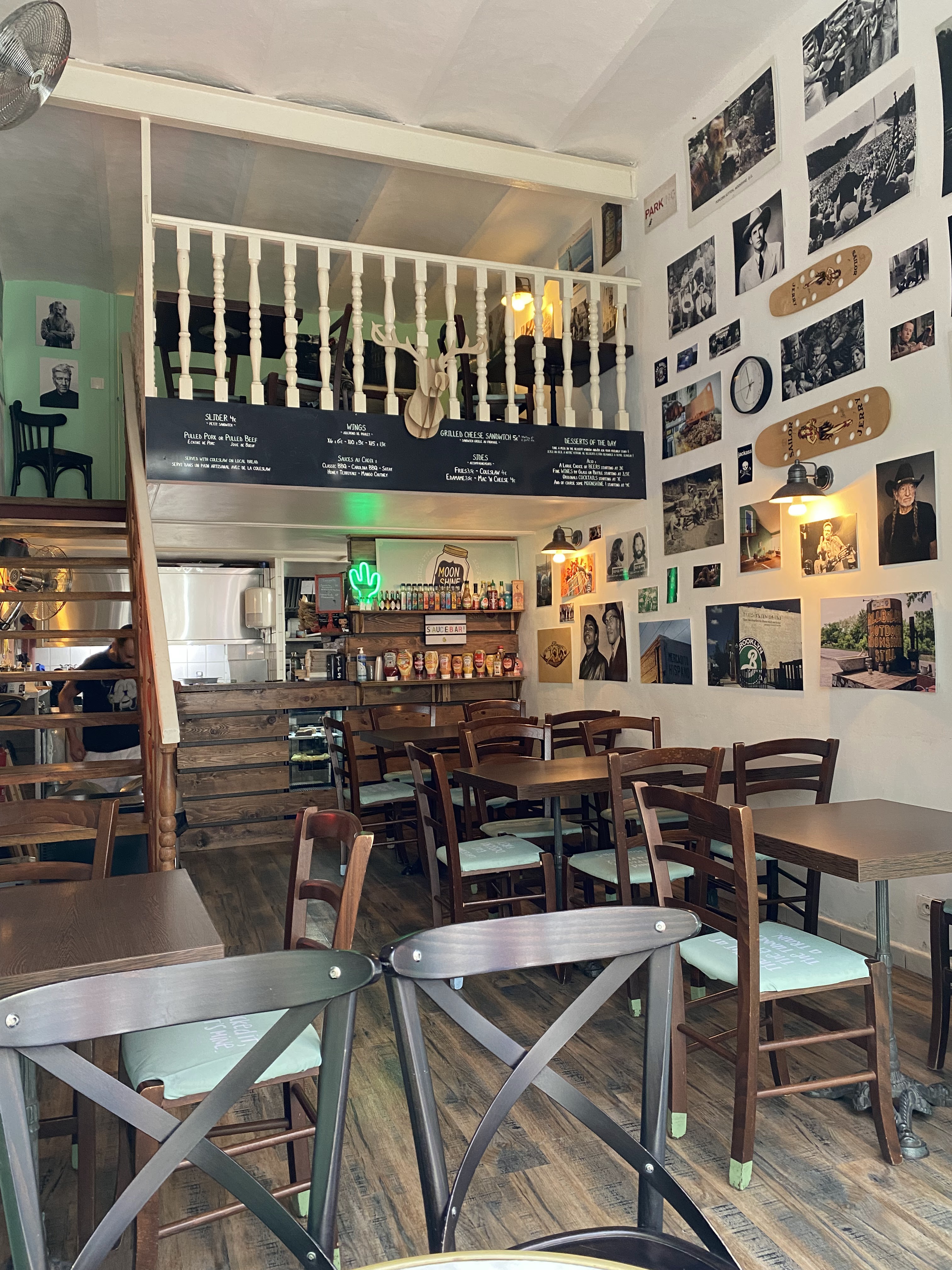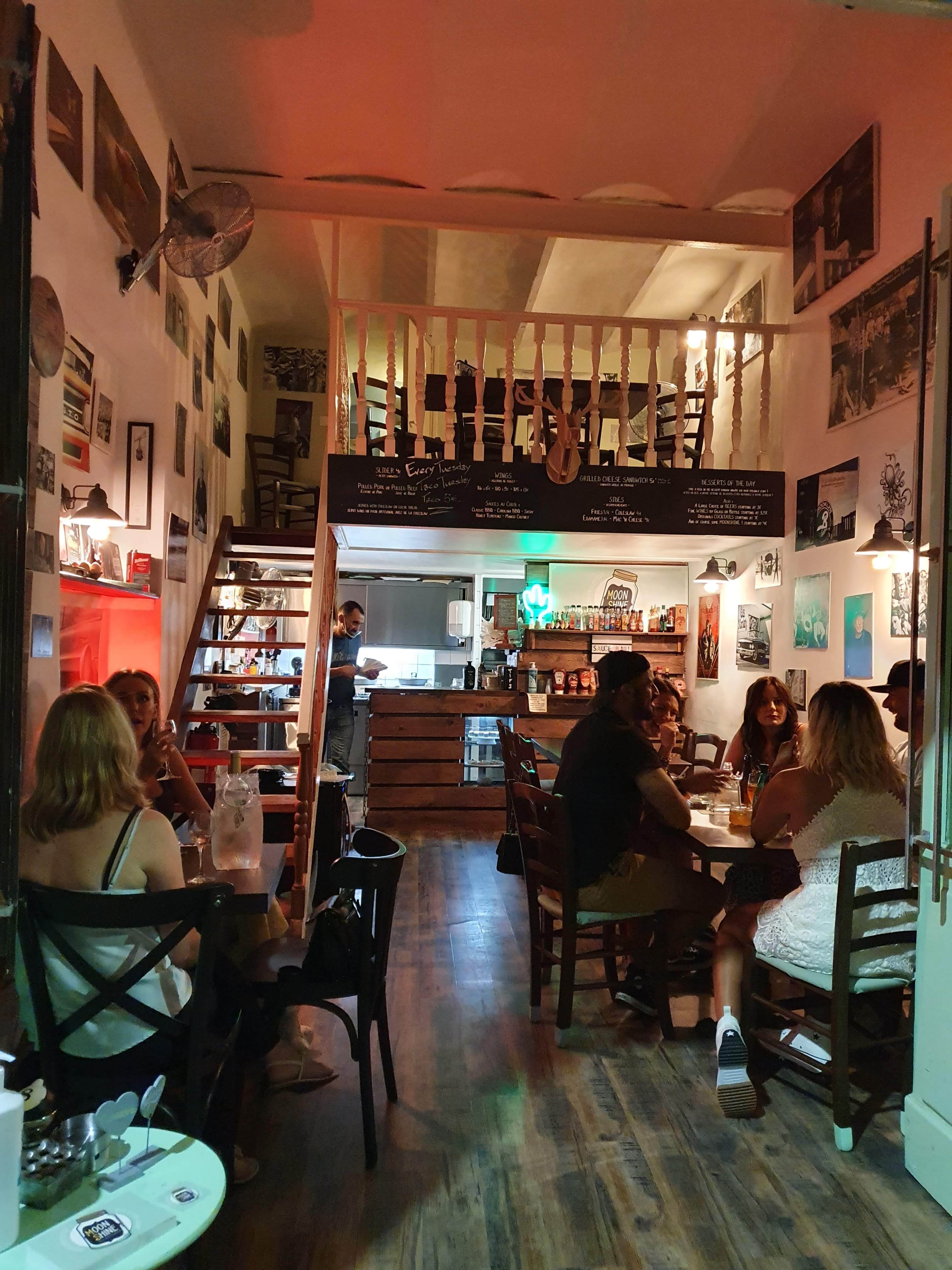 Genre tout petit bar avec tapas américaines. Tu prend 3-4 plats à 4-5 euros une bonne bière en bouteille tu passes un bon moment. Clim pas super efficace.