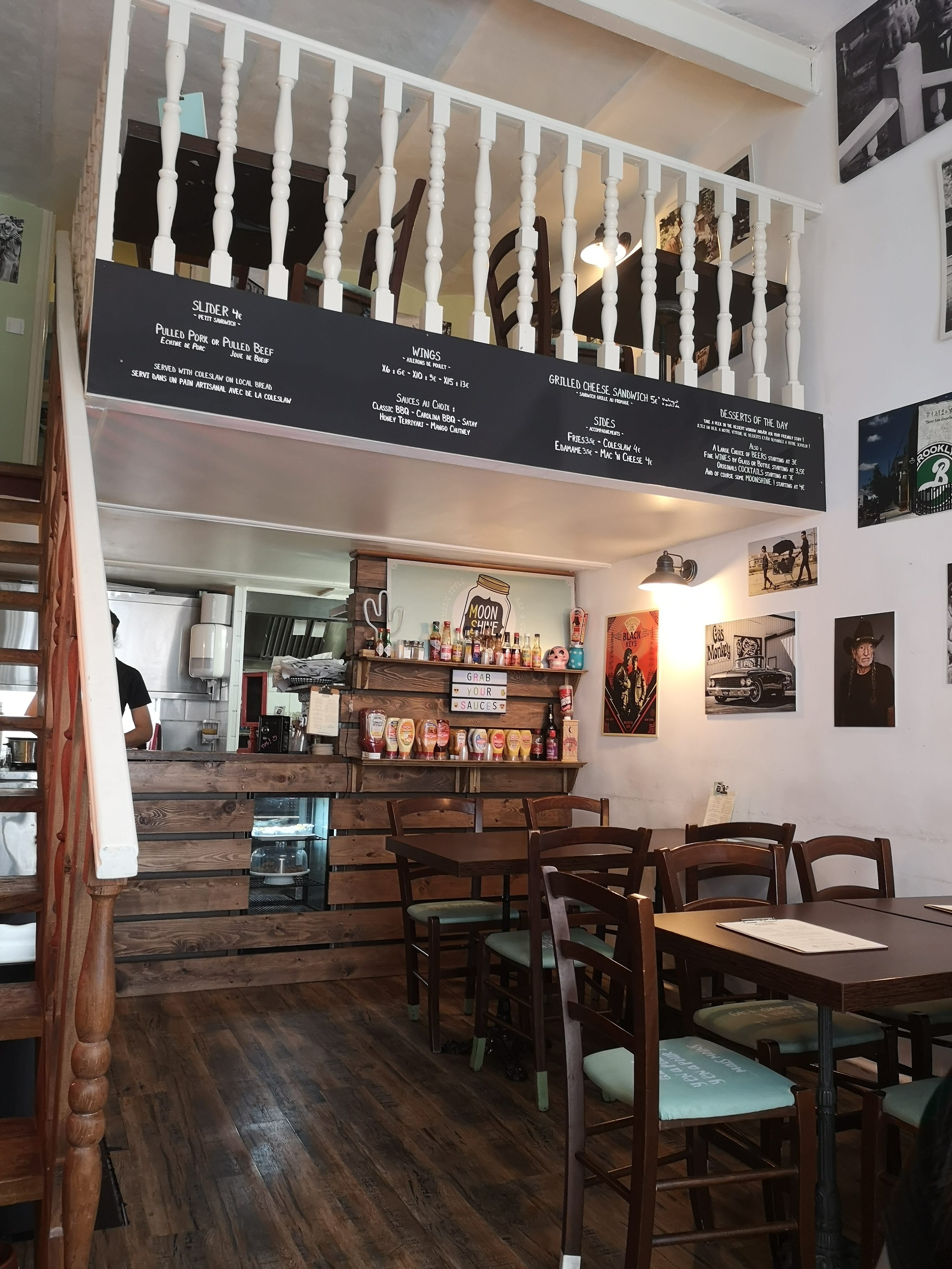 Très belle décoration ! Nous avons vraiment adoré l'ambiance. Le personnel est sympathique et la plupart des plats sont faits maison ! Nous avons pris le bœuf effiloché, les ailes et une boîte de frites. Nous avons vraiment adoré le bœuf effiloché et les frites étaient faites maison et tellement croustillantes. (Pas de photos, nous avions très faim). Demandez toujours ce qu'ils ont comme dessert. Nous avons eu un excellent cheesecake ! Le lieu est petit, pensez à réserver si vous êtes un groupe de 4 personnes ou plus.