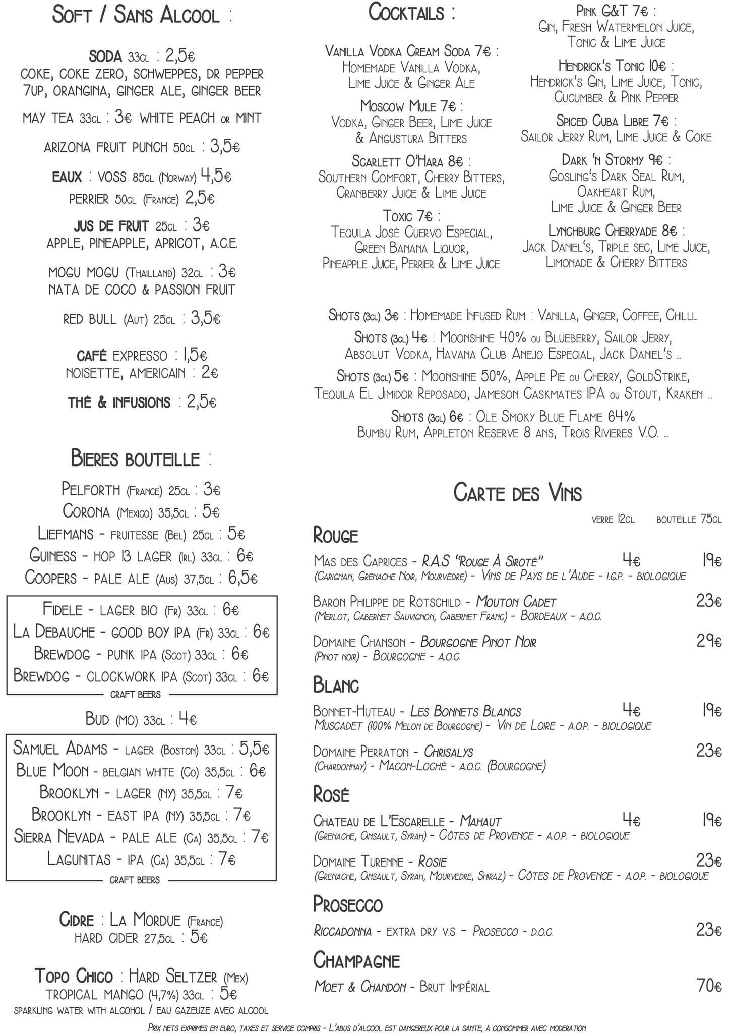 Désolé mais comme nous vous l'avons dit, nous sommes un restaurant, pas un bar. En France, si vous souhaitez servir uniquement de l'alcool, vous avez besoin d'un permis sinon vous devez servir de la nourriture pour pouvoir servir de l'alcool.
