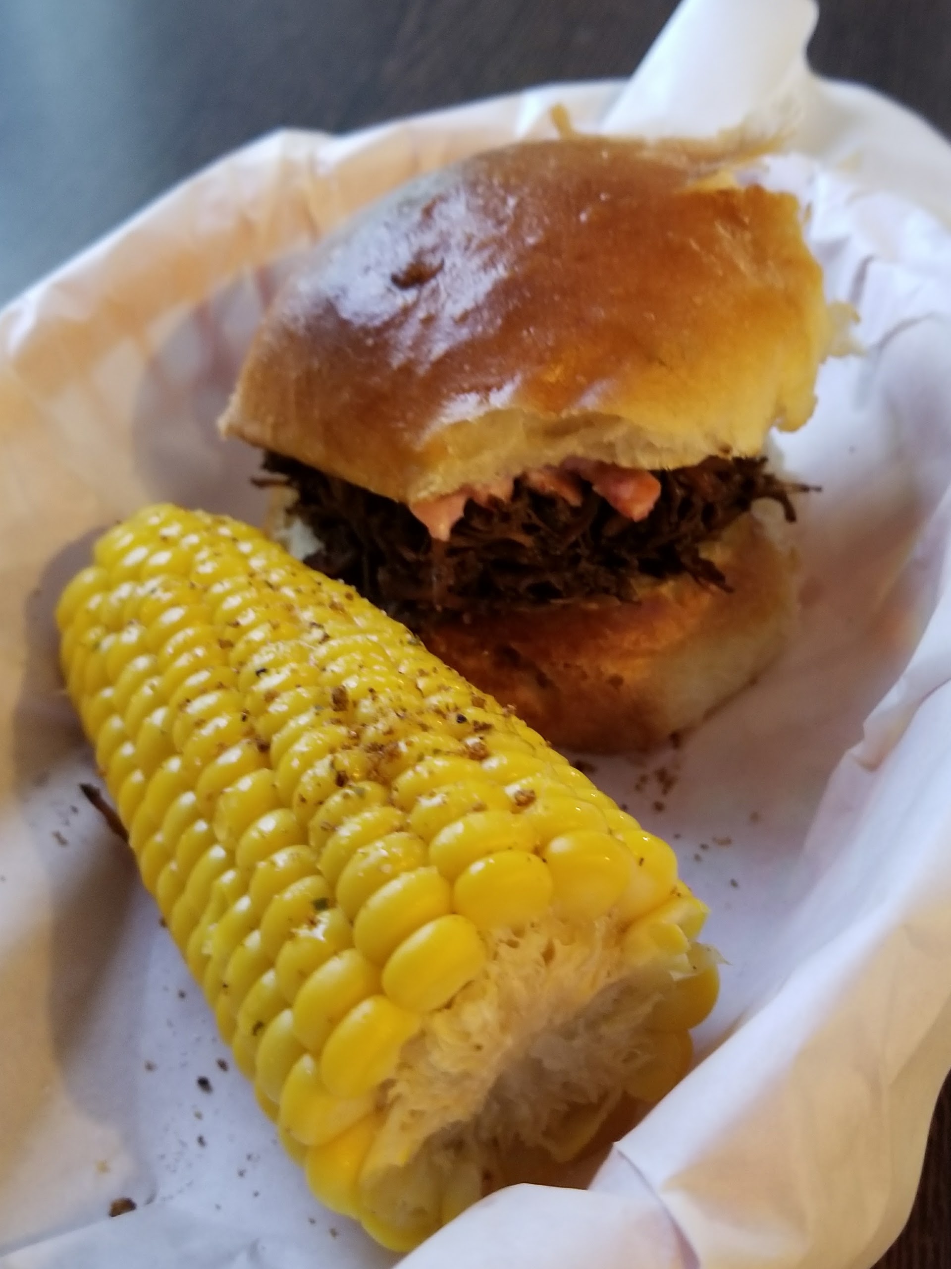 j'ai adoré ce petit trou dans le mur ! Le hamburger au bœuf effiloché était sur le point. L'épi de maïs était aussi bon qu'il en avait l'air. Le fromage grillé au piment était exceptionnel. Le service était excellent, donc je reviendrai.