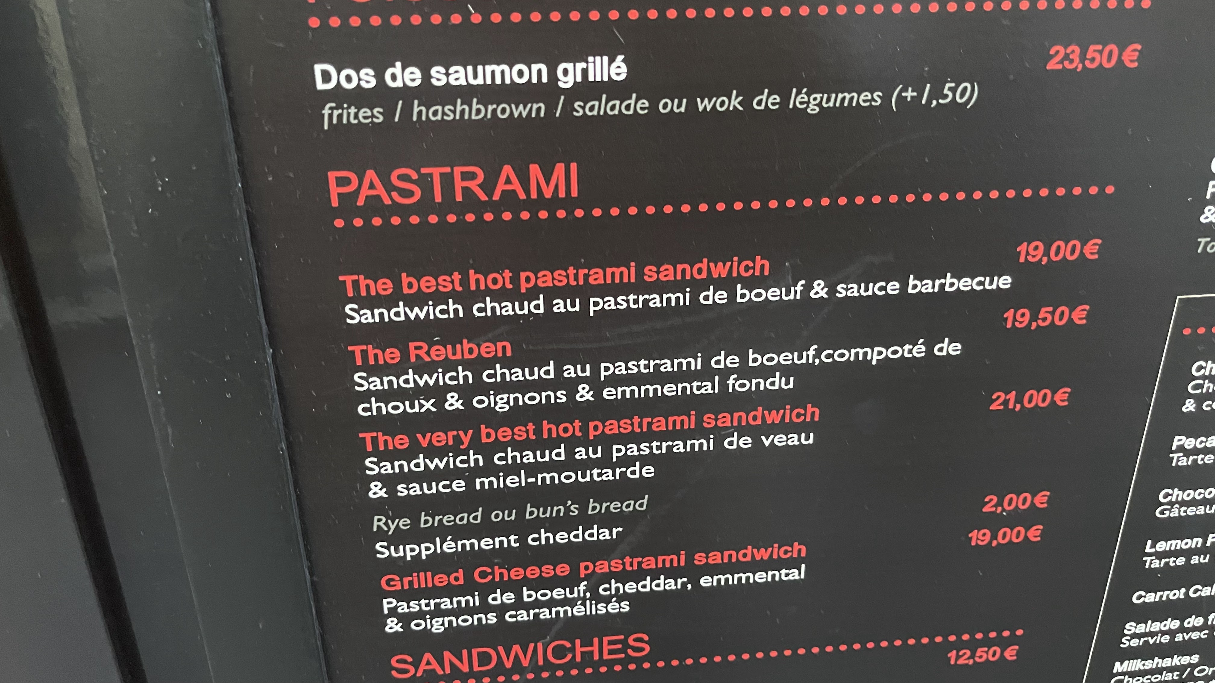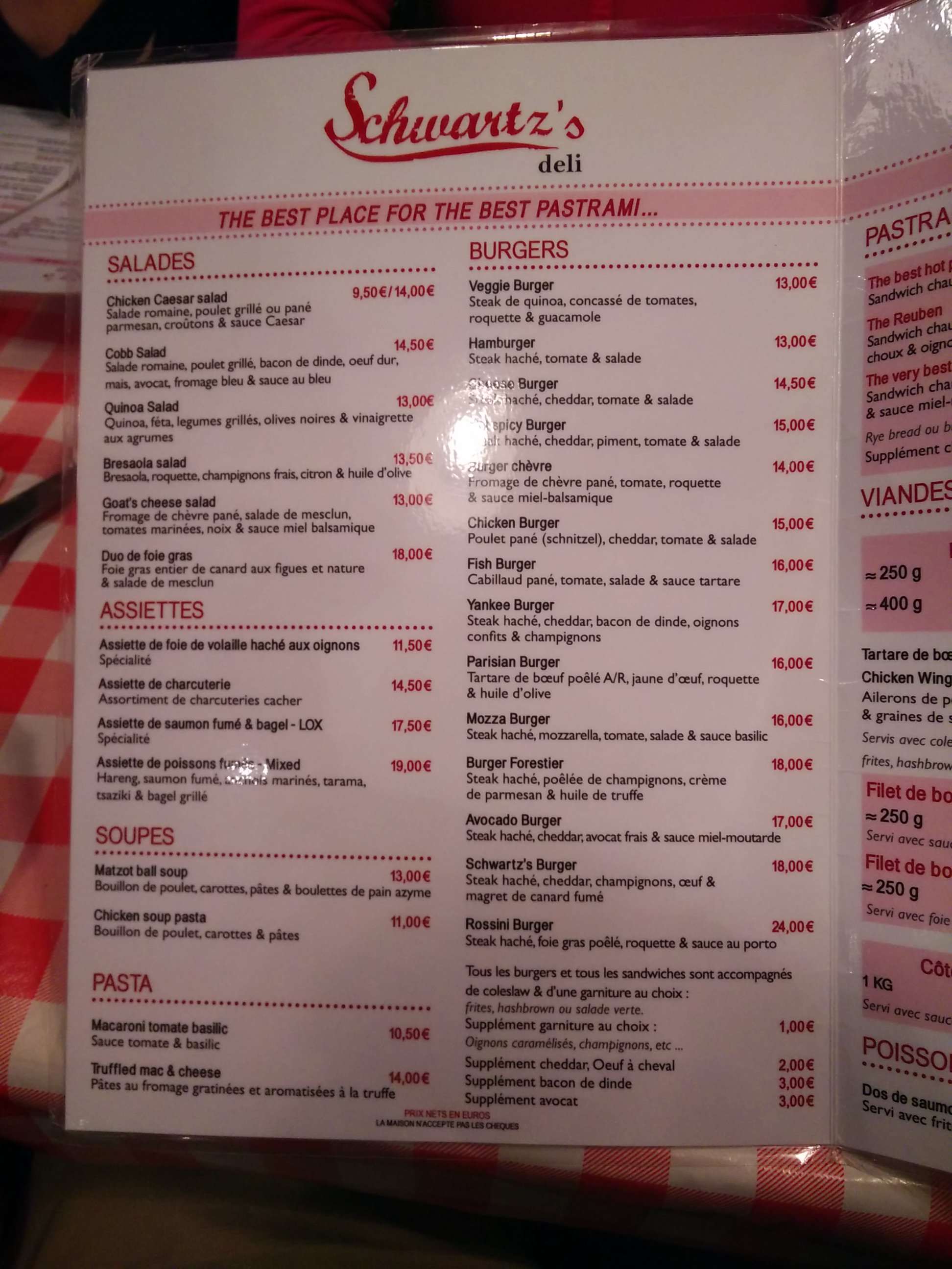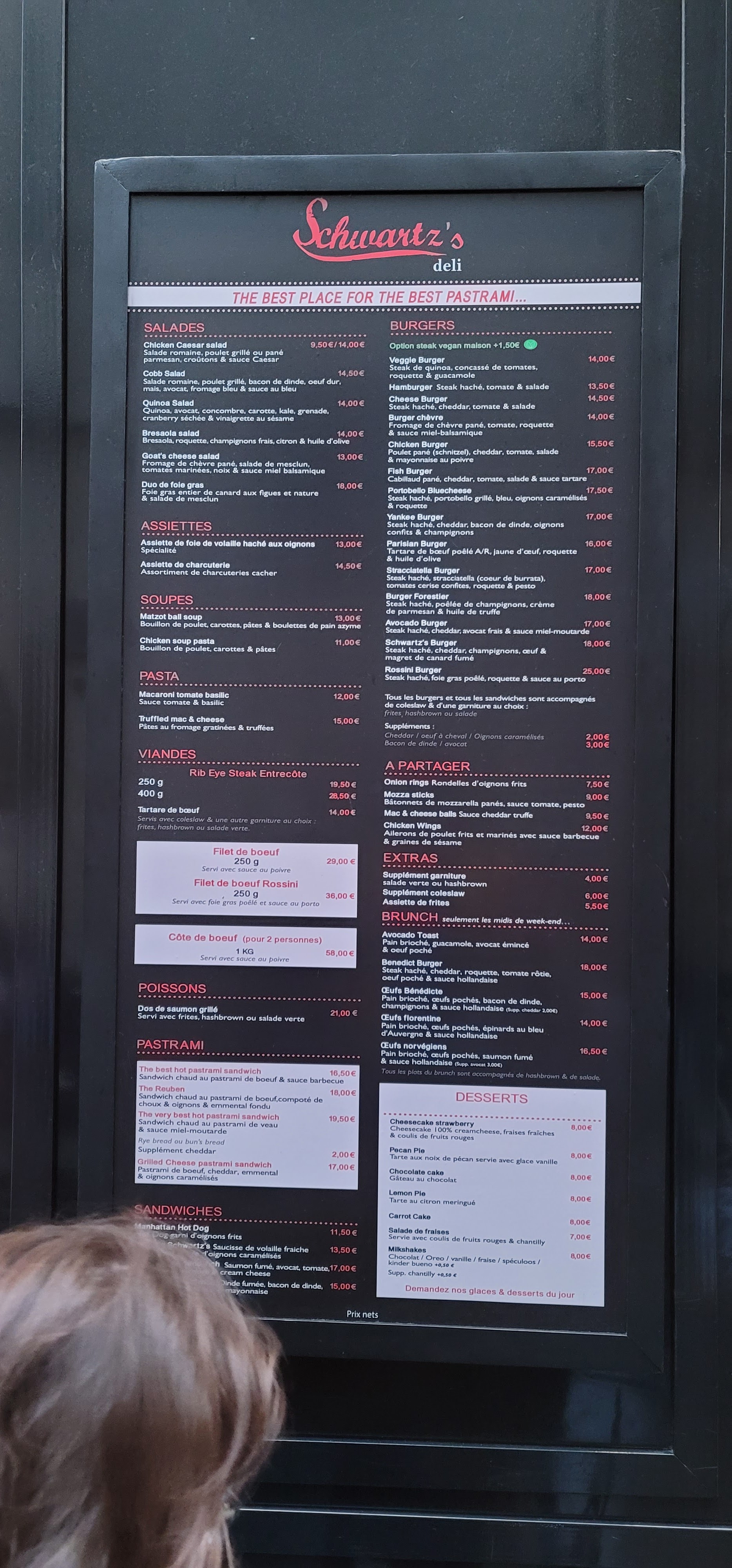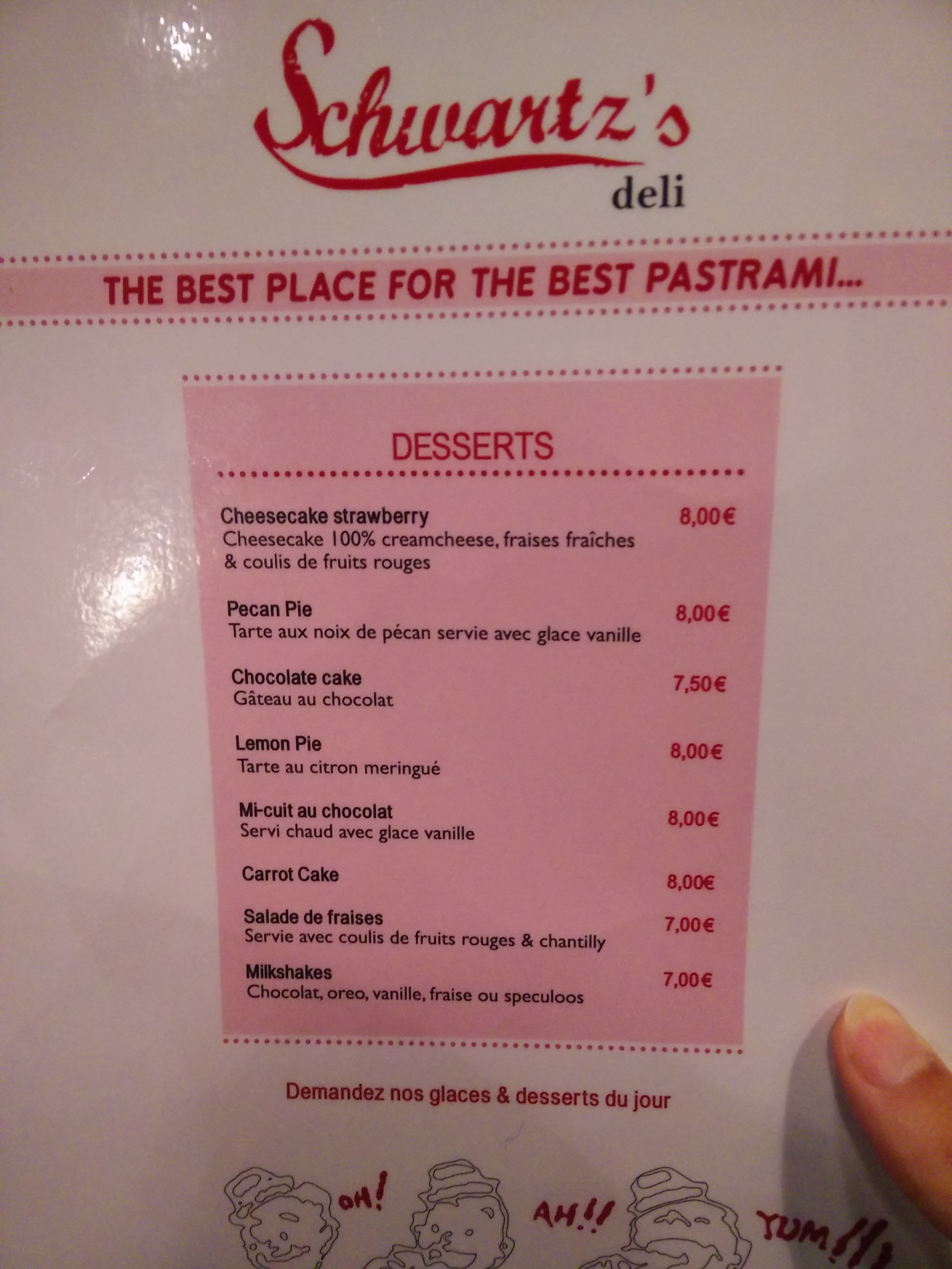 Testé aujourd’hui,pastrami au colorant rose,aucun goût ni assaisonnement qui ont fait la renommée du vrai Schwartz de Montréal. Les oignons confits sont bons. Rien de mémorable. 13,90€ un sandwich sans frites ni boisson… Il fallait que je teste,c’est fait