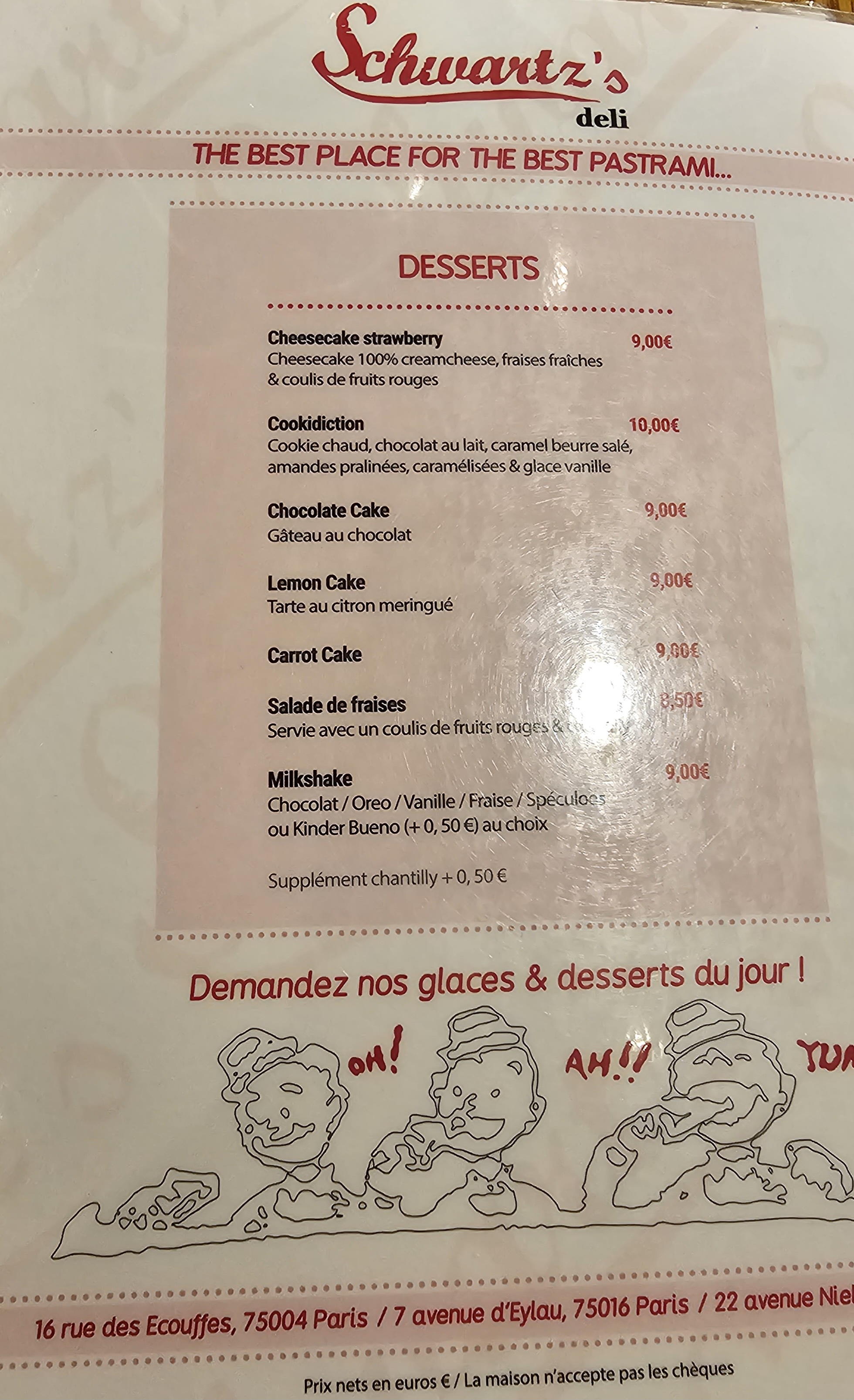 À Paris comme à New York, dans ces « diners » décontractés on sacrifie aux rites du burger, du milk-shake et du cheesecake. The place - Un vrai décor de série US pour teenagers avec de vieilles photos et affiches de pub célébrant un certain American way of life. Dans cette version parisienne du delicatessen new-yorkais se pressent les petites princesses adolescentes du quartier, de futures « Nouvelle Star » (Lussie, actuelle candidate à l'émission de M6) et tous les fans de bagels ou de pickels à emporter dans un joyeux brouhaha franco-americain. En vedette - Le sandwich chaud au pastrami (16 €) autoproclamé « the best », mais aussi un hot-dog de compétition garni de chou, une multitude de burgers dont un Parisian… au tartare de bœuf, mais aussi des cheese-cakes et strudels aux pommes qui suffiraient à faire un repas. Des portions très généreuses qui compensent le peu d'élégance gustative. L'idéal : commander un assortiment de charcuteries (13 €) et déguster le spectacle en salle en sirotant au choix une Bud ou un mythique soda Dr Pepper. (Le Figaro)
