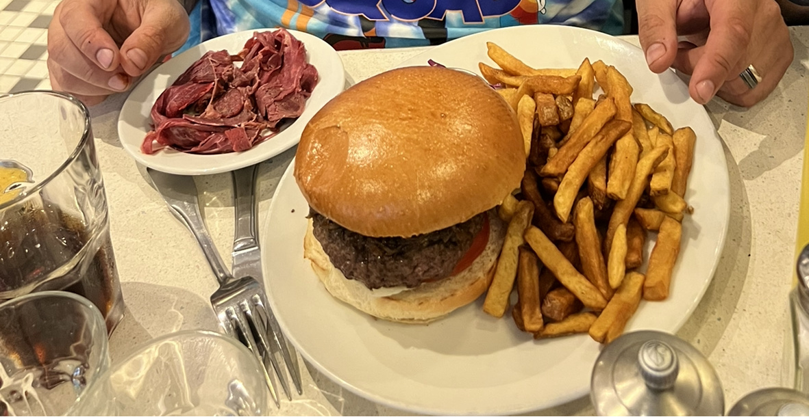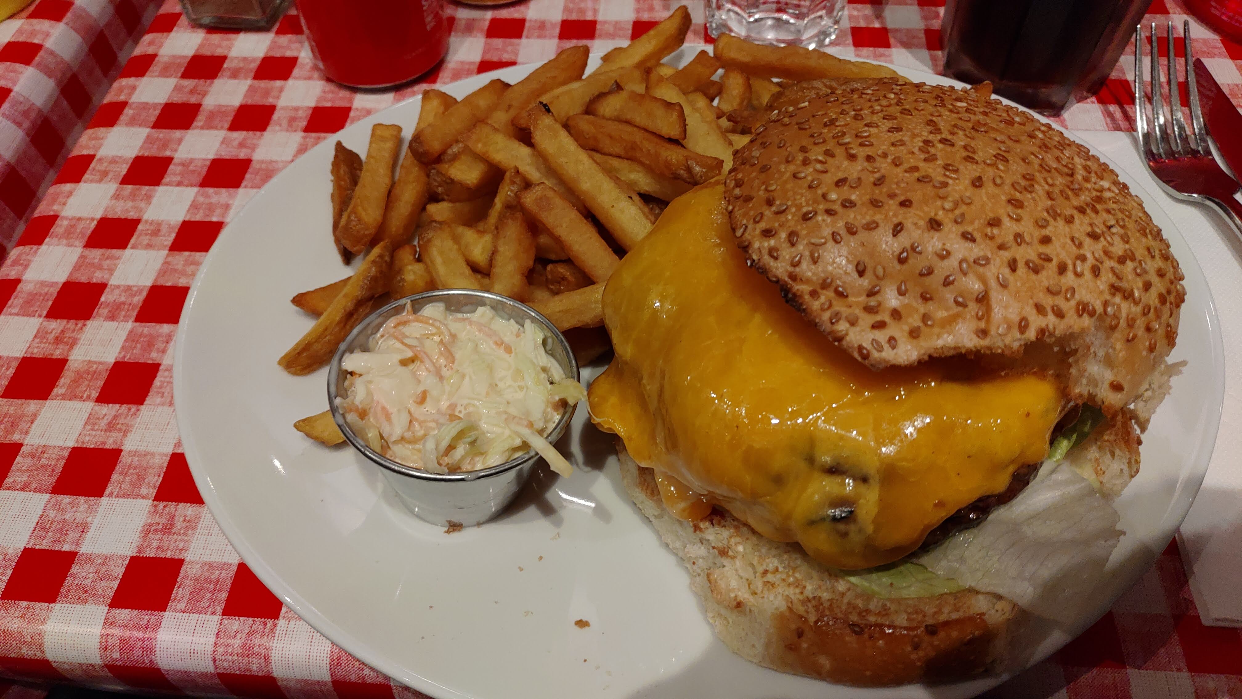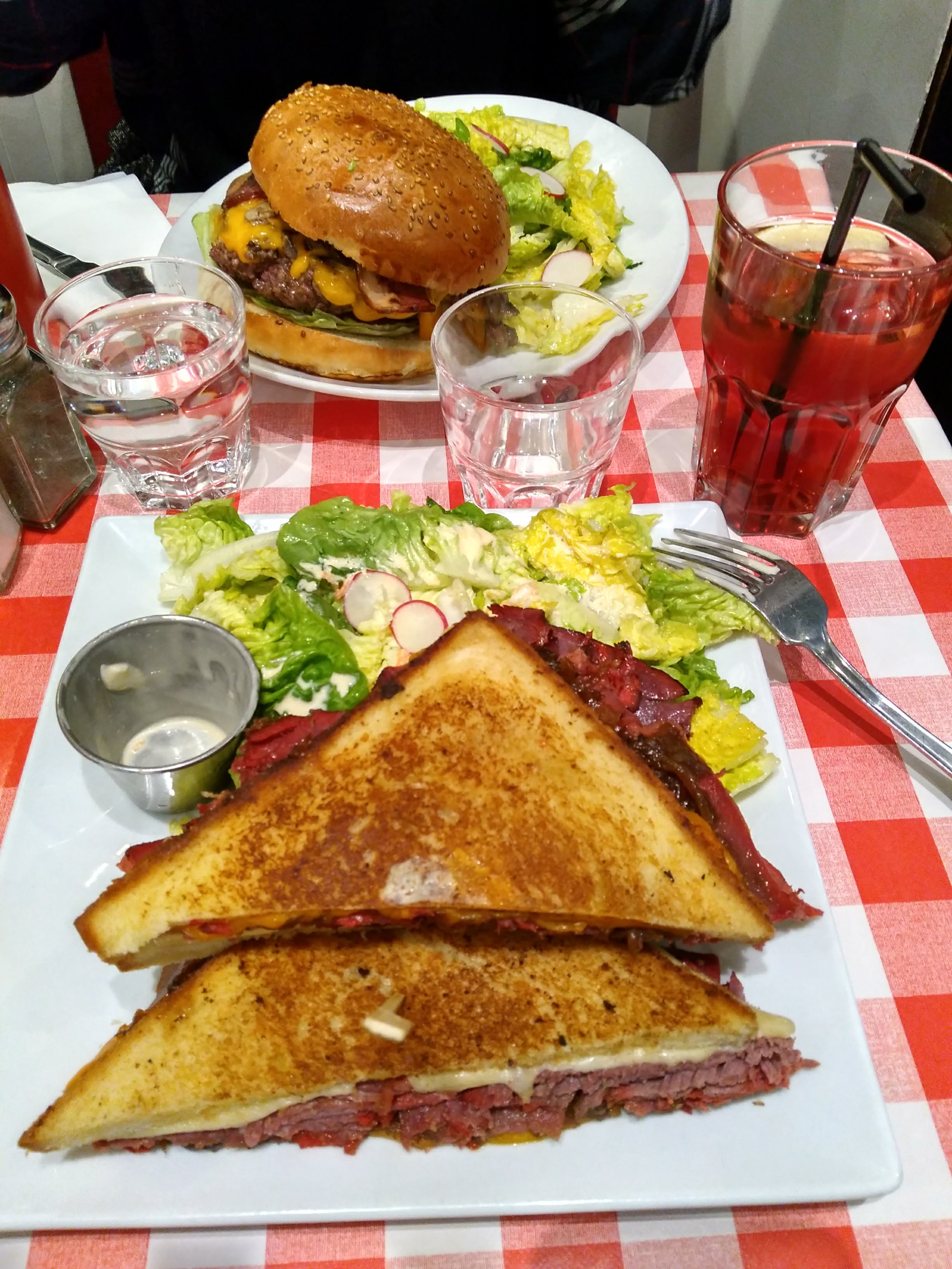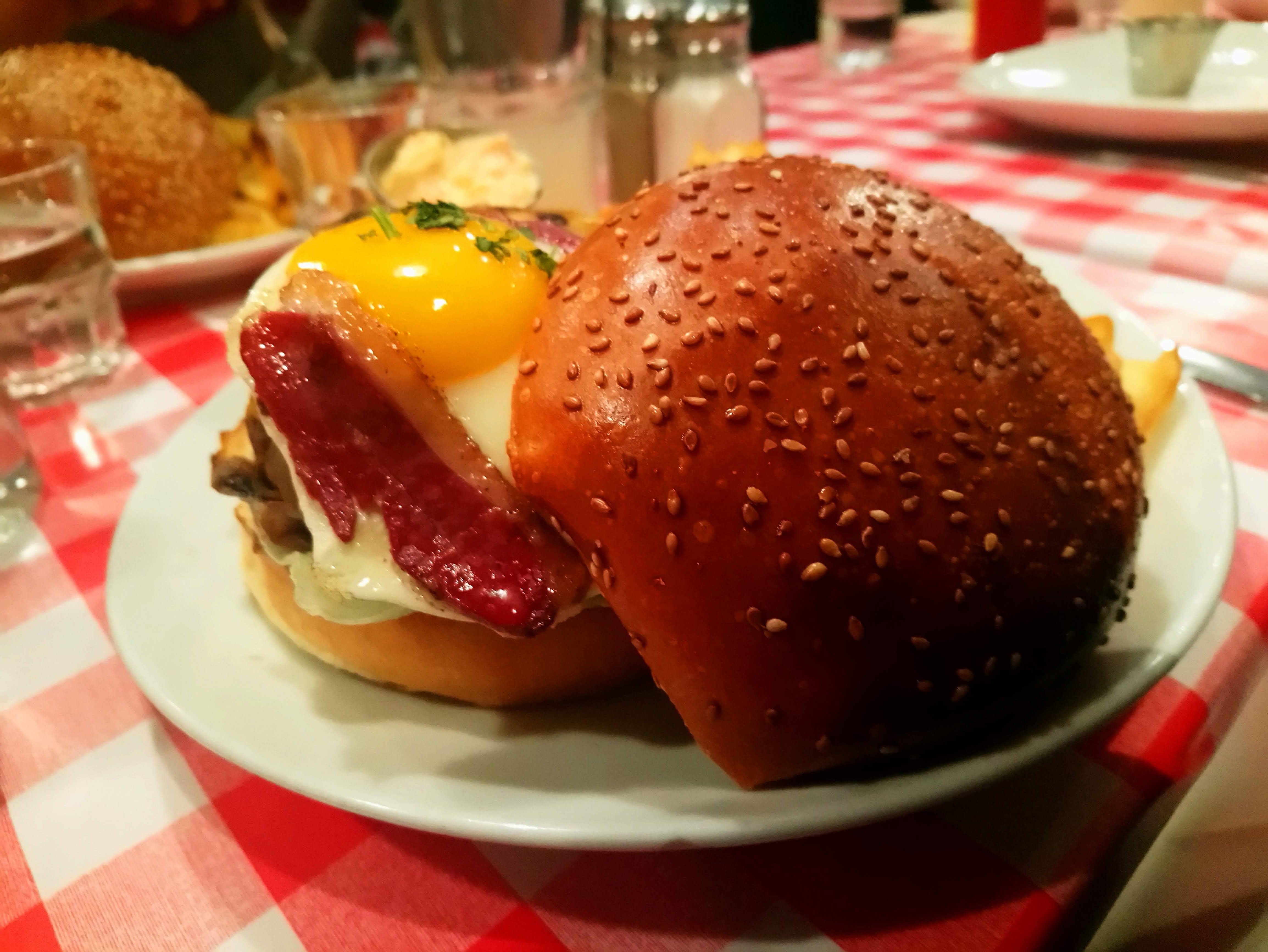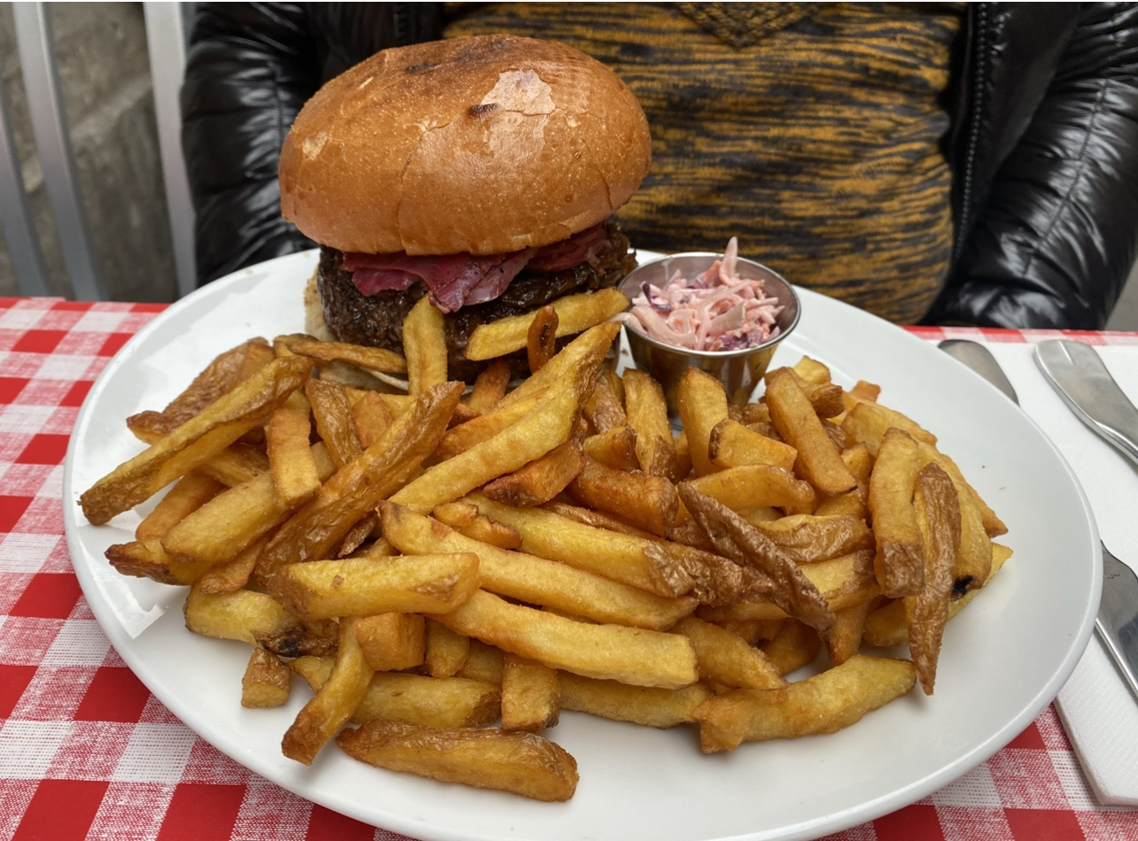 Excellent burger Rossini au porto ! Le steak haché de bœuf est un des plus épais que j'ai vu et on vous demande sa cuisson. C'est très copieux et les frites en accompagnement sont en grande quantité. Burger forestier également très bon, la crème et les champignons en font une combinaison très intéressante. Ce restaurant propose aussi des sandwichs au pastrami, des reubens ou encore des hot-dogs, la carte est très variée. On est un peu serré avec les autres tables mais le service est très rapide et le personnel très convivial. Nous reviendrons avec plaisir pour essayer d'autres choses !
