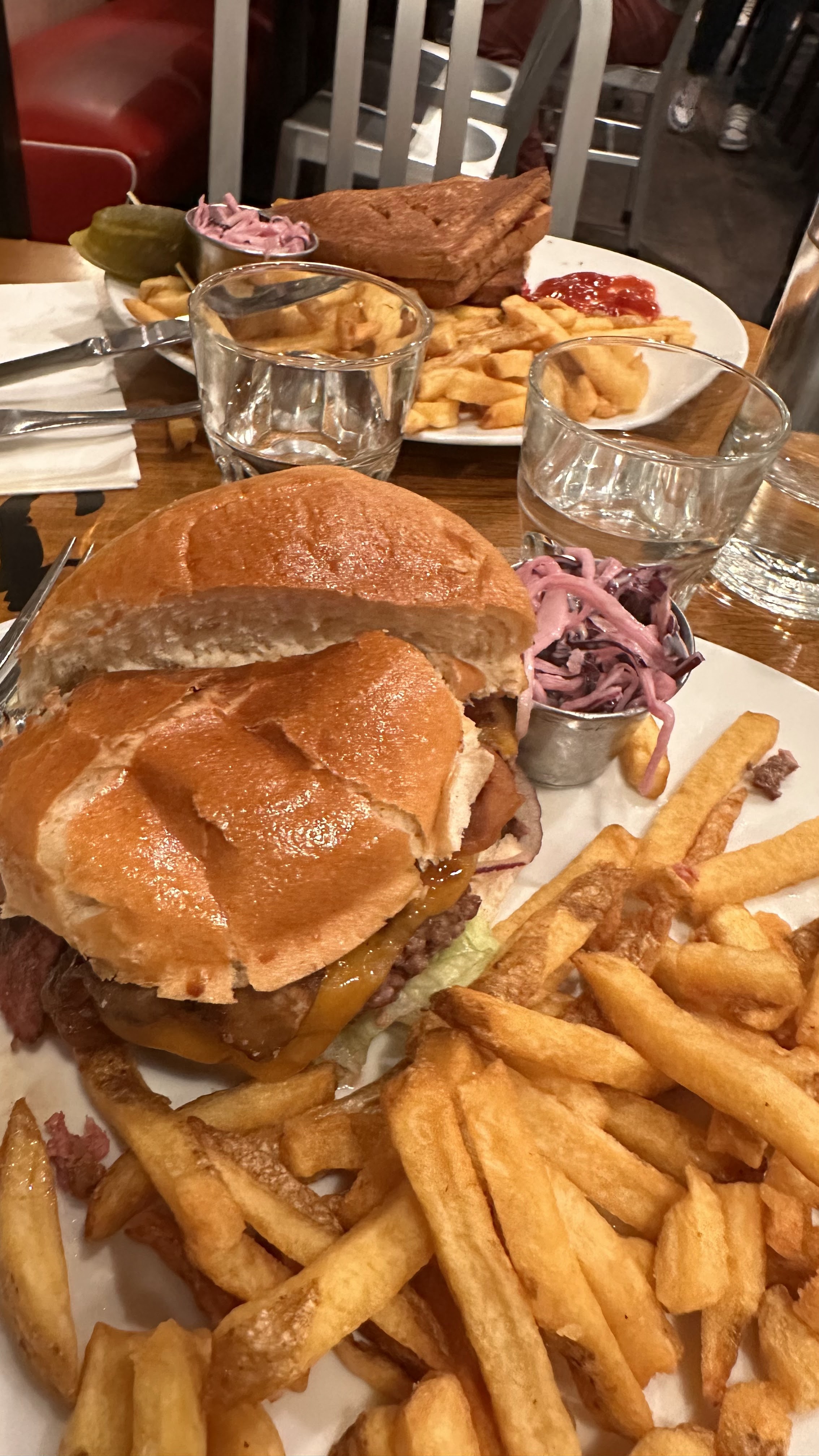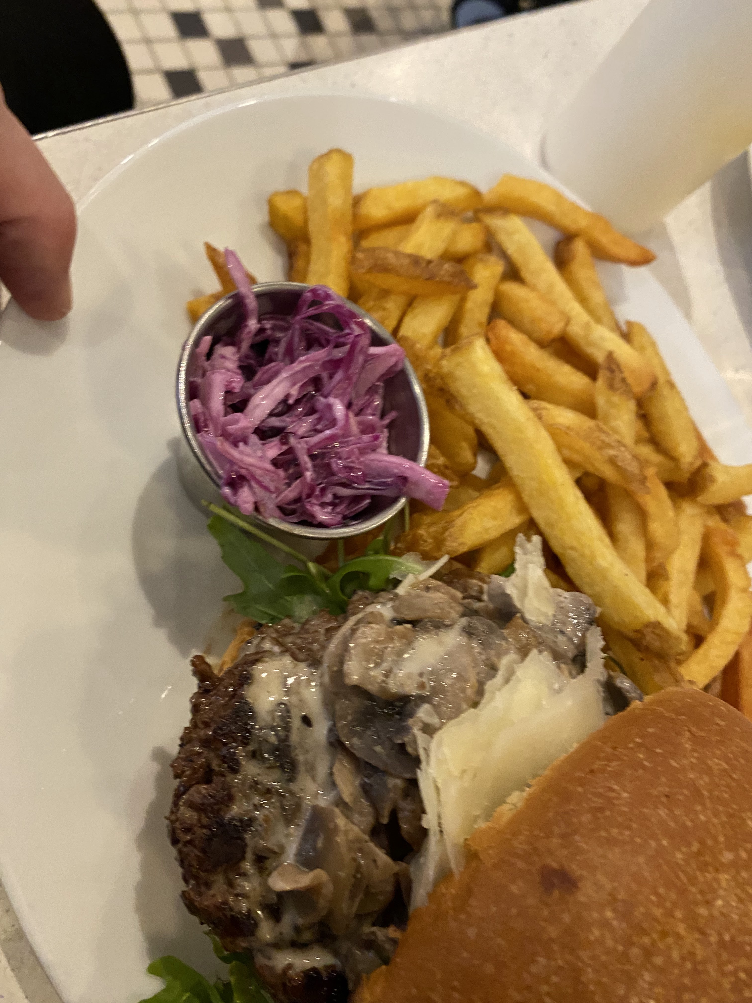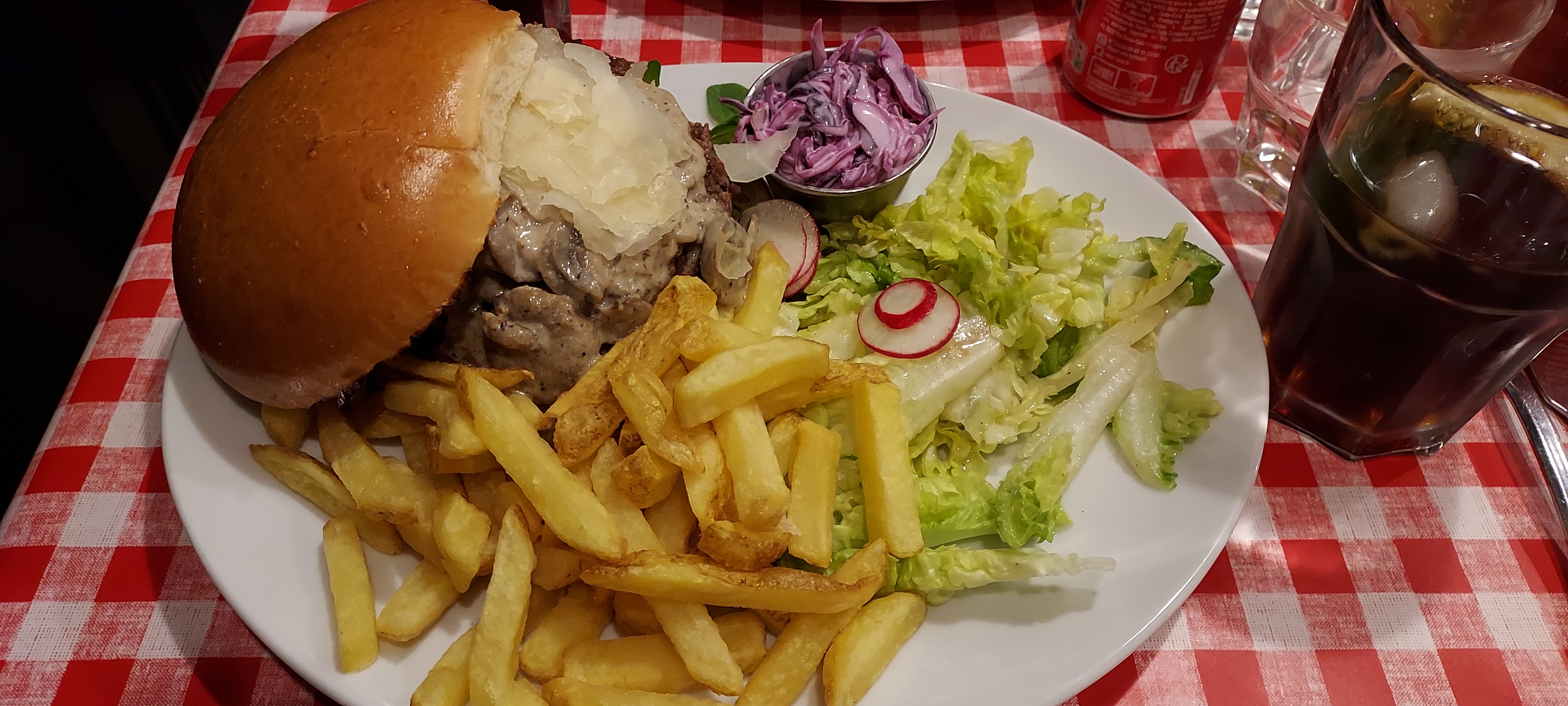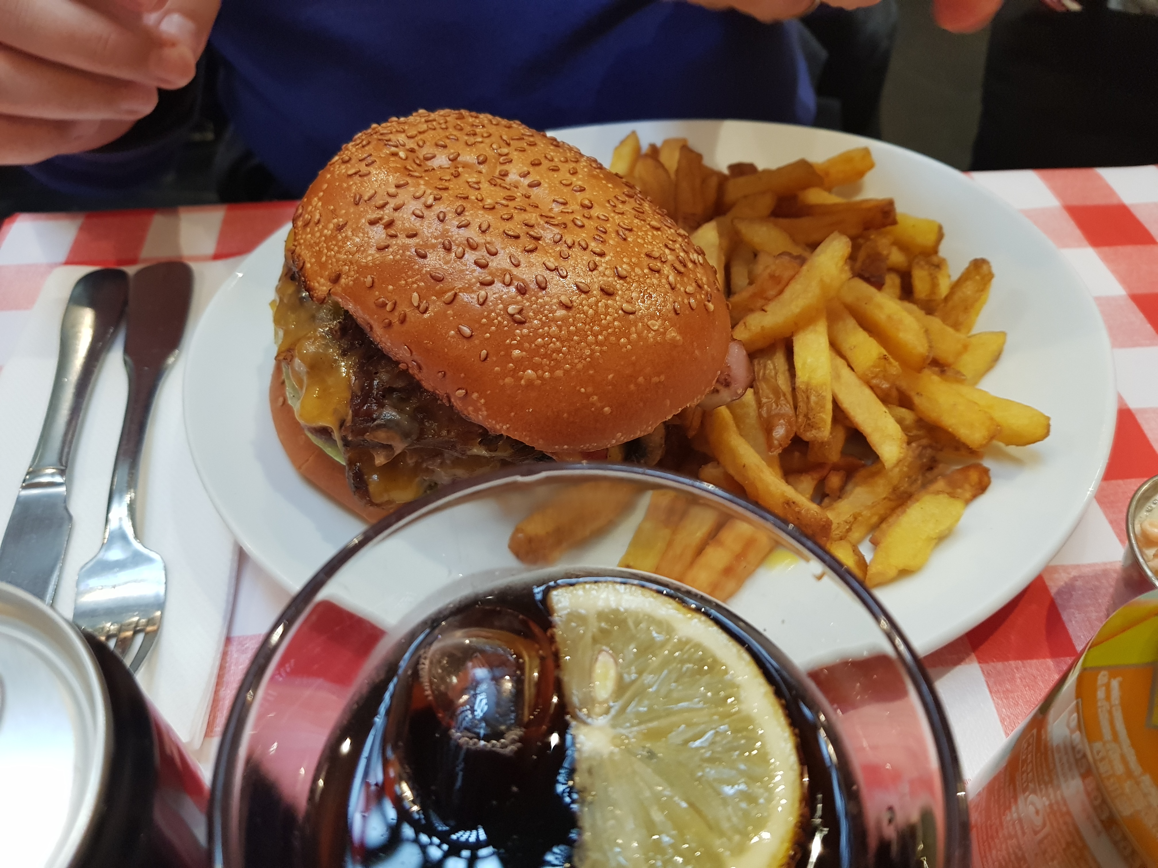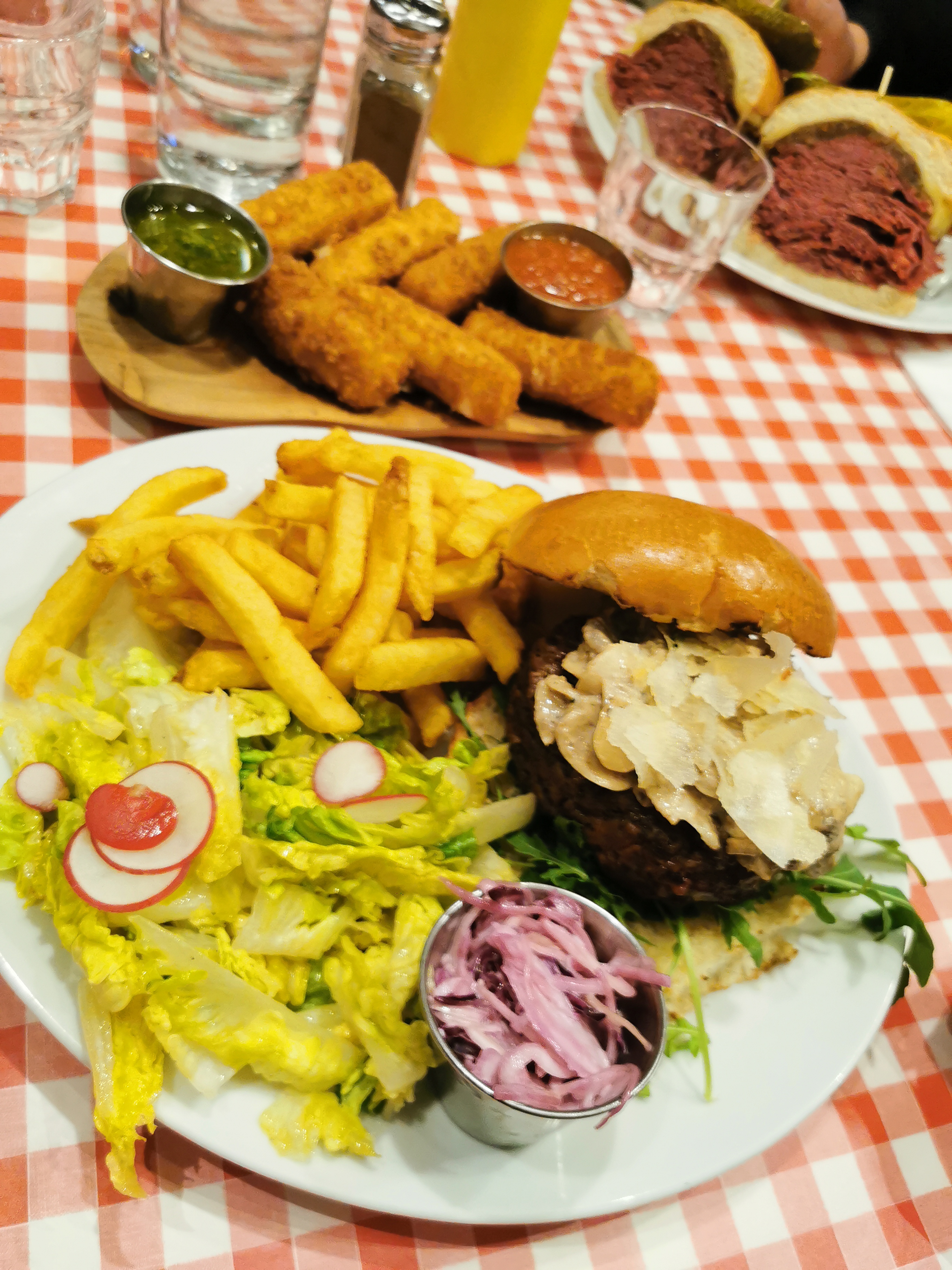 Excellent burger Rossini au porto ! Le steak haché de bœuf est un des plus épais que j'ai vu et on vous demande sa cuisson. C'est très copieux et les frites en accompagnement sont en grande quantité. Burger forestier également très bon, la crème et les champignons en font une combinaison très intéressante. Ce restaurant propose aussi des sandwichs au pastrami, des reubens ou encore des hot-dogs, la carte est très variée. On est un peu serré avec les autres tables mais le service est très rapide et le personnel très convivial. Nous reviendrons avec plaisir pour essayer d'autres choses !