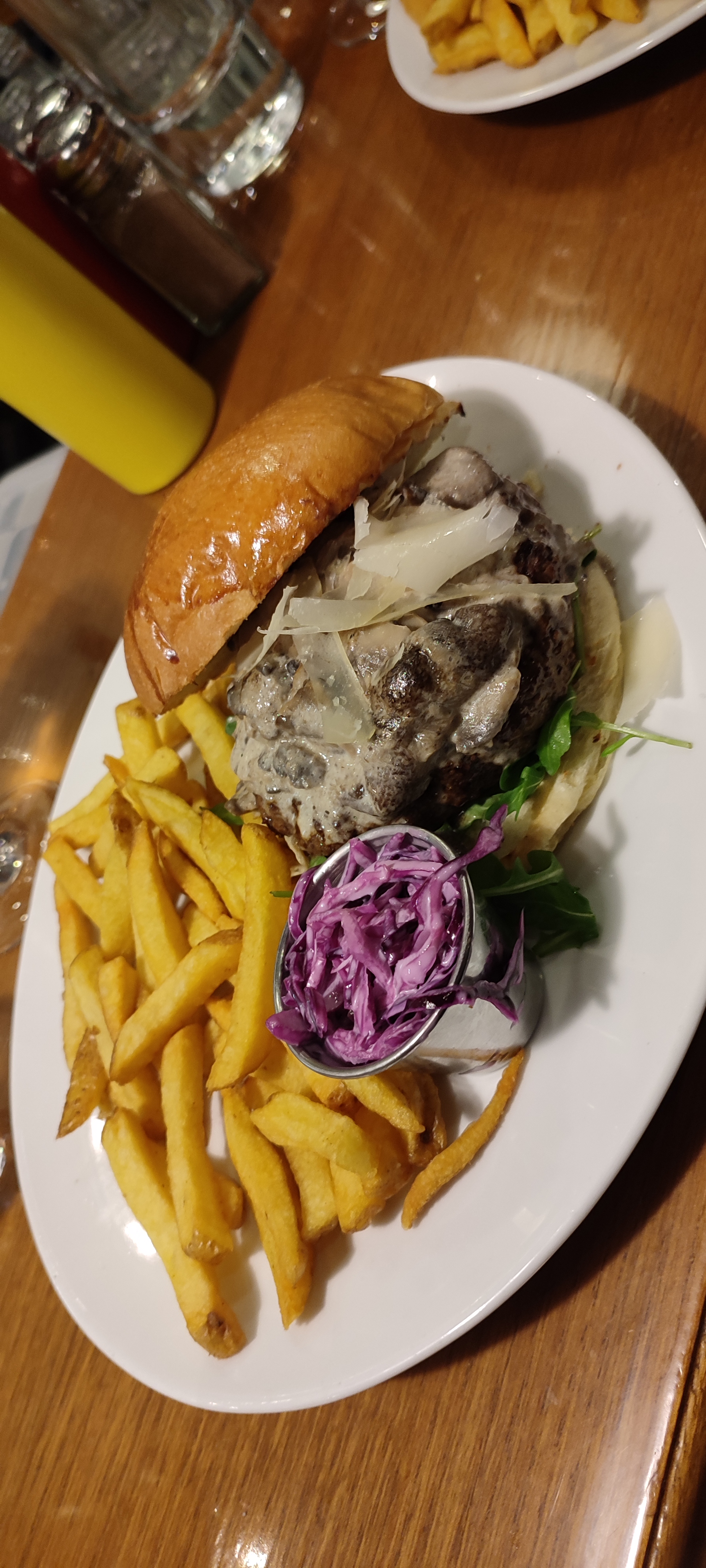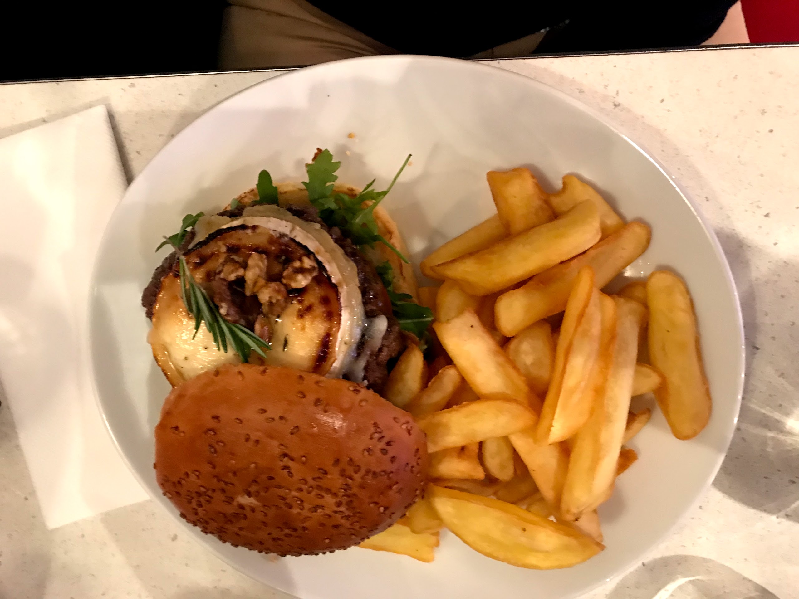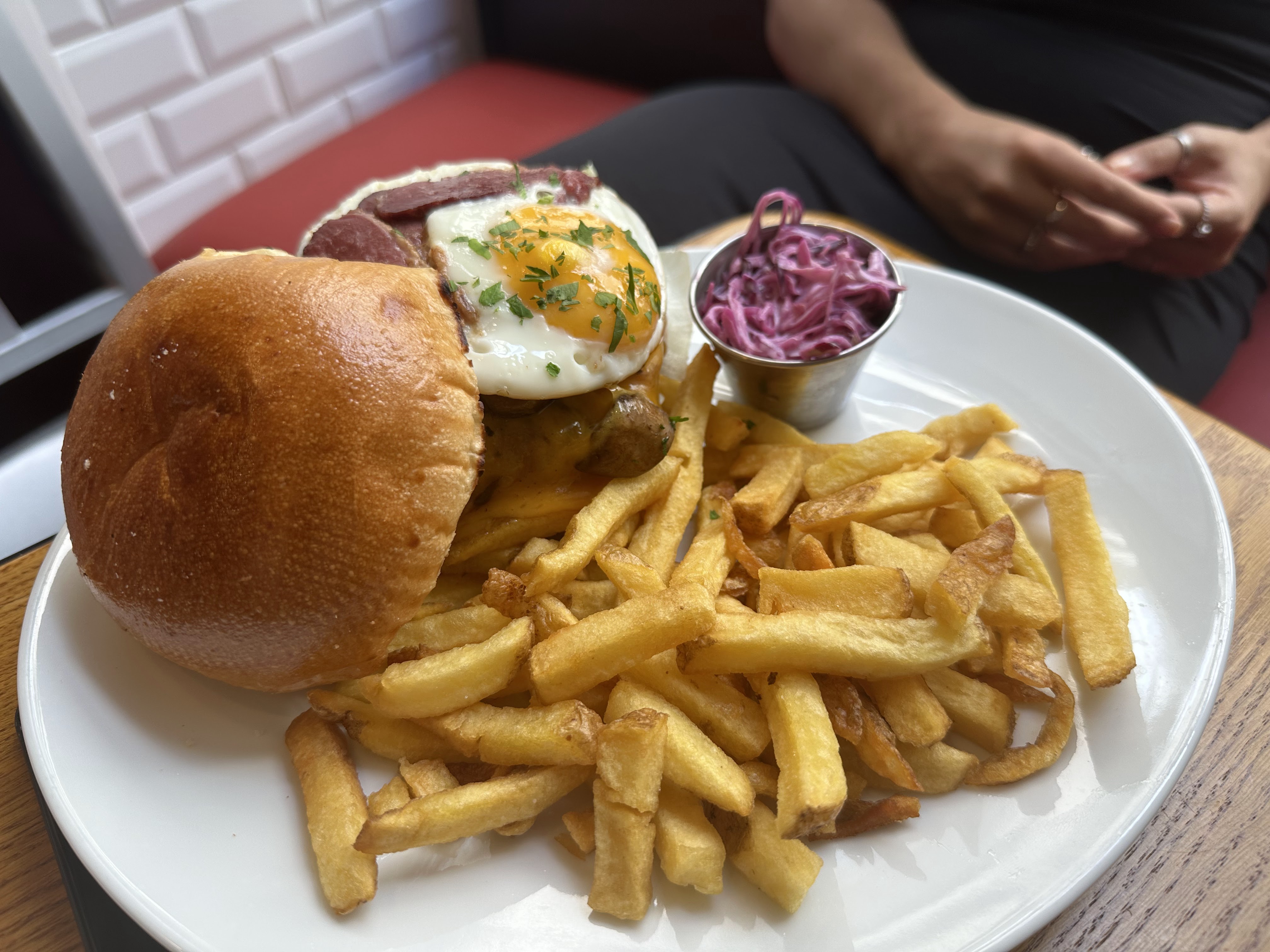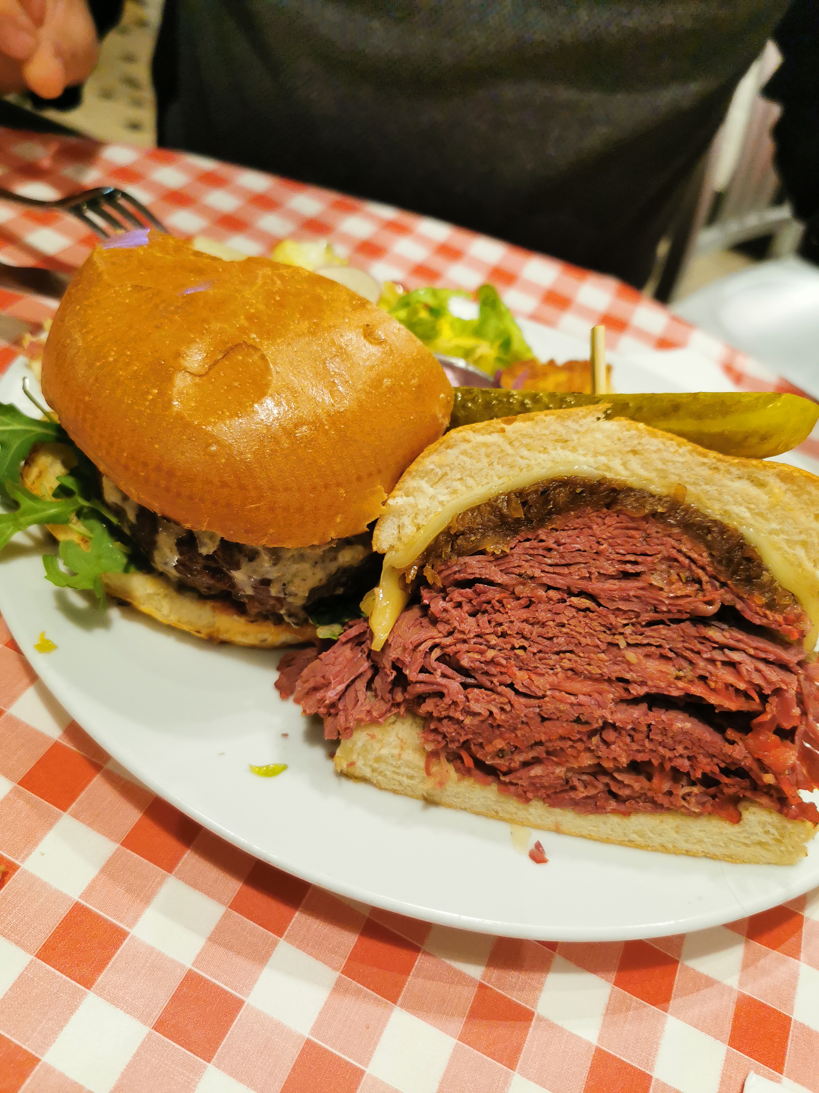 Excellent burger Rossini au porto ! Le steak haché de bœuf est un des plus épais que j'ai vu et on vous demande sa cuisson. C'est très copieux et les frites en accompagnement sont en grande quantité. Burger forestier également très bon, la crème et les champignons en font une combinaison très intéressante. Ce restaurant propose aussi des sandwichs au pastrami, des reubens ou encore des hot-dogs, la carte est très variée. On est un peu serré avec les autres tables mais le service est très rapide et le personnel très convivial. Nous reviendrons avec plaisir pour essayer d'autres choses !