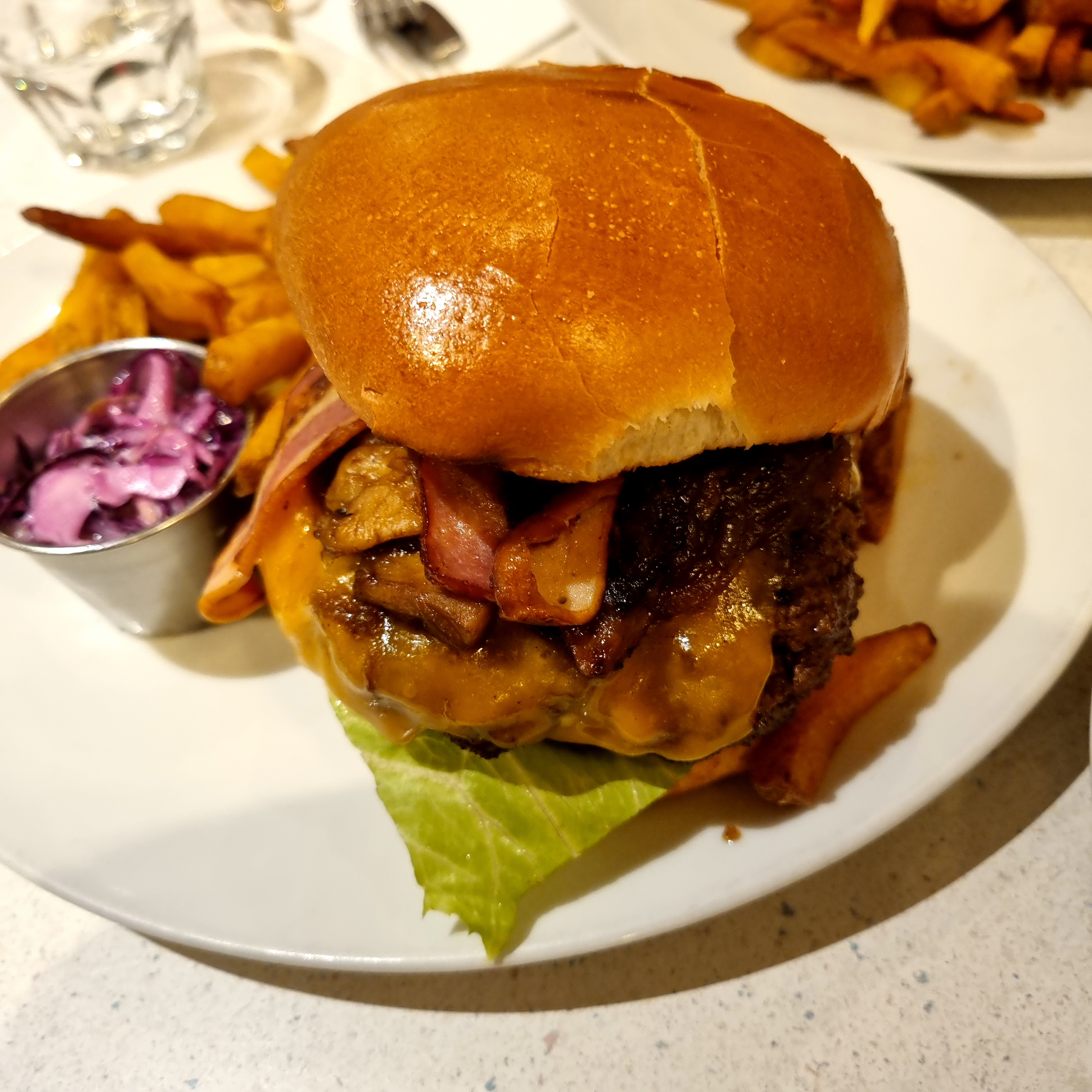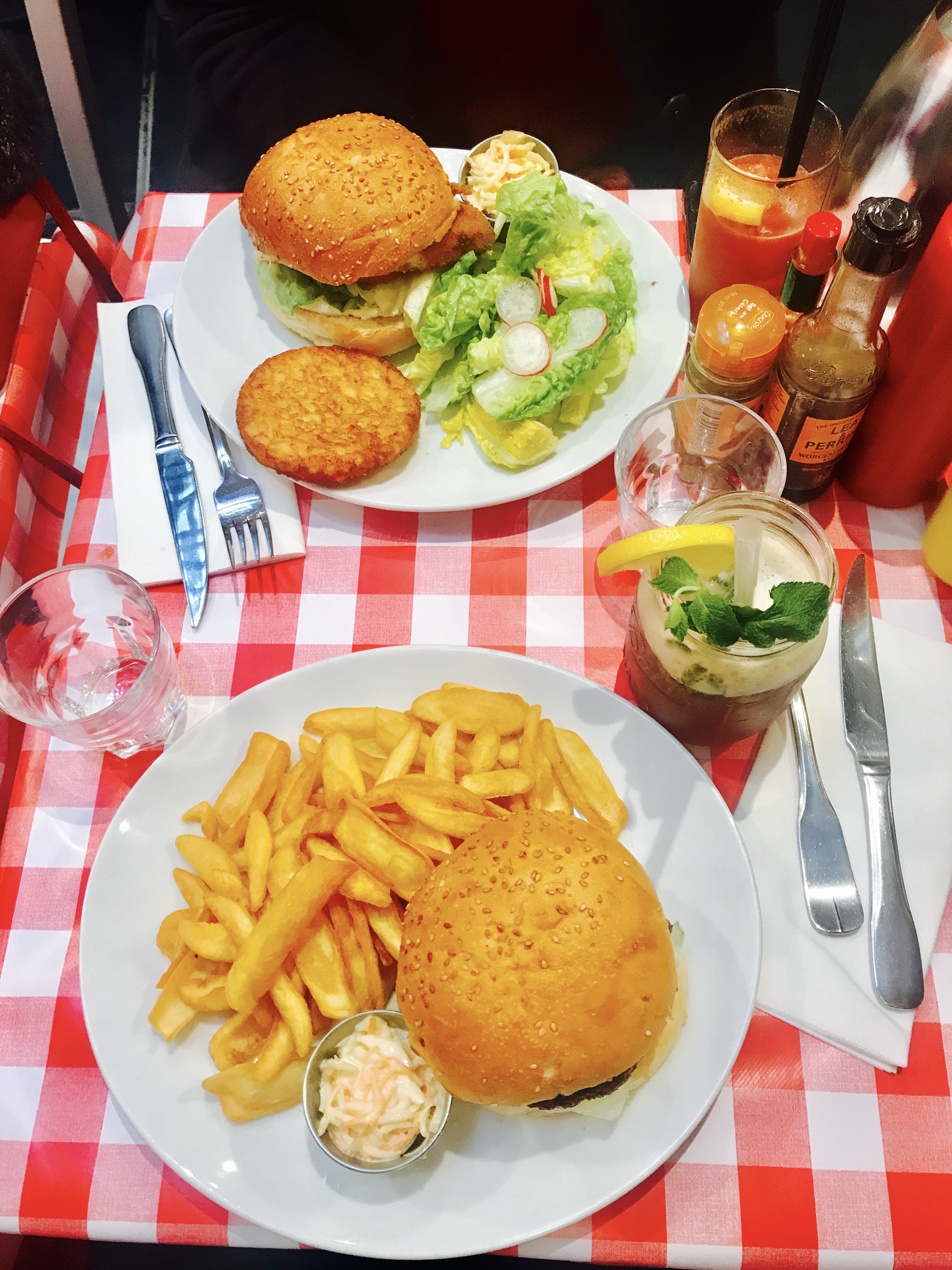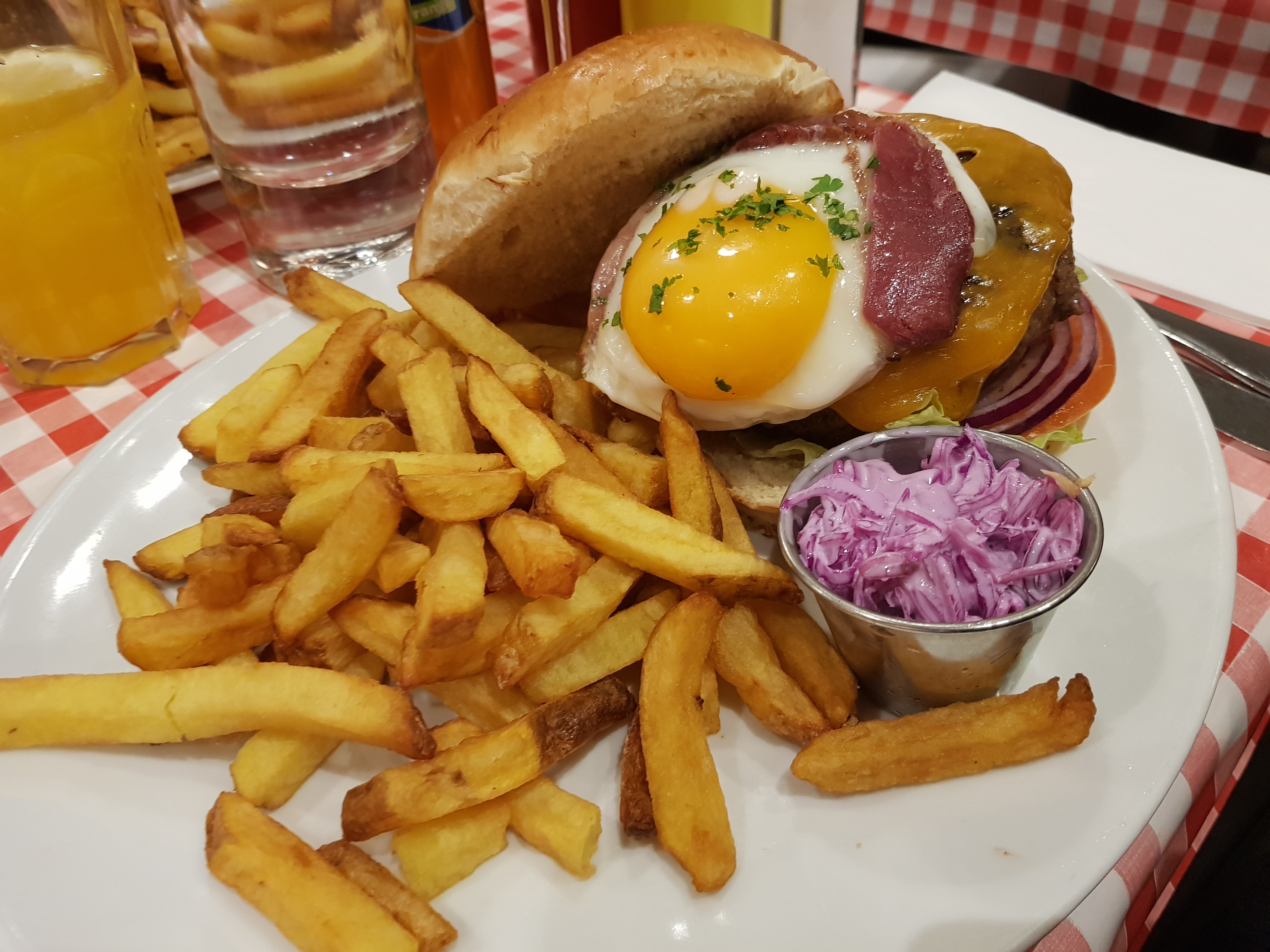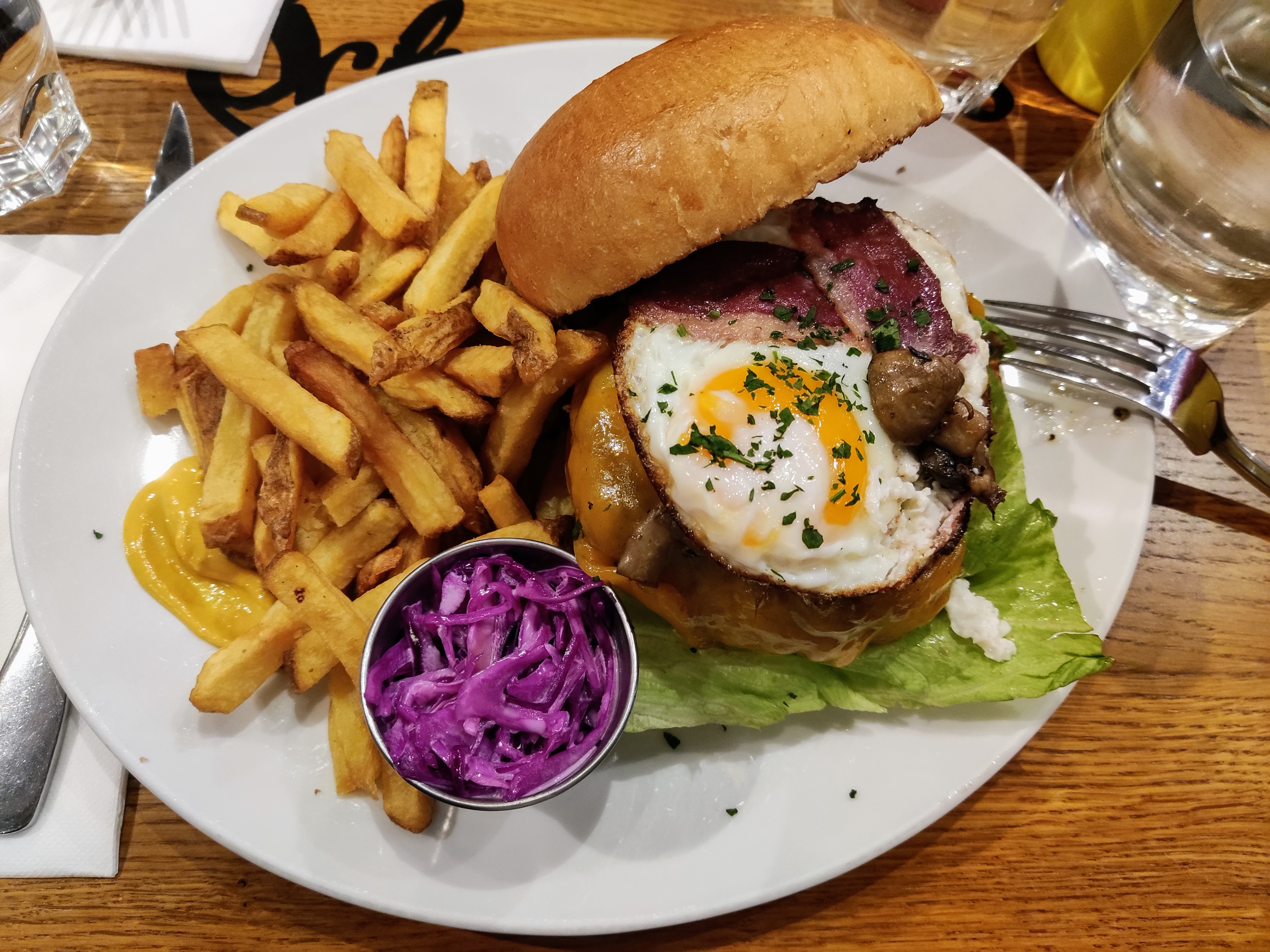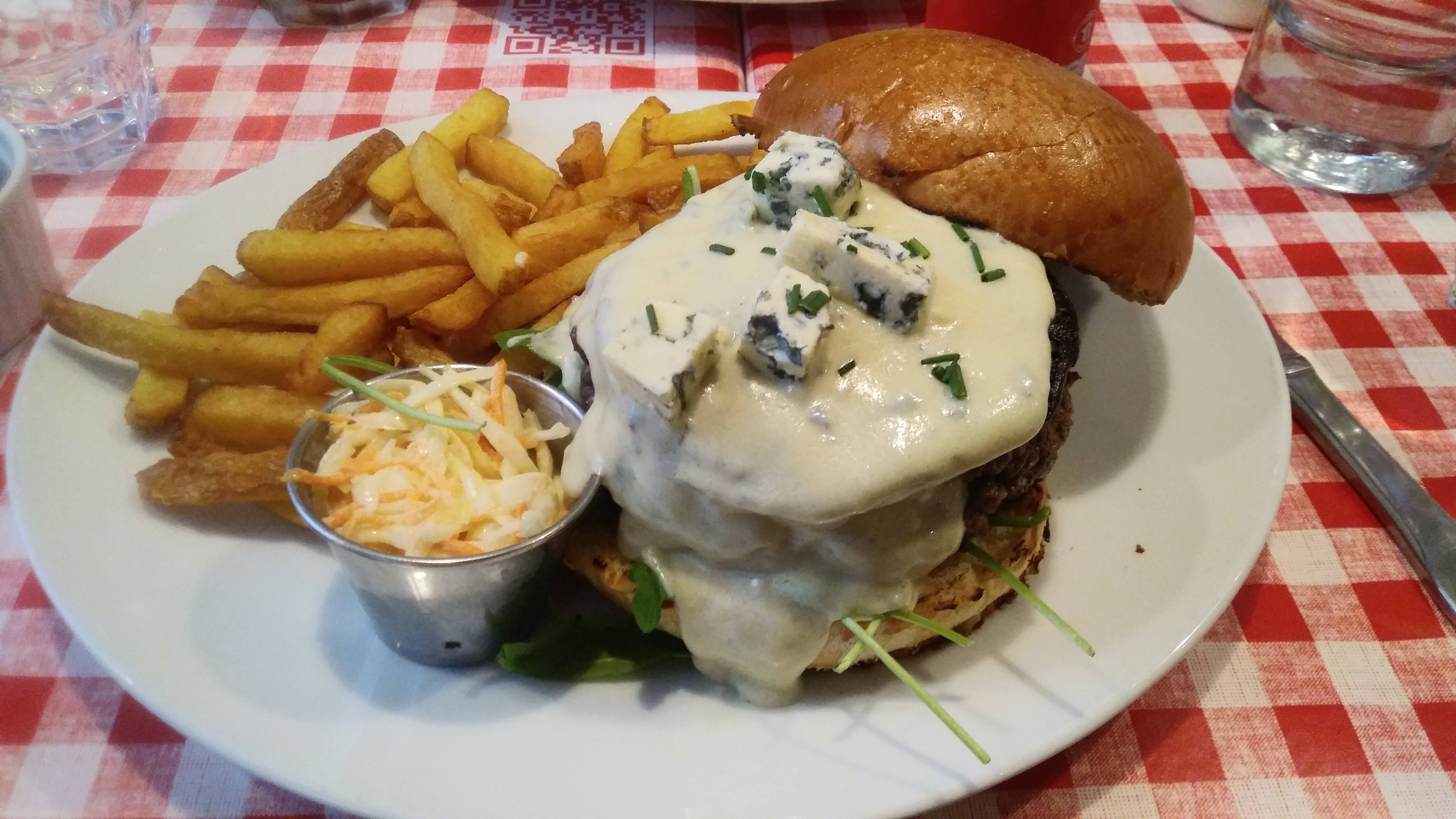 Excellent burger Rossini au porto ! Le steak haché de bœuf est un des plus épais que j'ai vu et on vous demande sa cuisson. C'est très copieux et les frites en accompagnement sont en grande quantité. Burger forestier également très bon, la crème et les champignons en font une combinaison très intéressante. Ce restaurant propose aussi des sandwichs au pastrami, des reubens ou encore des hot-dogs, la carte est très variée. On est un peu serré avec les autres tables mais le service est très rapide et le personnel très convivial. Nous reviendrons avec plaisir pour essayer d'autres choses !