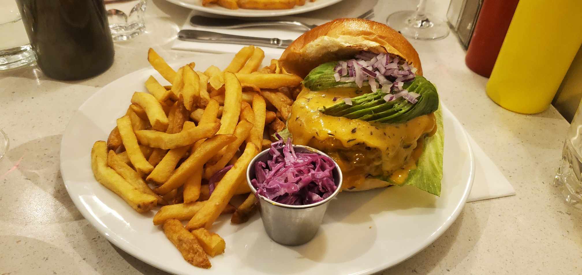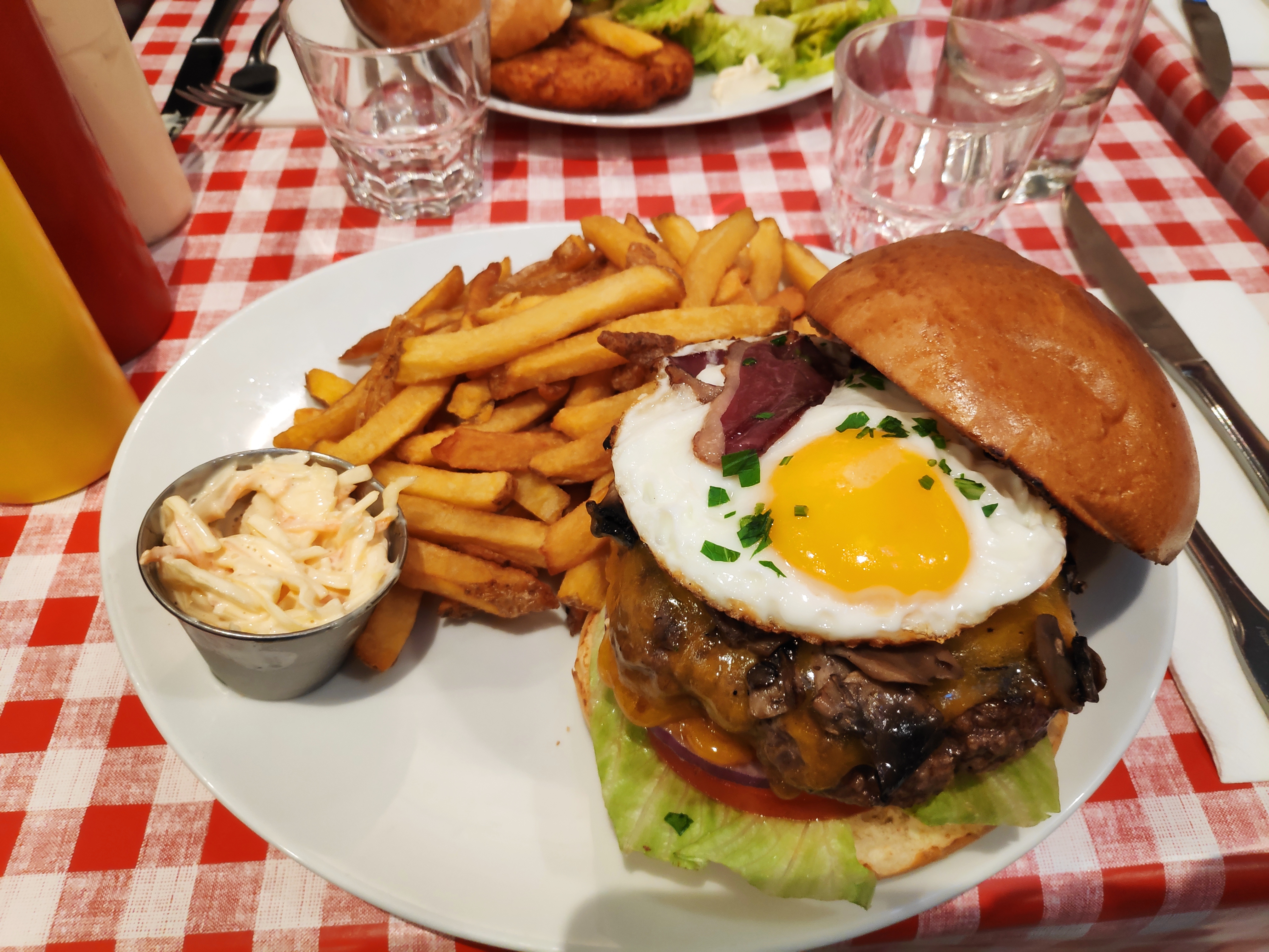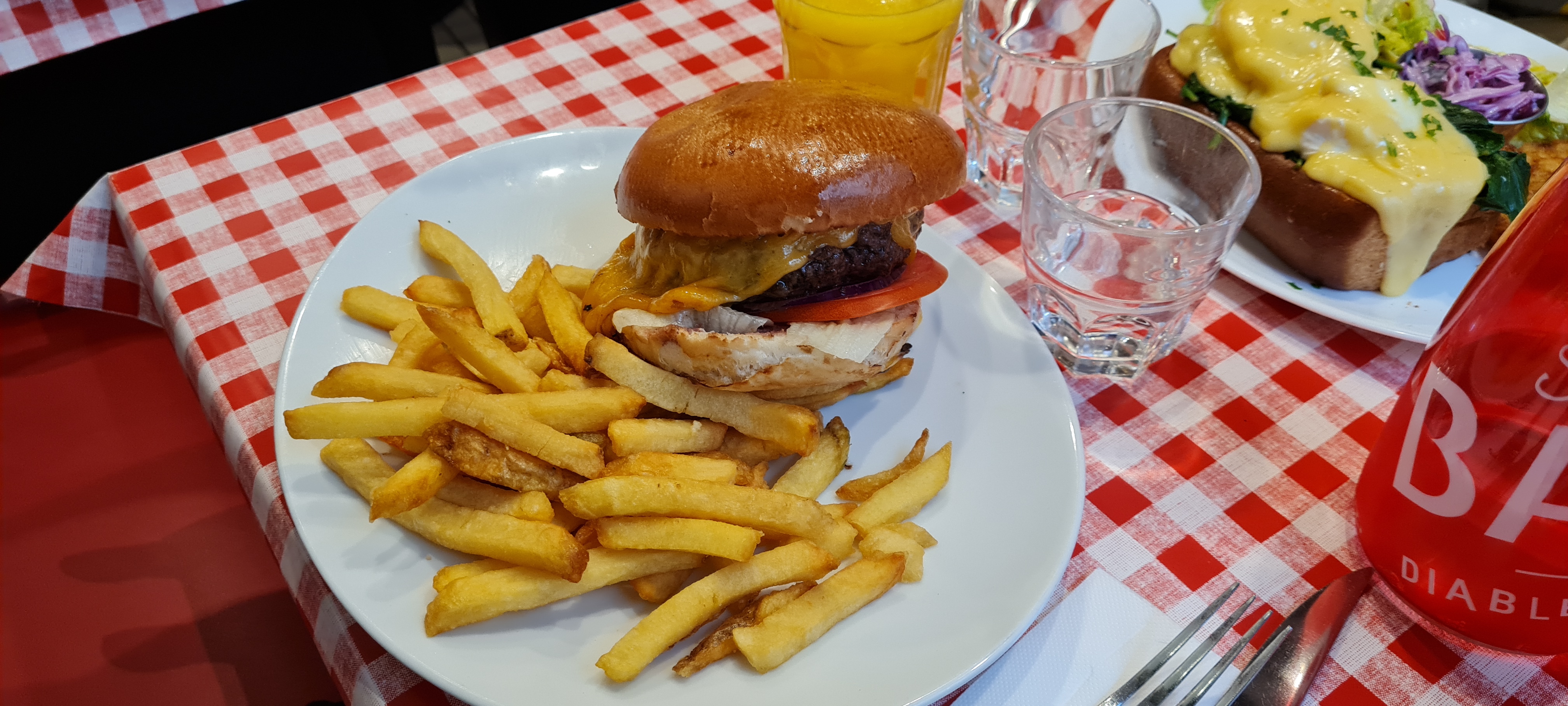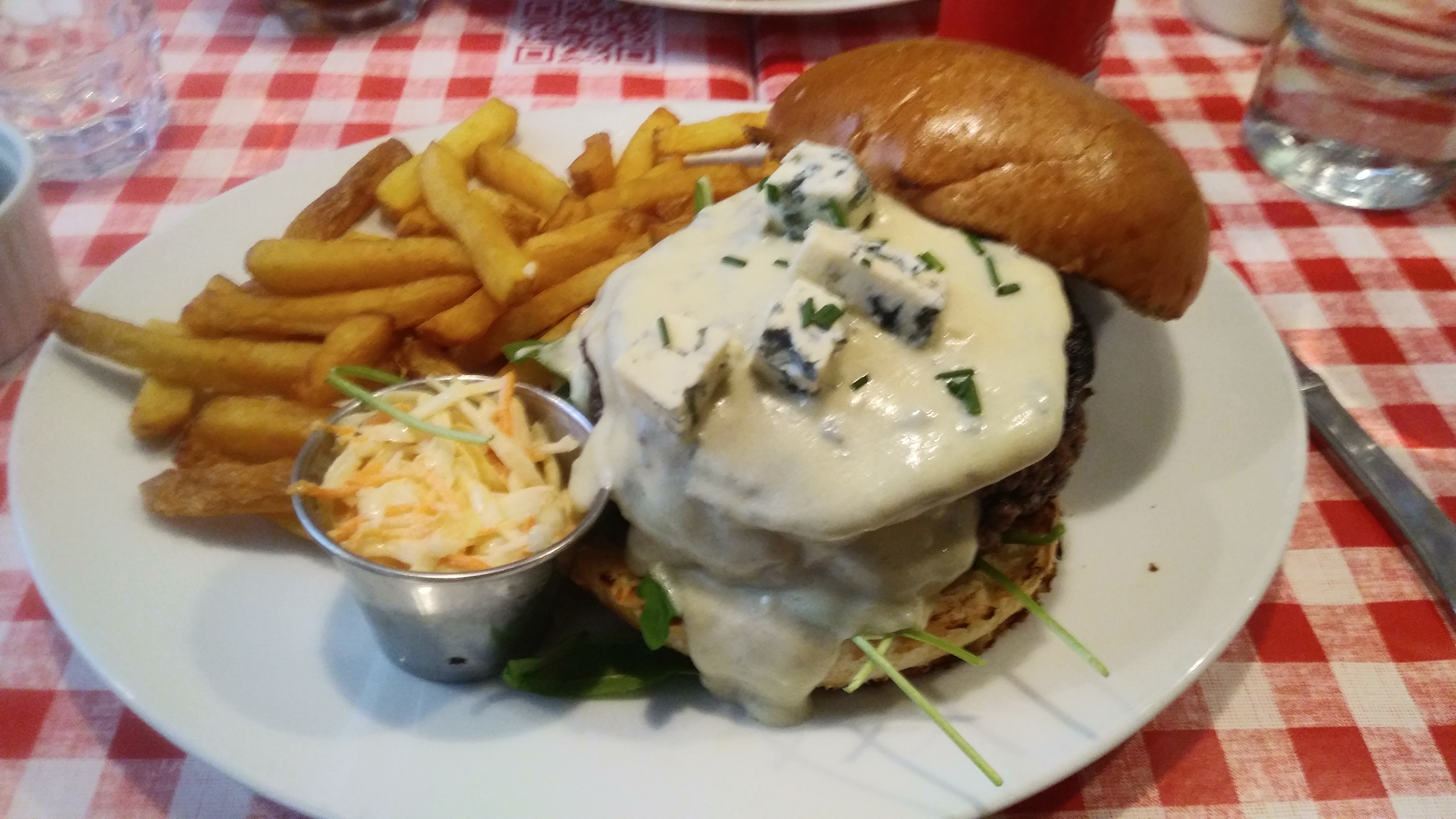 Excellent burger Rossini au porto ! Le steak haché de bœuf est un des plus épais que j'ai vu et on vous demande sa cuisson. C'est très copieux et les frites en accompagnement sont en grande quantité. Burger forestier également très bon, la crème et les champignons en font une combinaison très intéressante. Ce restaurant propose aussi des sandwichs au pastrami, des reubens ou encore des hot-dogs, la carte est très variée. On est un peu serré avec les autres tables mais le service est très rapide et le personnel très convivial. Nous reviendrons avec plaisir pour essayer d'autres choses !
