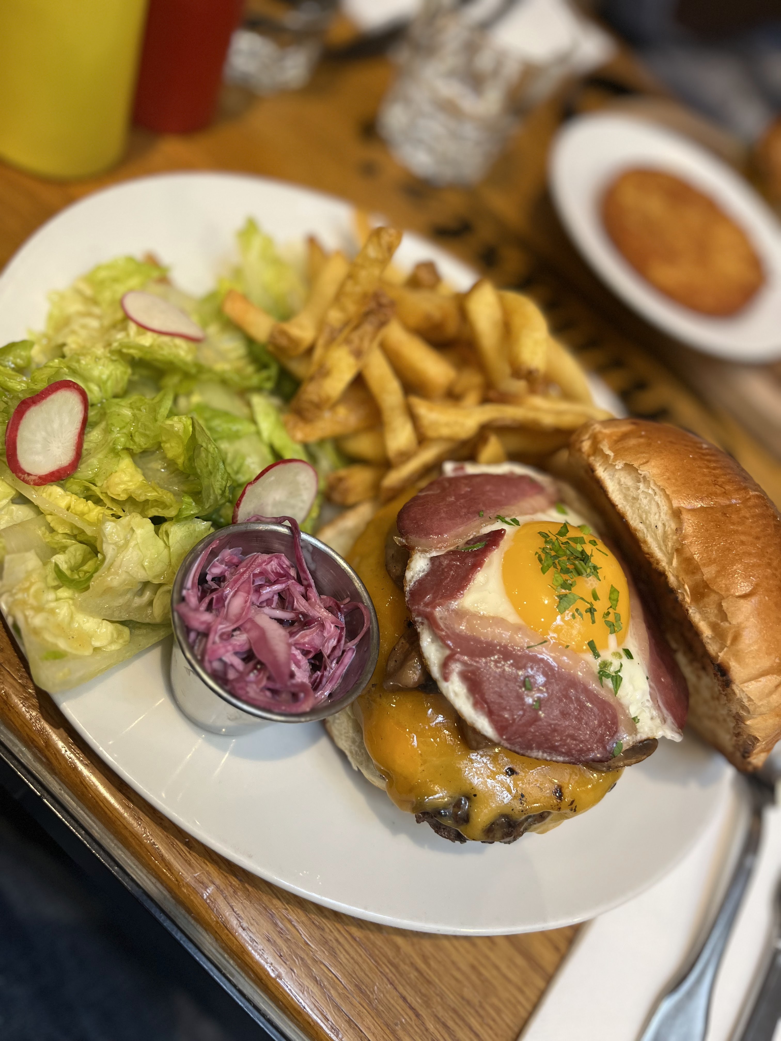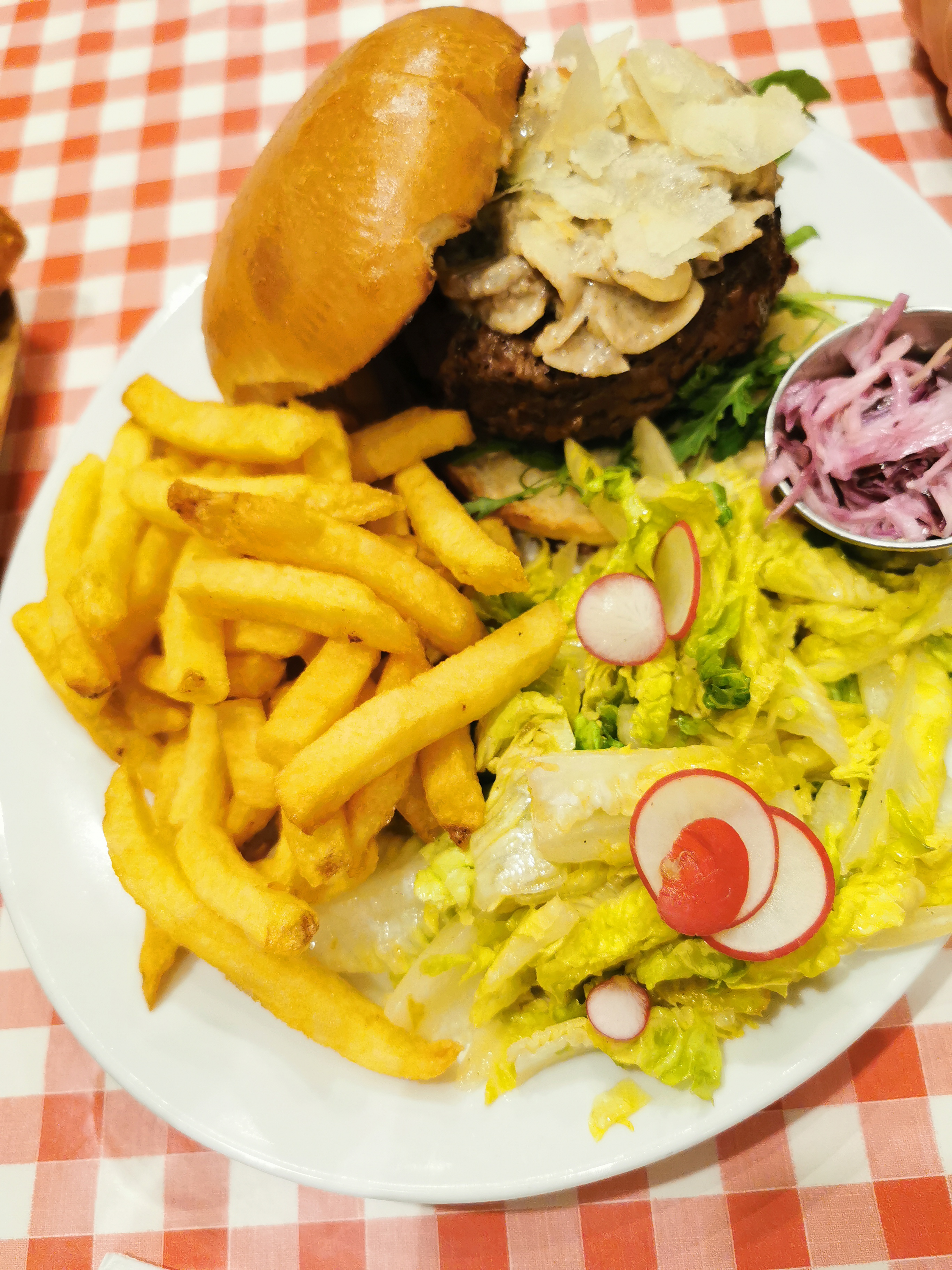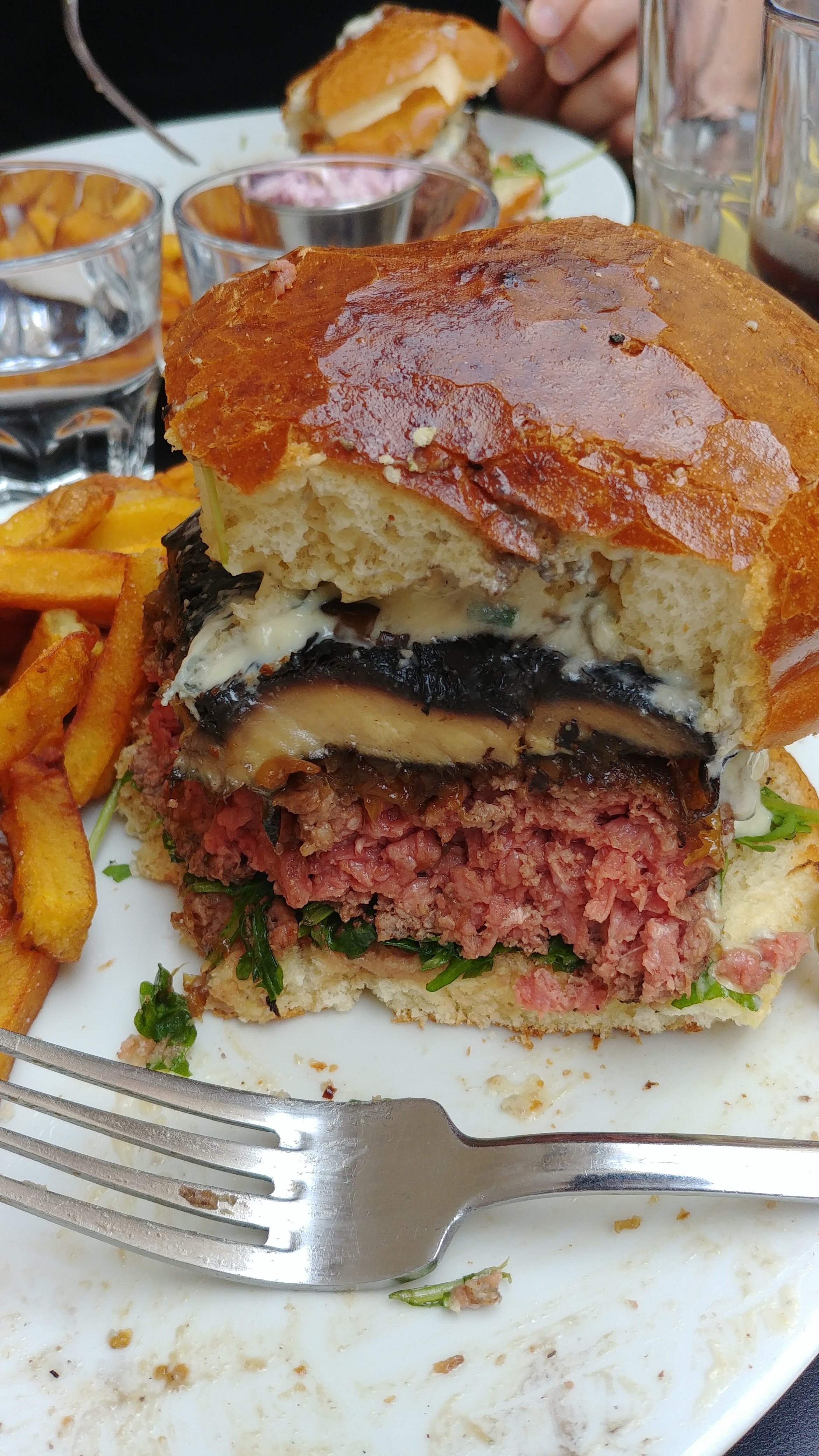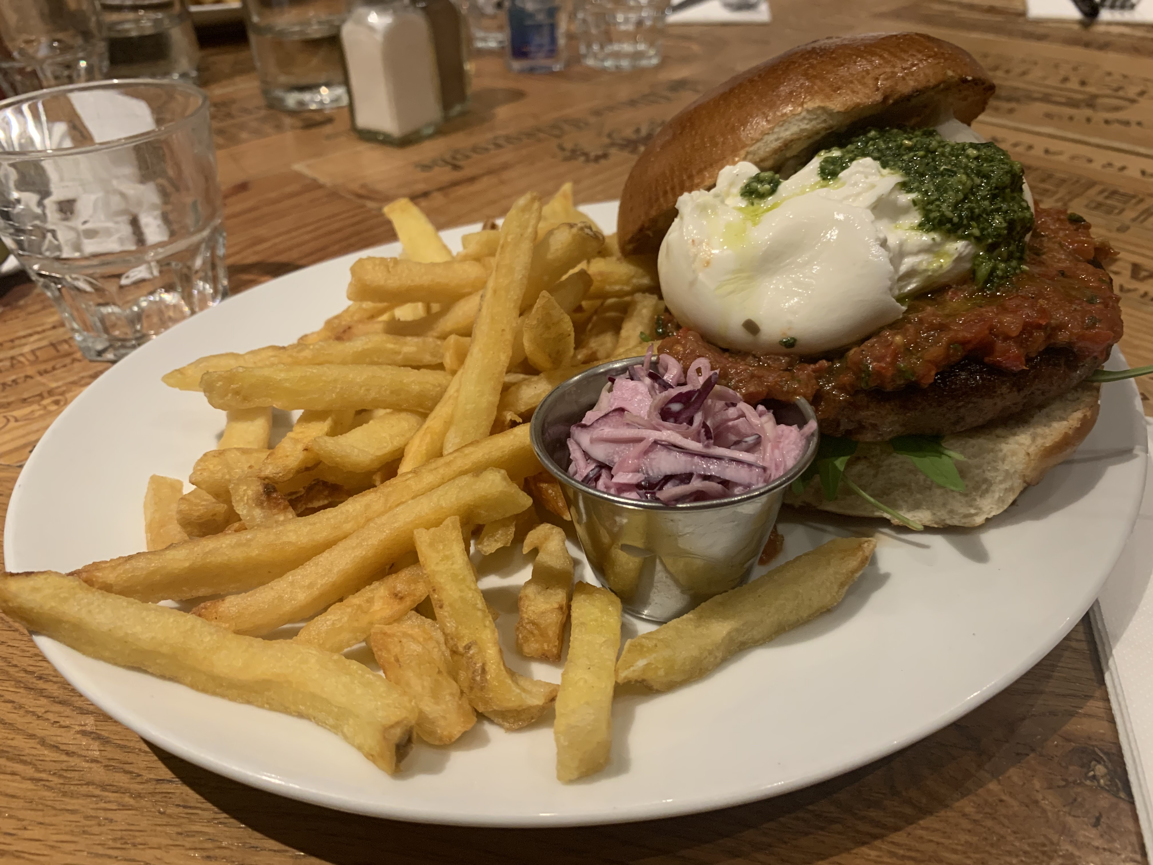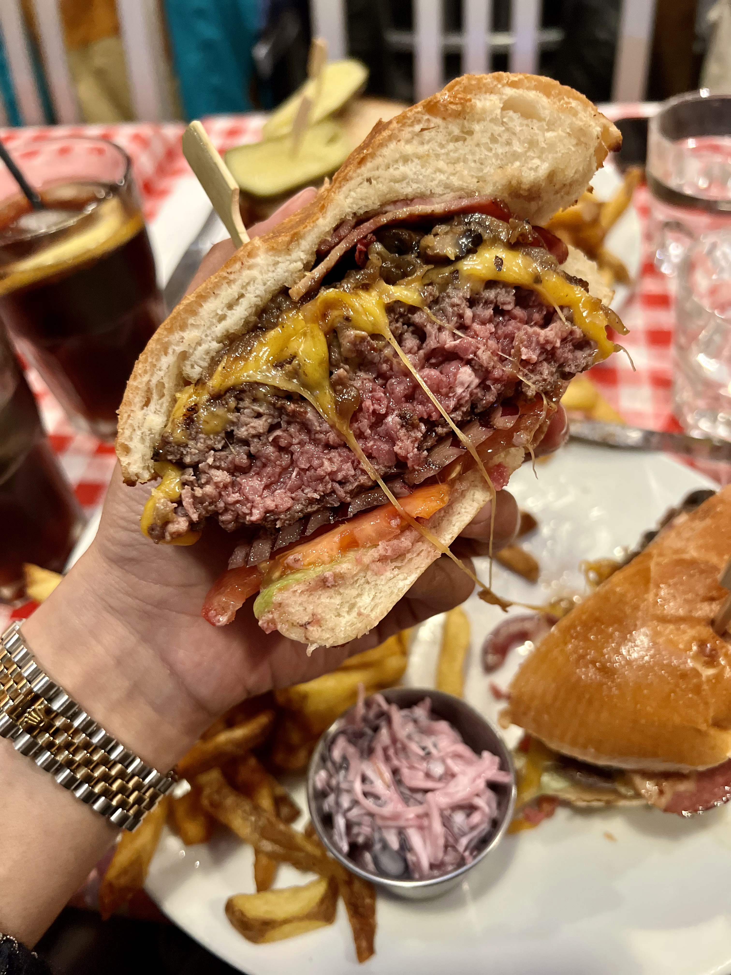 Excellent burger Rossini au porto ! Le steak haché de bœuf est un des plus épais que j'ai vu et on vous demande sa cuisson. C'est très copieux et les frites en accompagnement sont en grande quantité. Burger forestier également très bon, la crème et les champignons en font une combinaison très intéressante. Ce restaurant propose aussi des sandwichs au pastrami, des reubens ou encore des hot-dogs, la carte est très variée. On est un peu serré avec les autres tables mais le service est très rapide et le personnel très convivial. Nous reviendrons avec plaisir pour essayer d'autres choses !