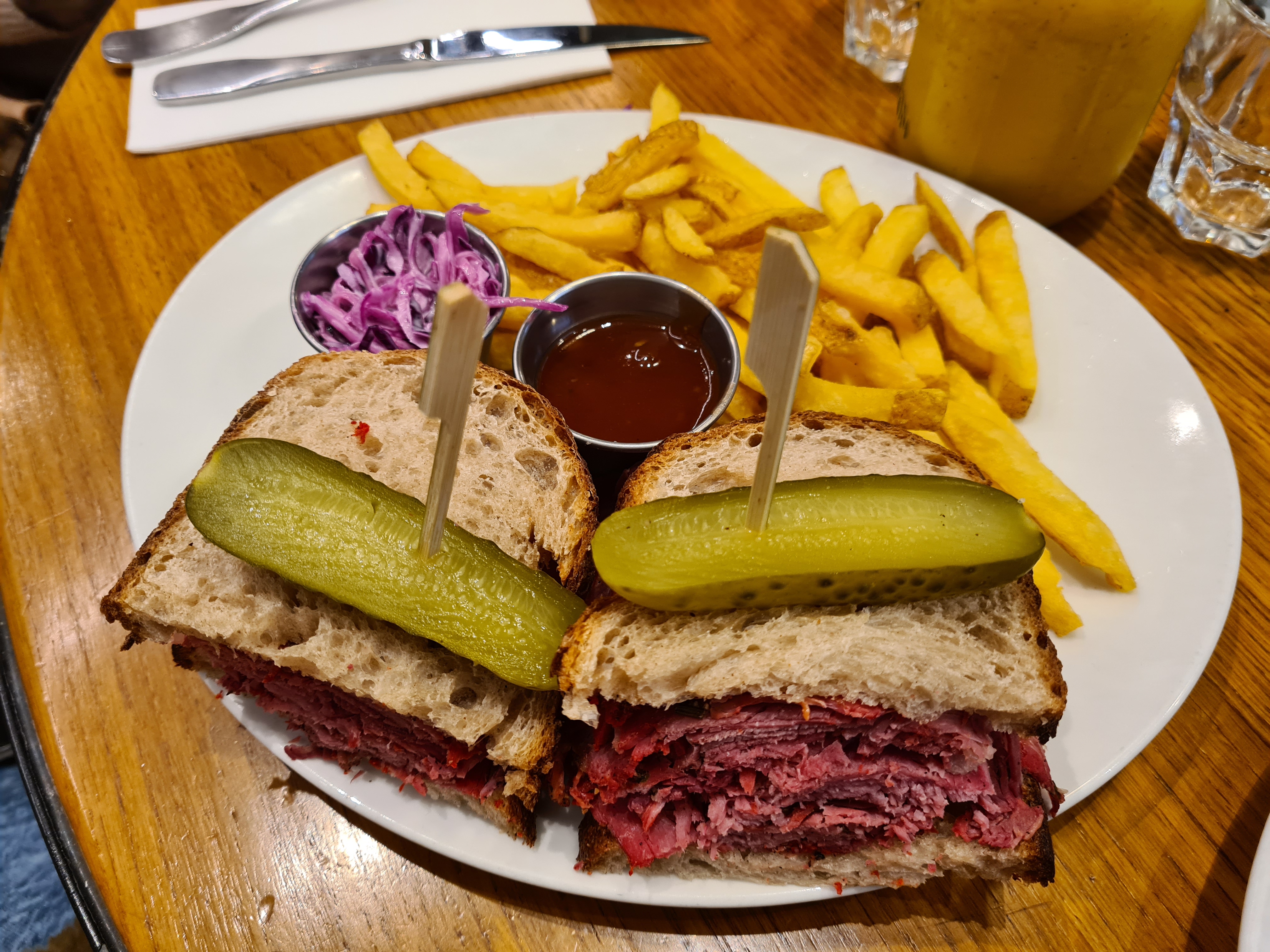 Sandwich au pastrami bourratif et sans travail de cuisine : des tranches de pastrami empilées entre 2 tranches de pain de campagne. Accompagnement : bonnes frites, 1 cornichon, un peu de sauce barbecue et beaucoup trop peu de salade de chou. Certes on est rassasié mais le sandwich est beaucoup trop sec et écoeurant /quantité de viande. Trop de plats repartent sans être terminés. Petite faim s'abstenir. Service sympathique et rapide.