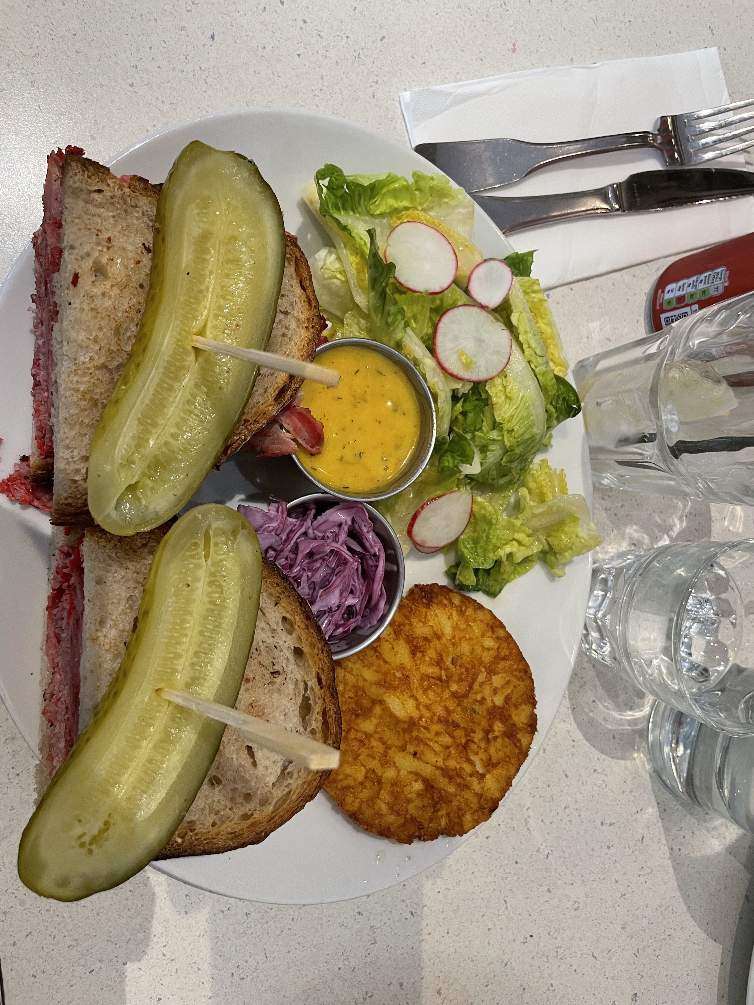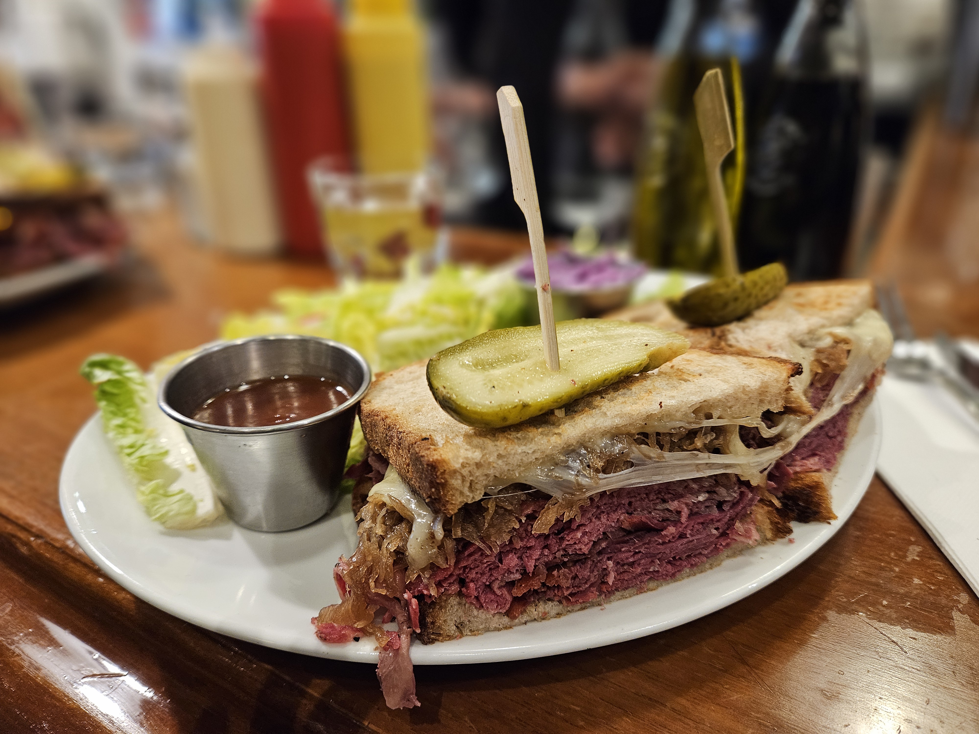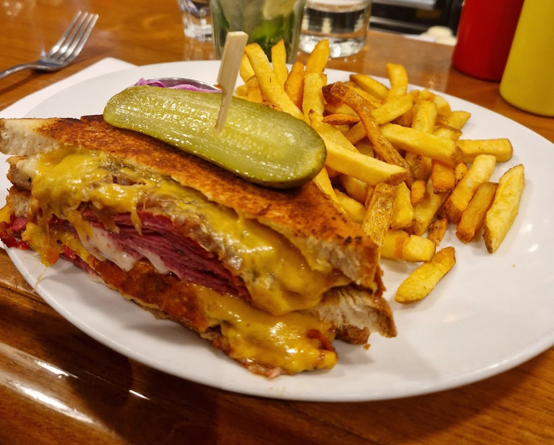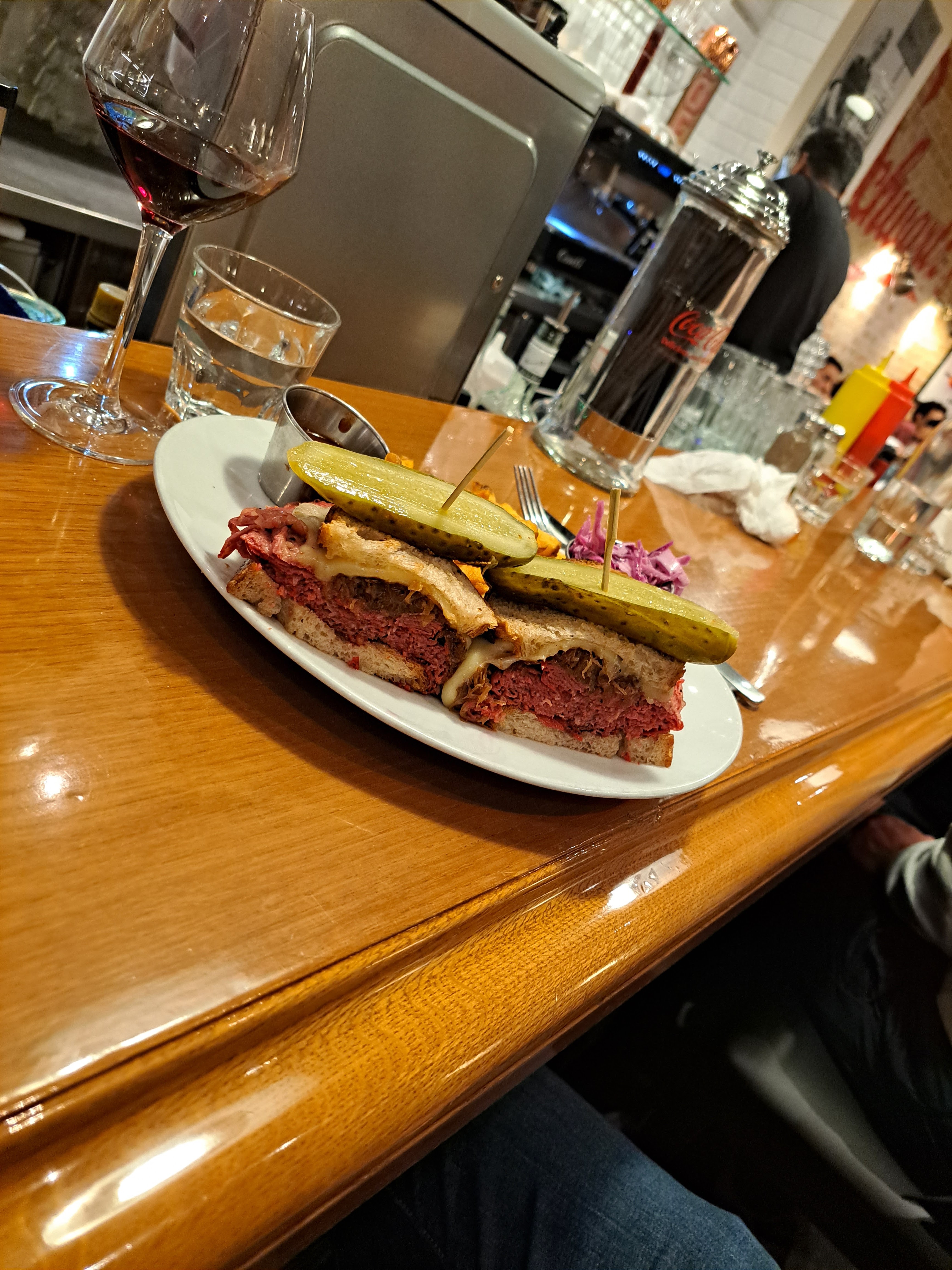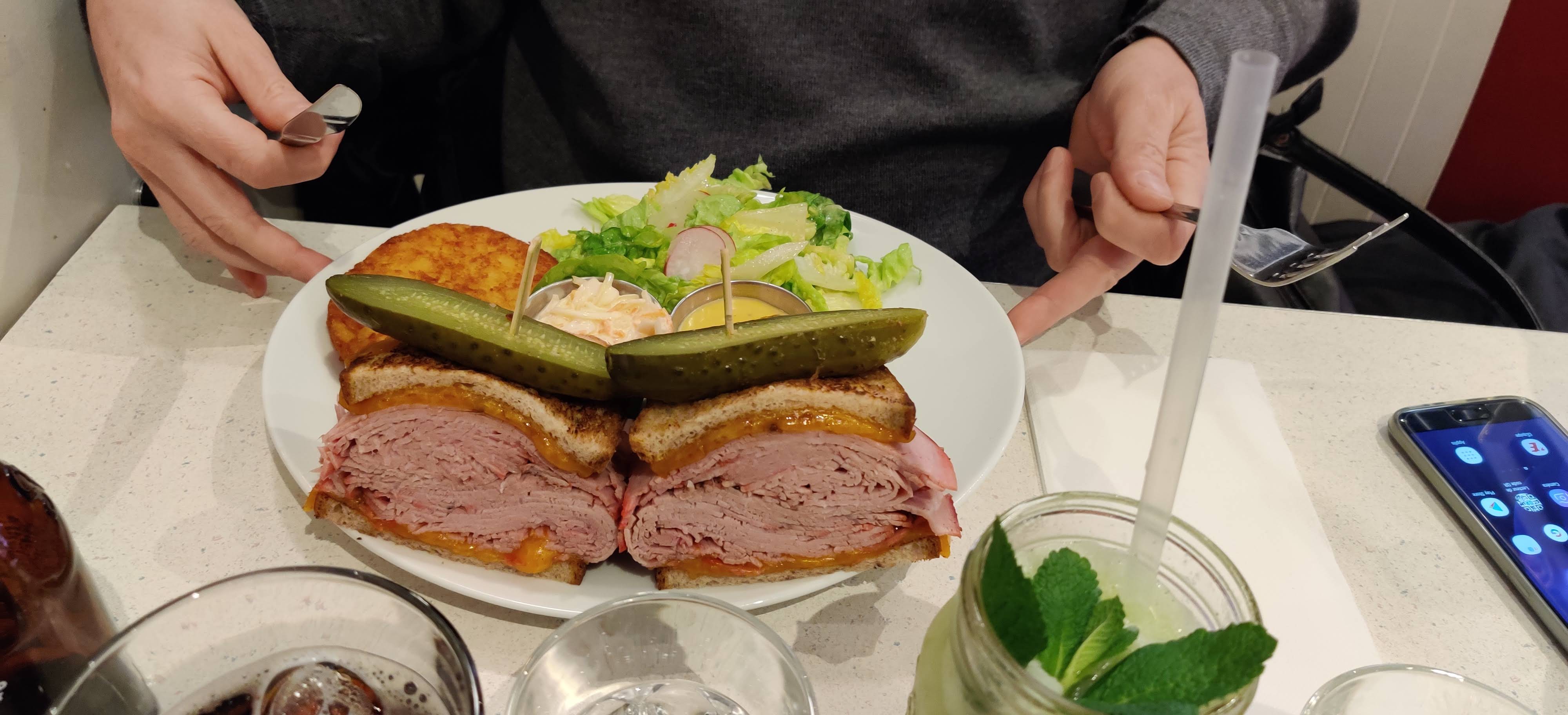 Très bon sandwiches, en particulier le Reuben. Très savoureux, mais vraiment beaucoup trop copieux ! La moitié aurait largement été suffisante, c’est dommage! La prochaine fois on combinera salade et sandwich. Service au top, bien que ce soit la Grande affluence.