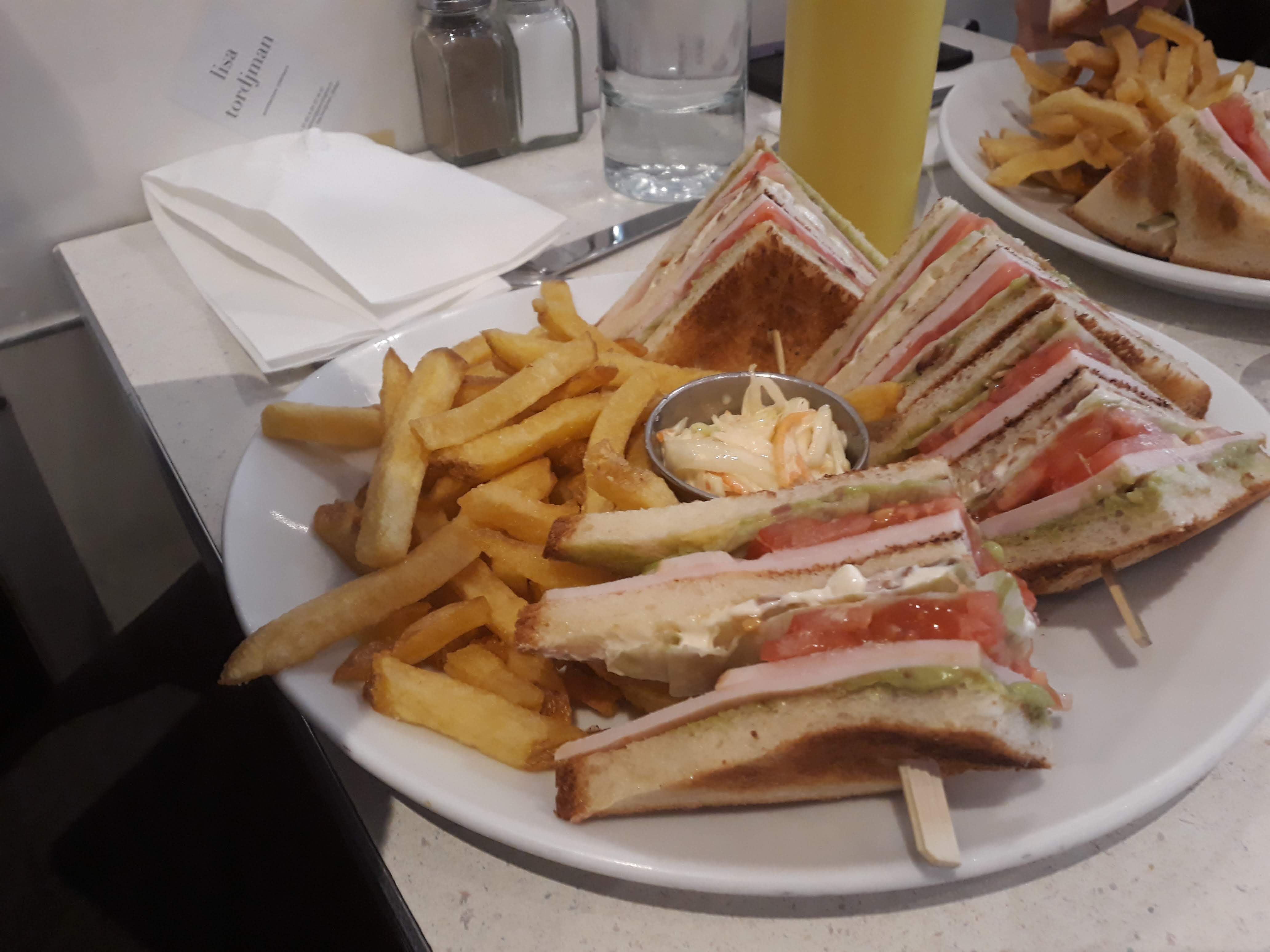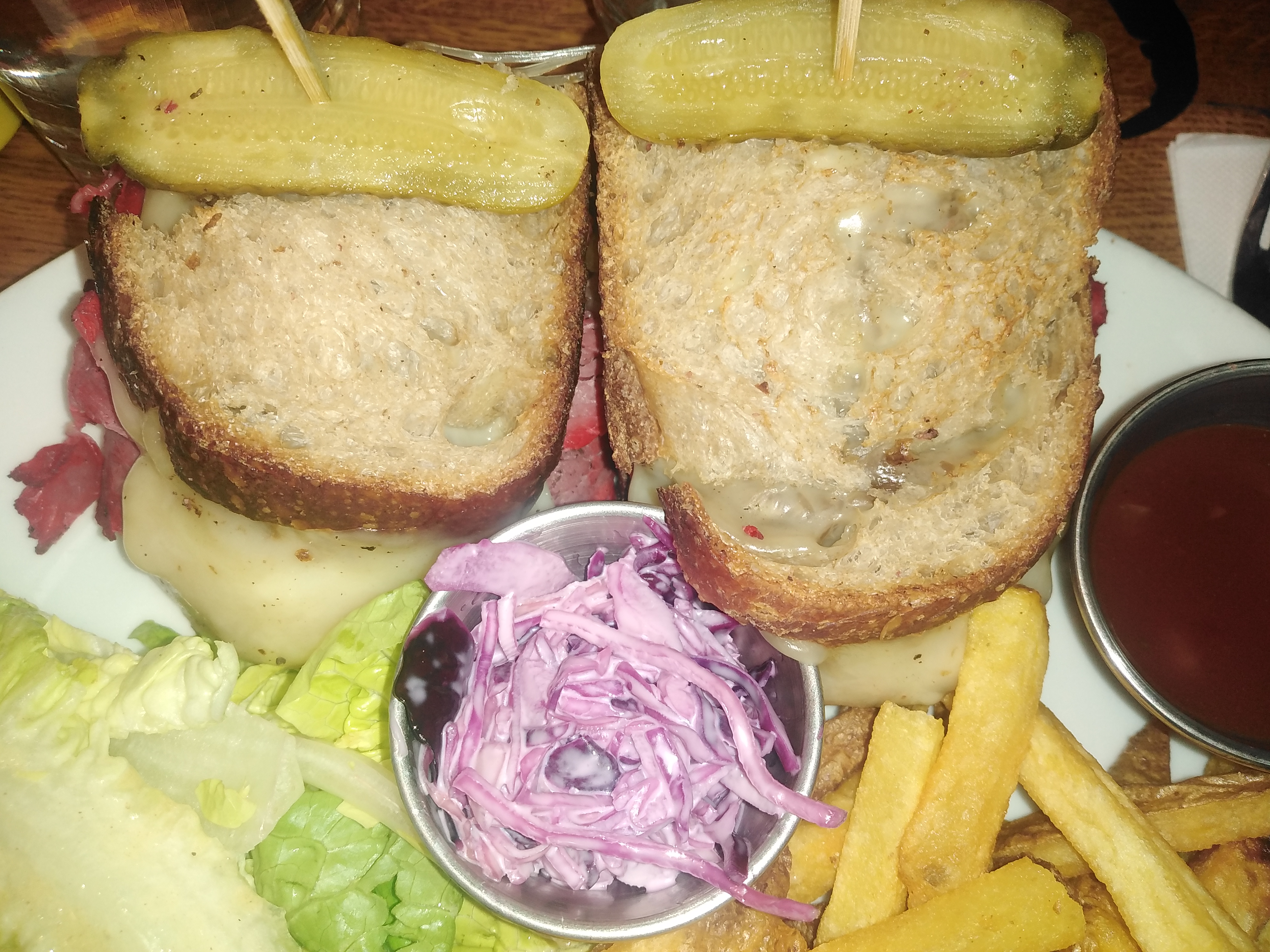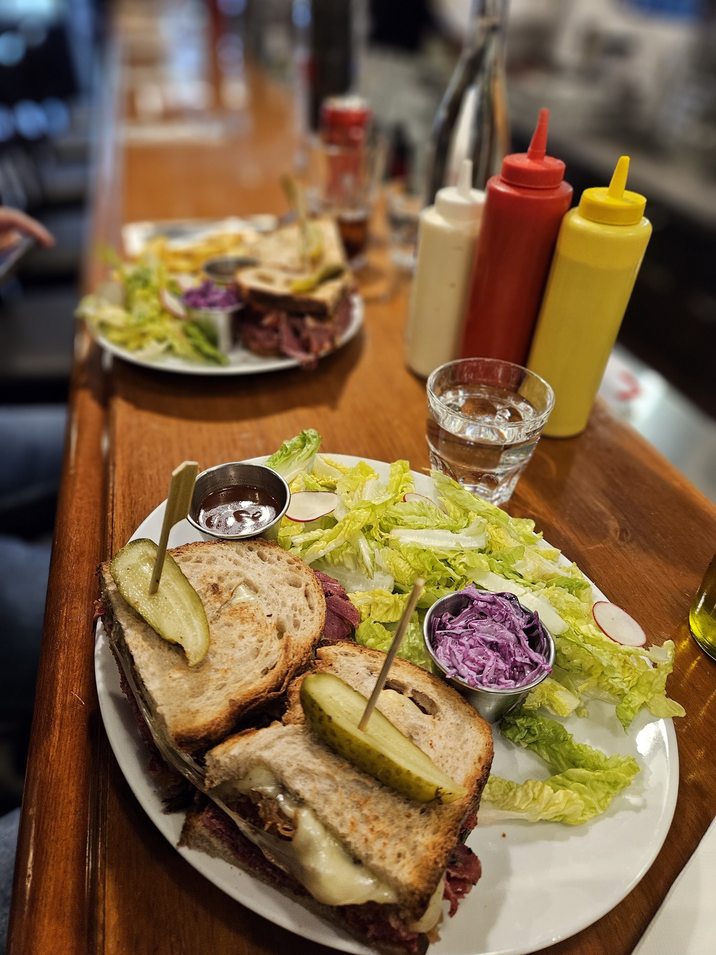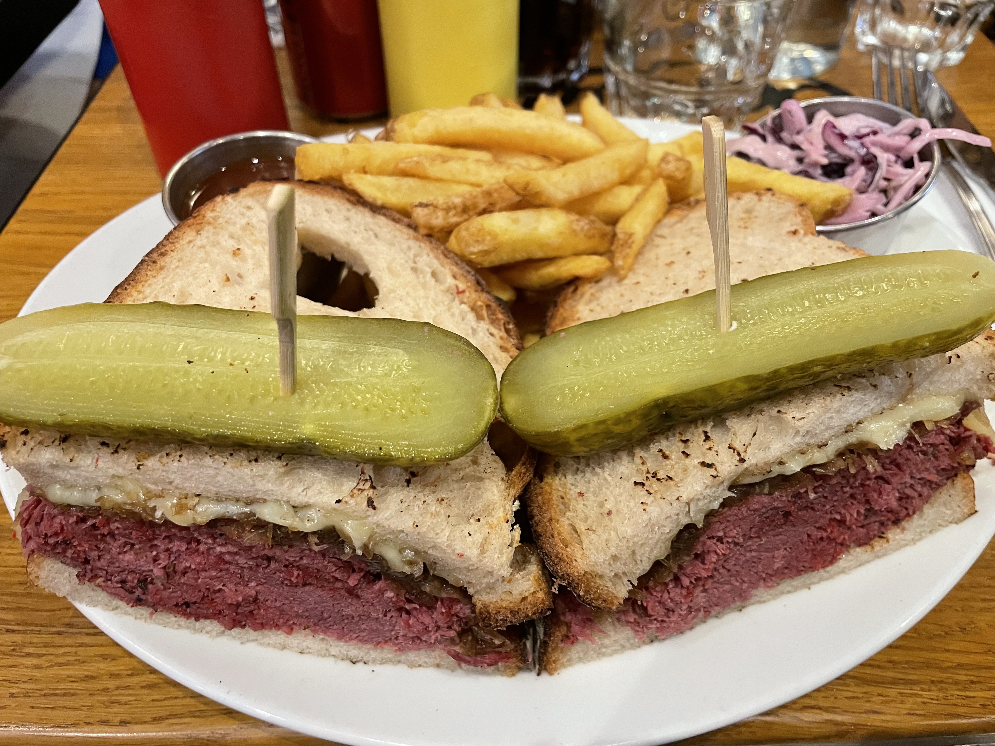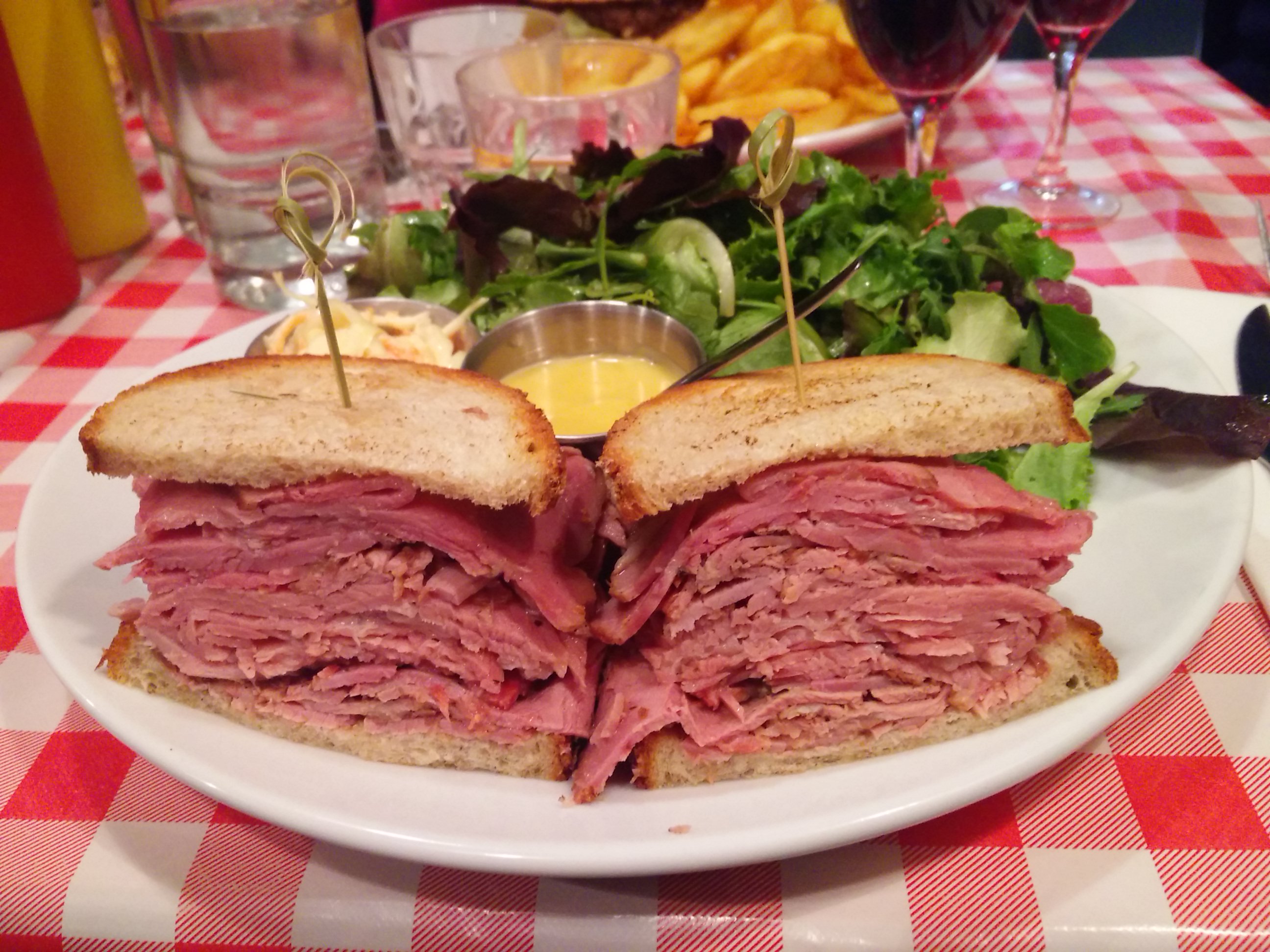 Très bon sandwiches, en particulier le Reuben. Très savoureux, mais vraiment beaucoup trop copieux ! La moitié aurait largement été suffisante, c’est dommage! La prochaine fois on combinera salade et sandwich. Service au top, bien que ce soit la Grande affluence.