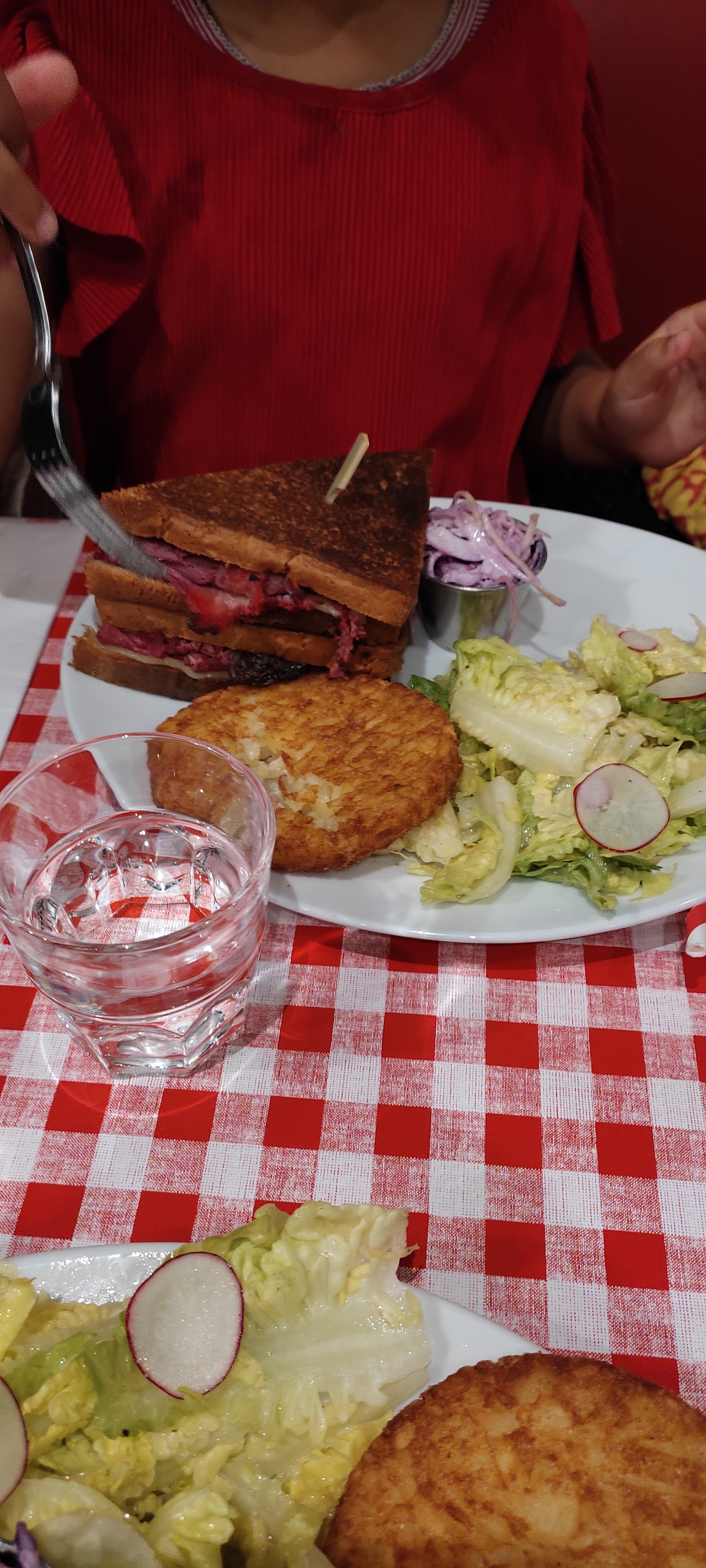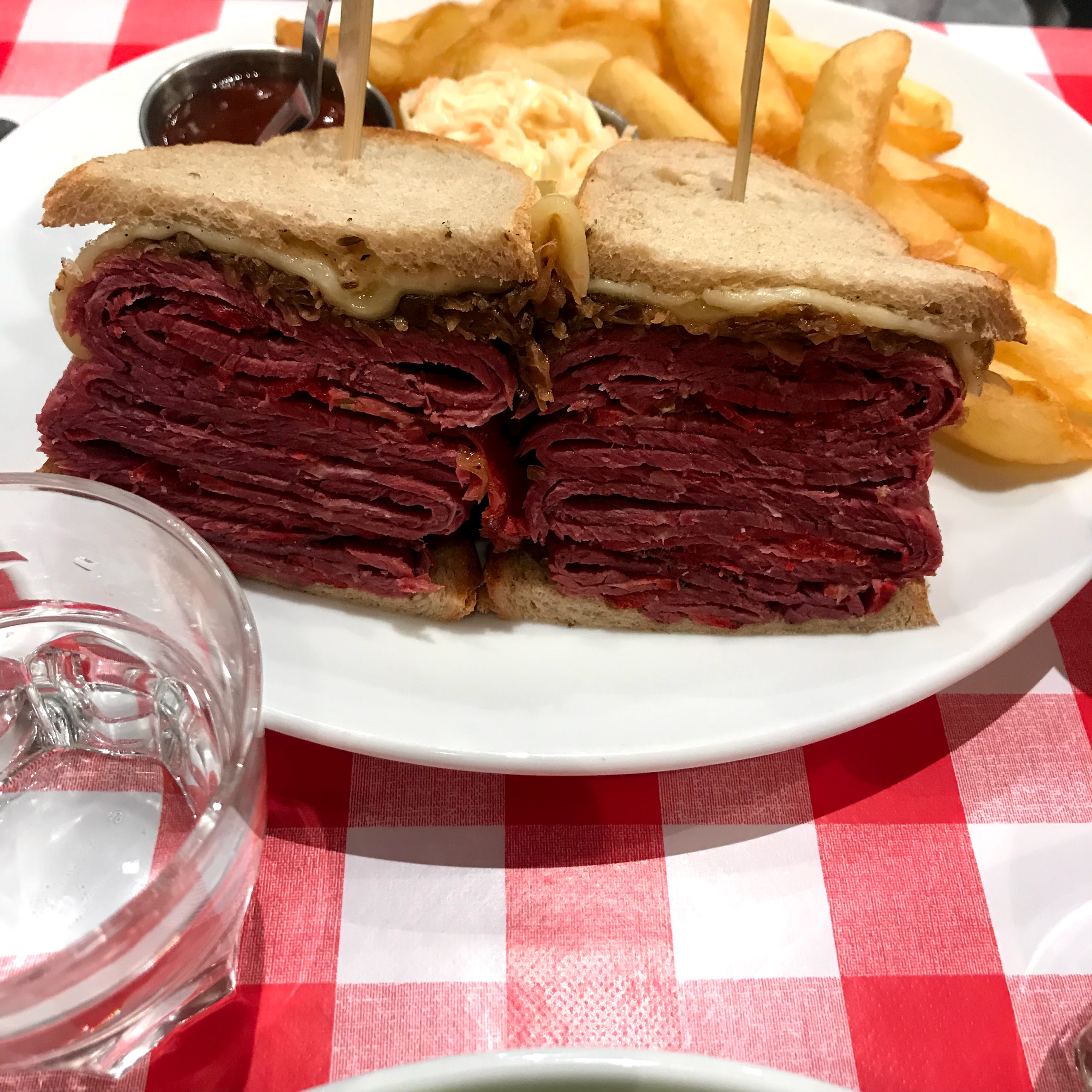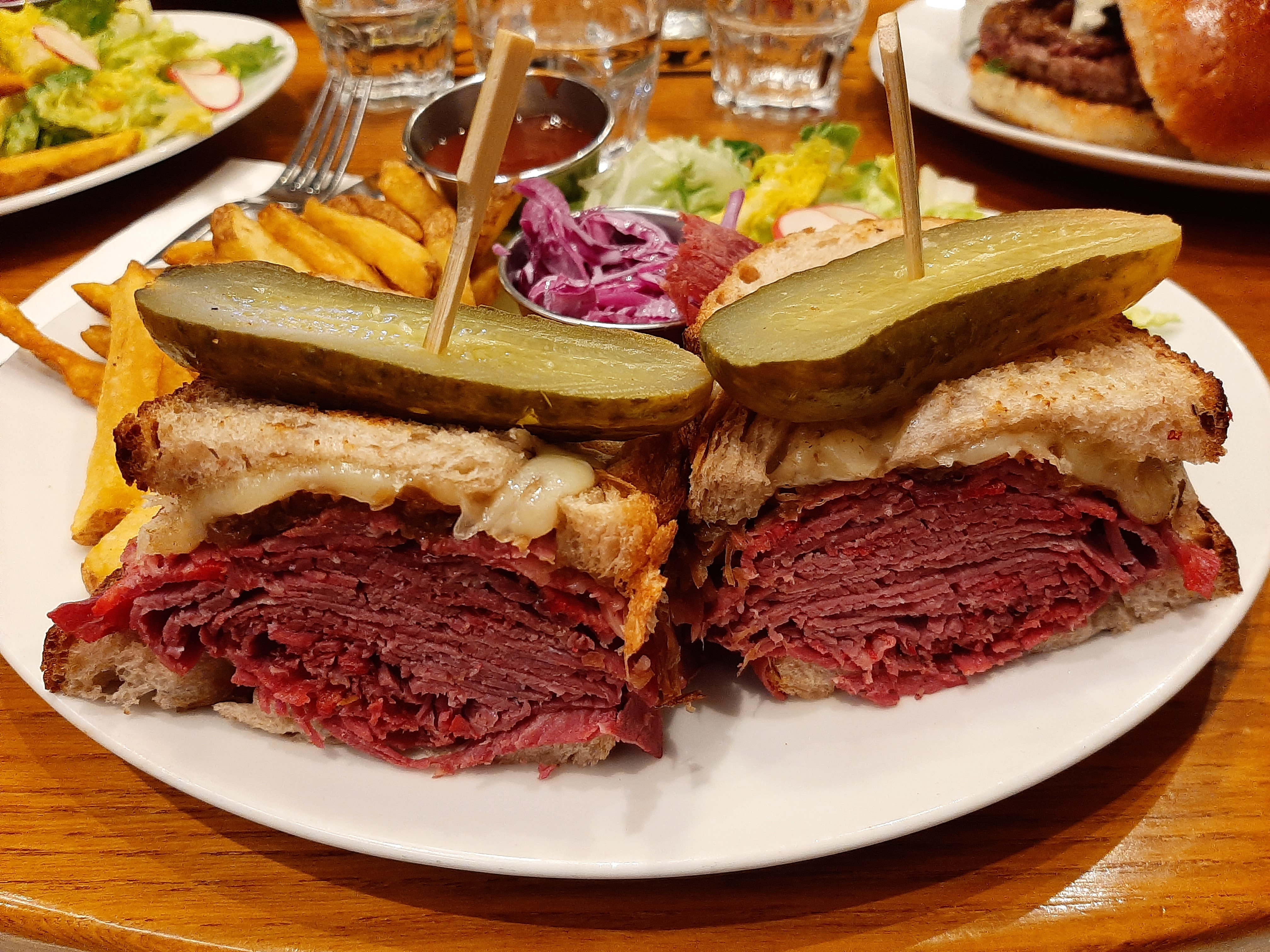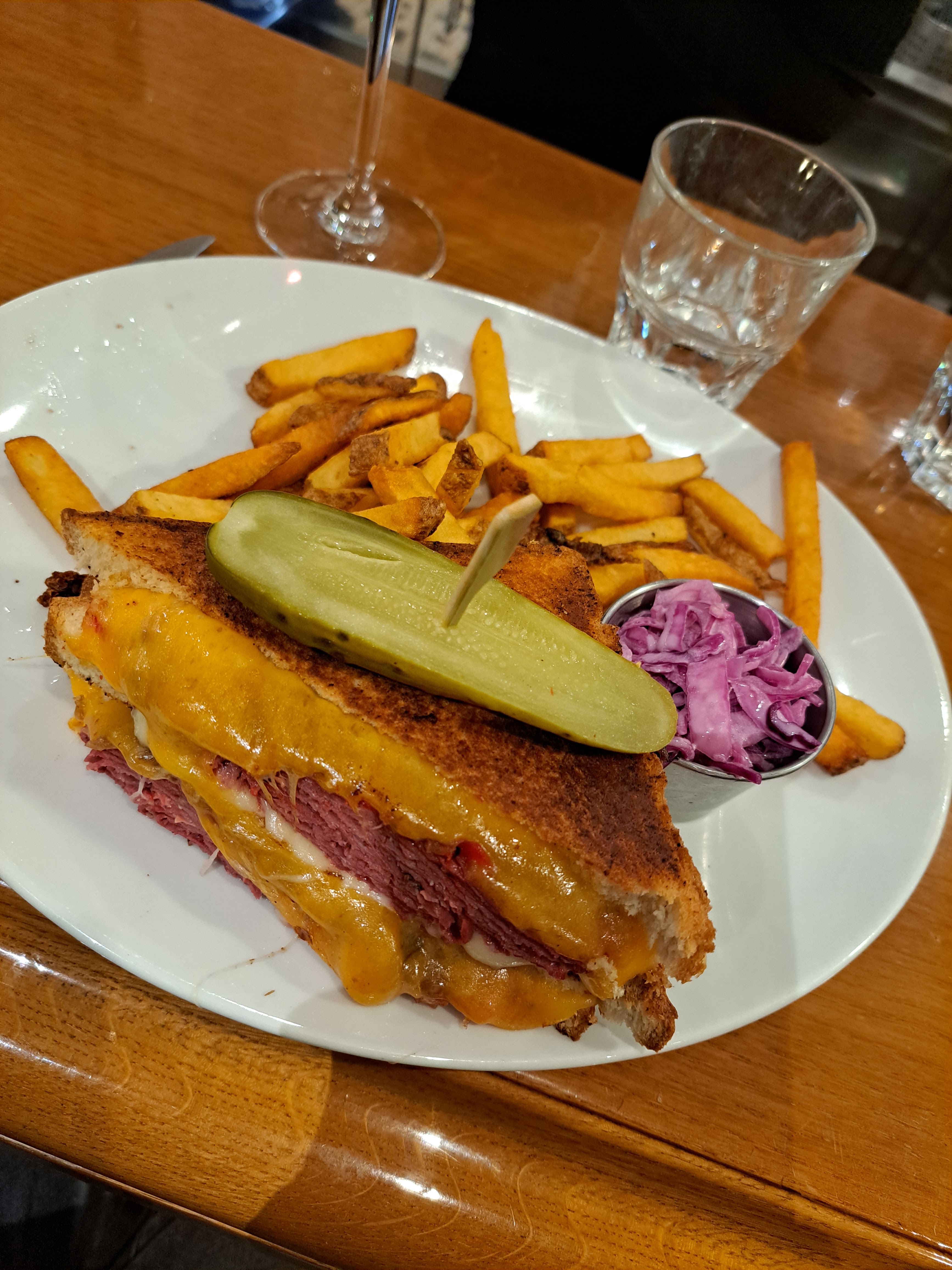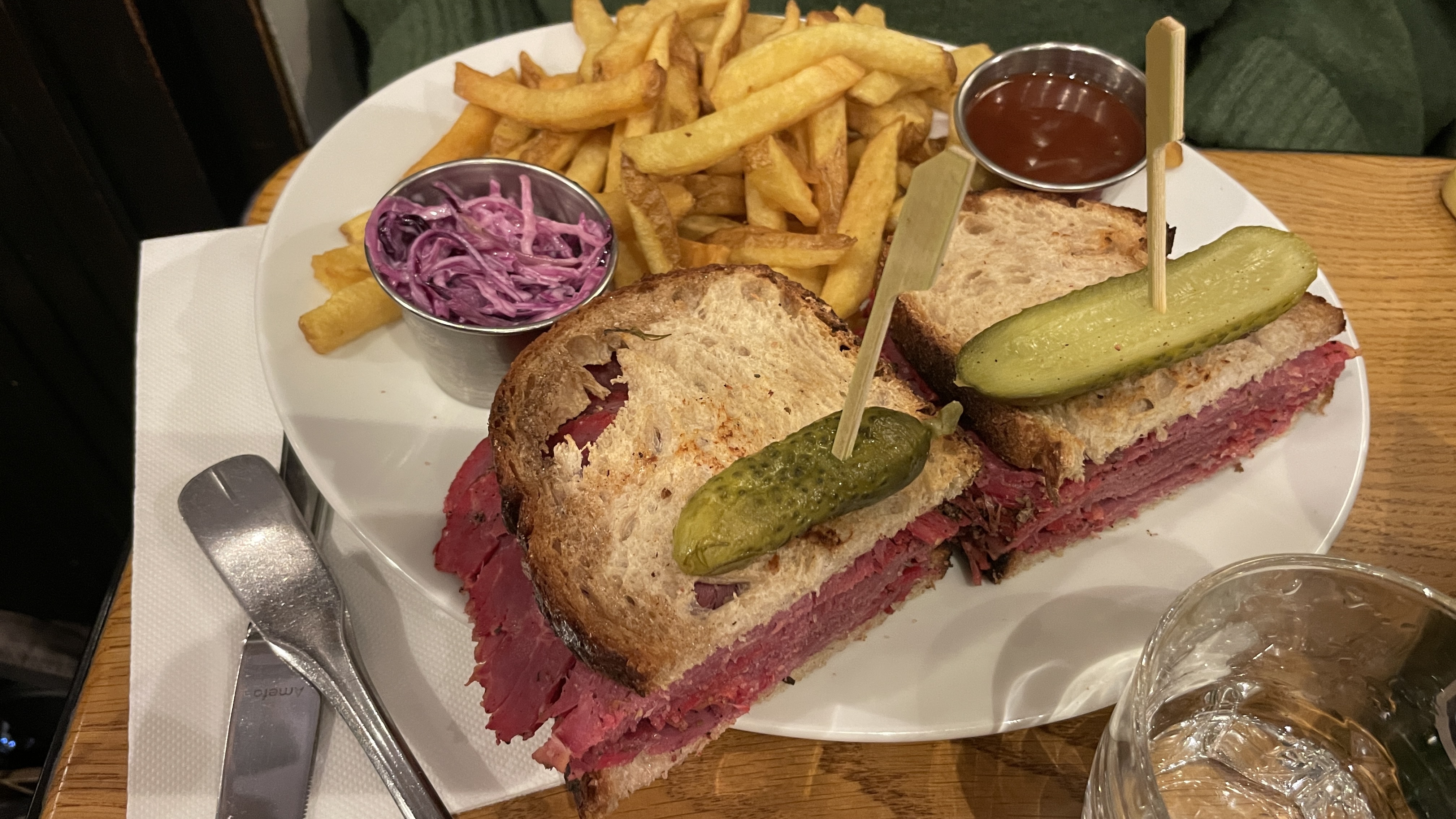 Très bon sandwiches, en particulier le Reuben. Très savoureux, mais vraiment beaucoup trop copieux ! La moitié aurait largement été suffisante, c’est dommage! La prochaine fois on combinera salade et sandwich. Service au top, bien que ce soit la Grande affluence.