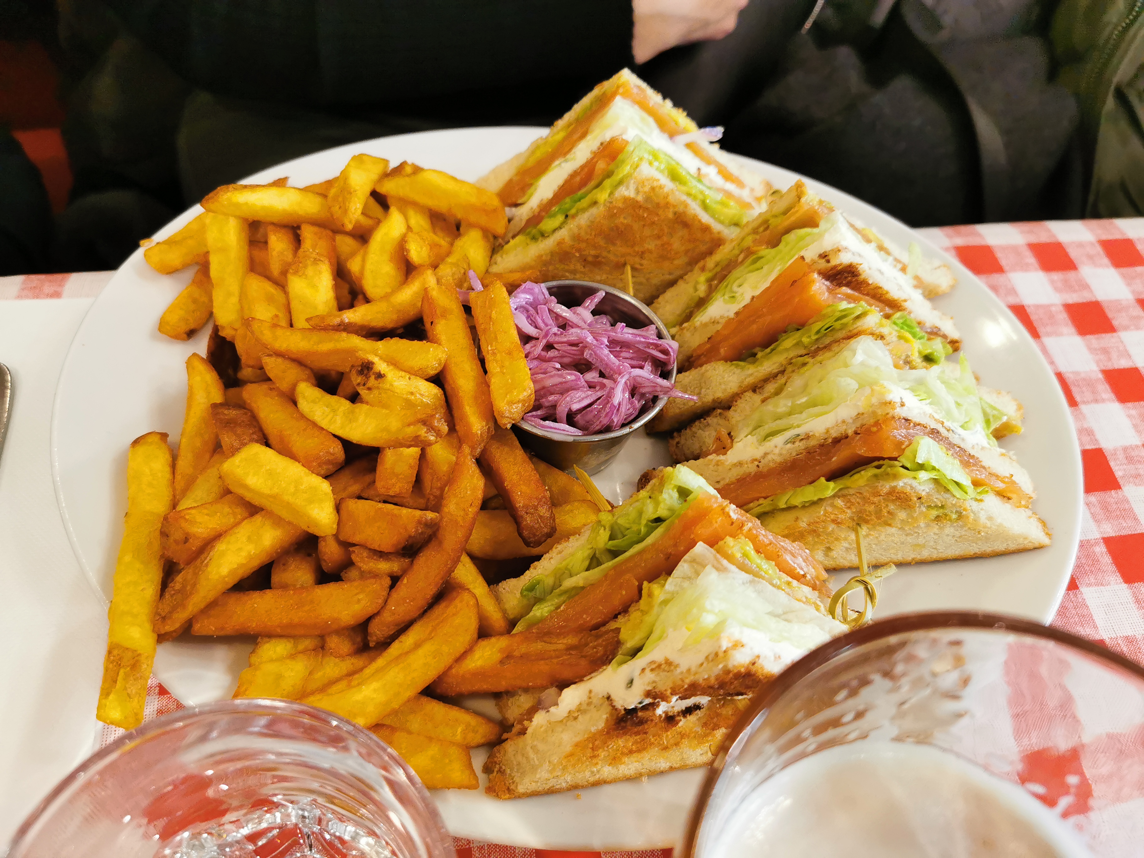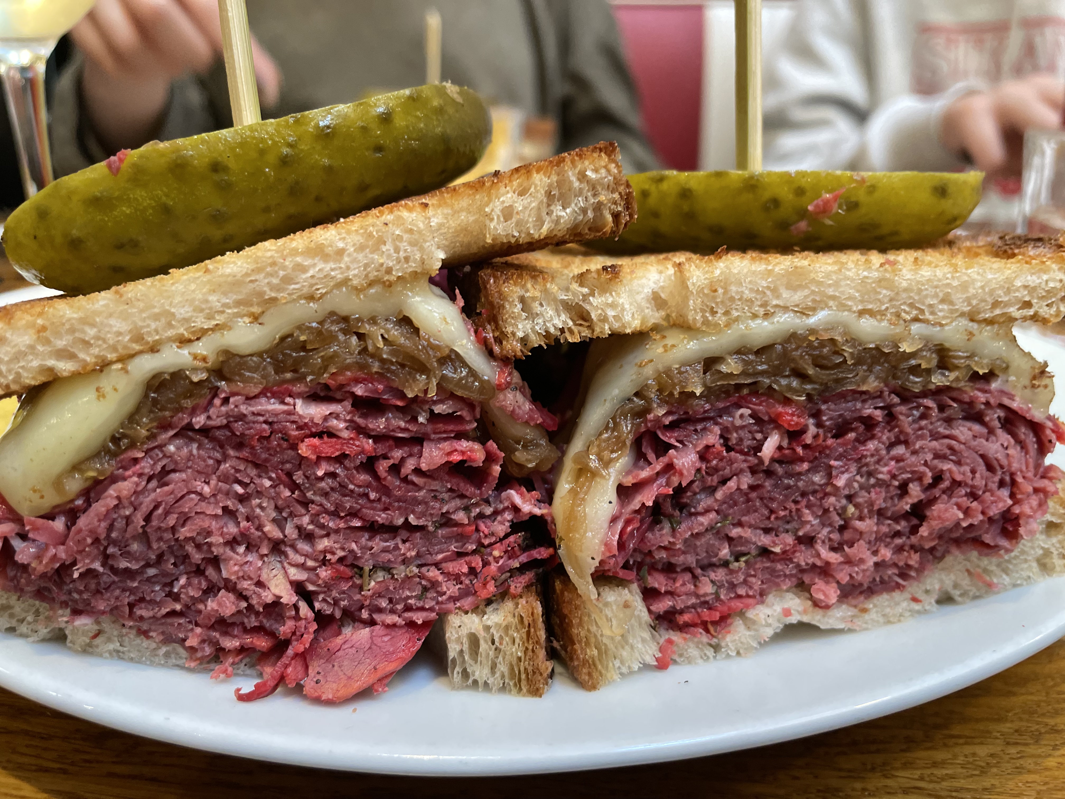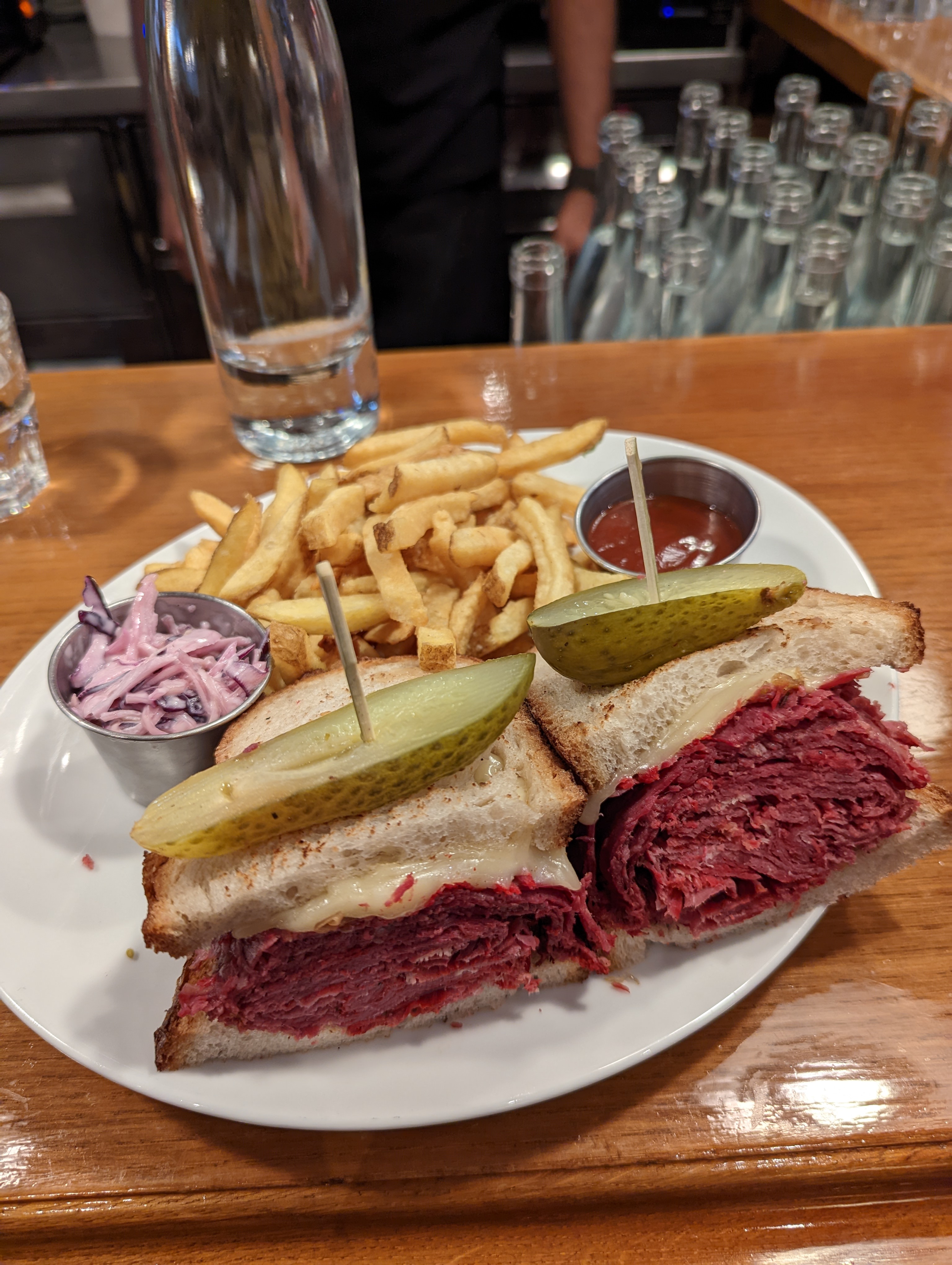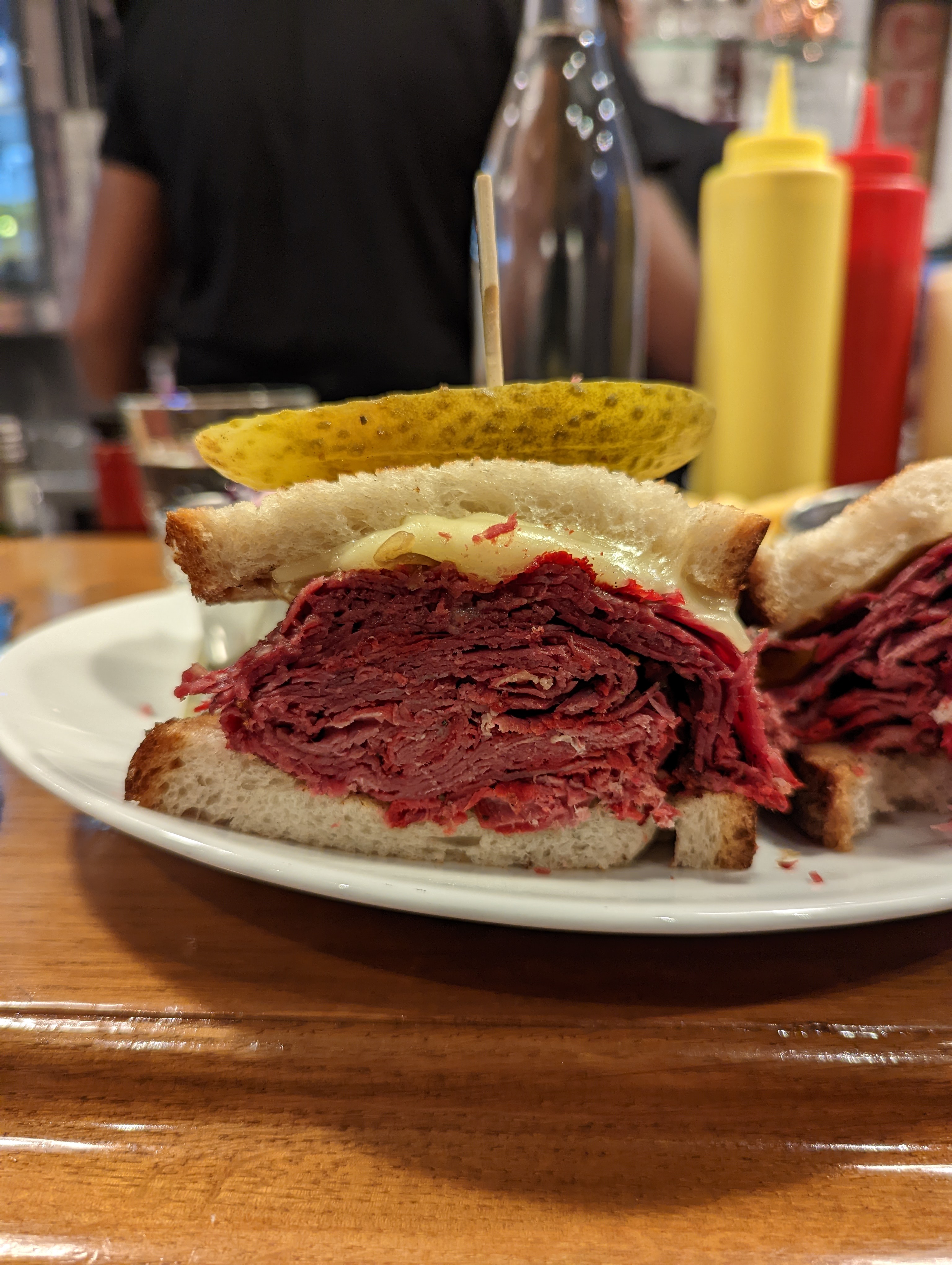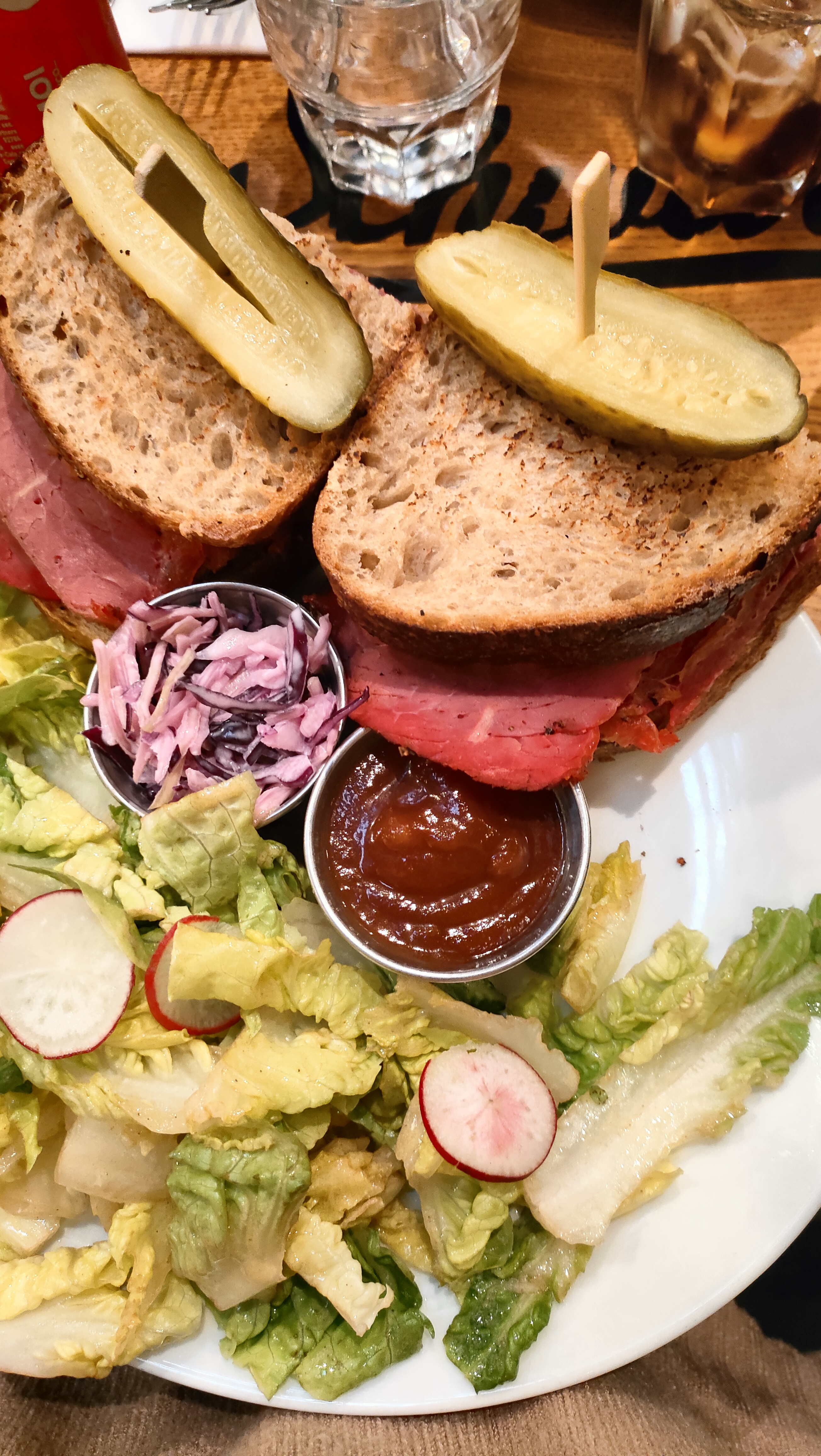 Très bon sandwiches, en particulier le Reuben. Très savoureux, mais vraiment beaucoup trop copieux ! La moitié aurait largement été suffisante, c’est dommage! La prochaine fois on combinera salade et sandwich. Service au top, bien que ce soit la Grande affluence.