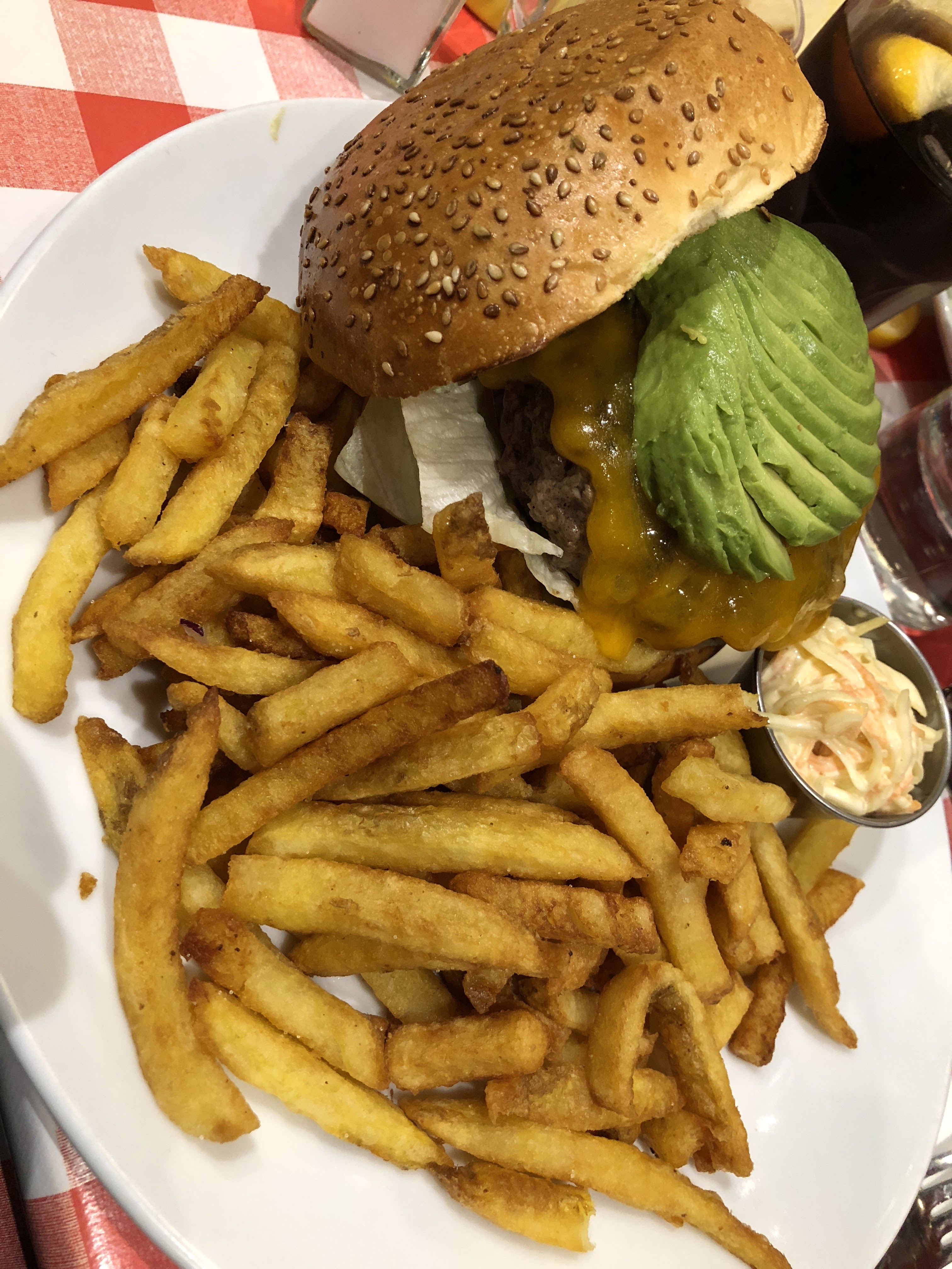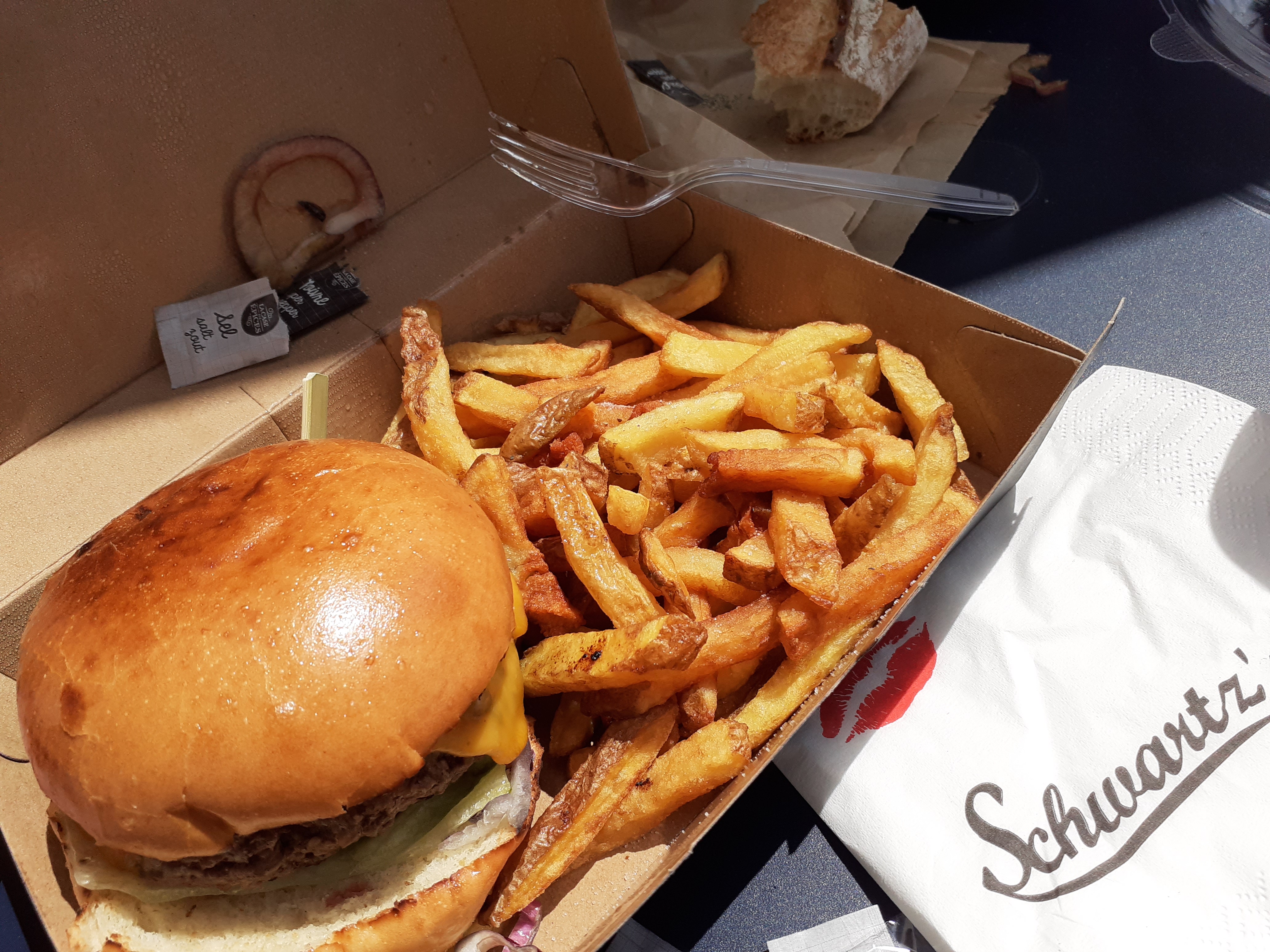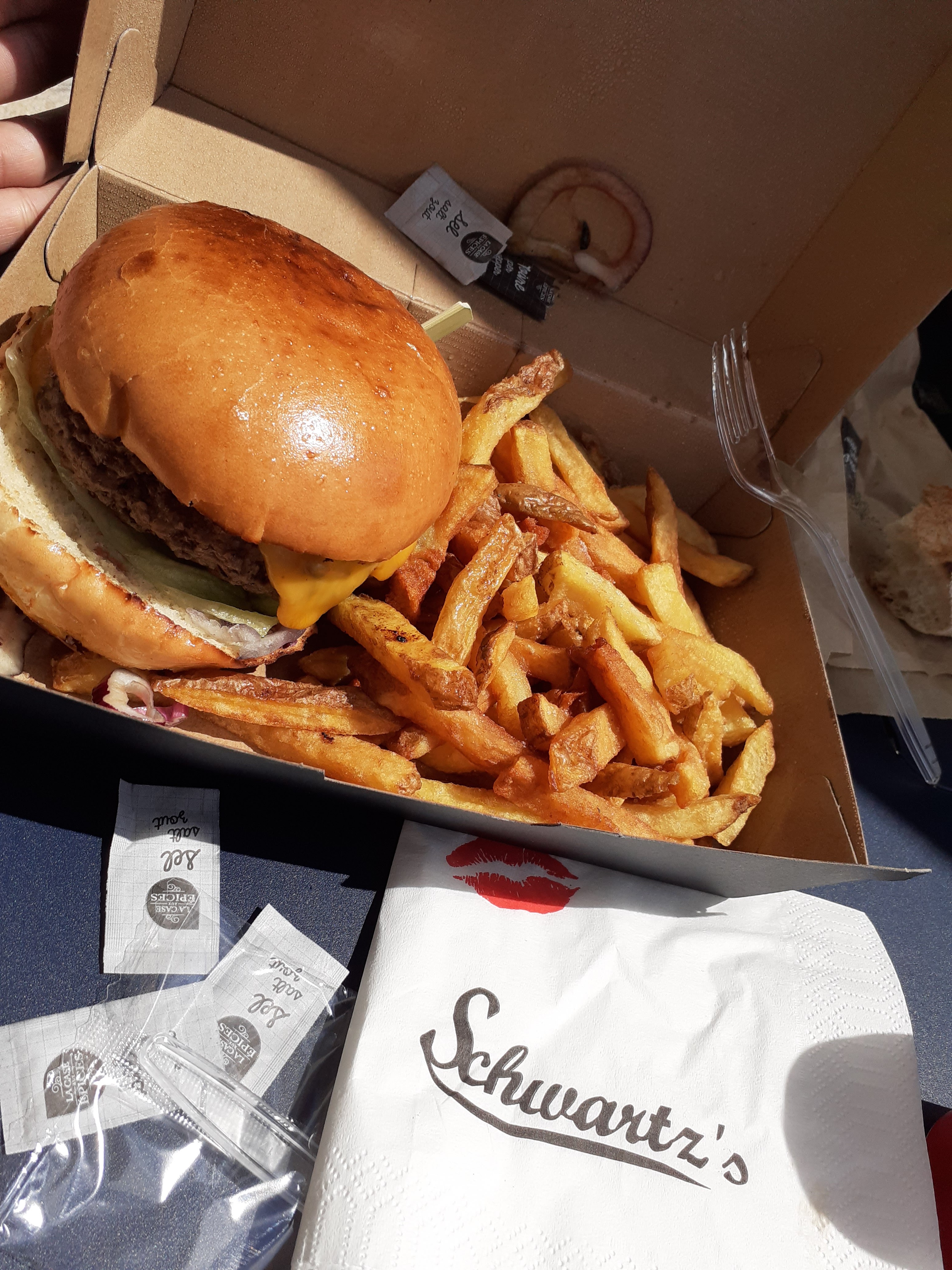 Un bon burger 🍔 de chez schwartz deli ! Un cheese-burger supplément avocat 🥑 ! La viande était enooooorme (elle est masquée sous le cheddar coulant).. le pain est bon, le cheddar est bon, la viande est excellente.. un bémol : les frites sans vraies saveur..