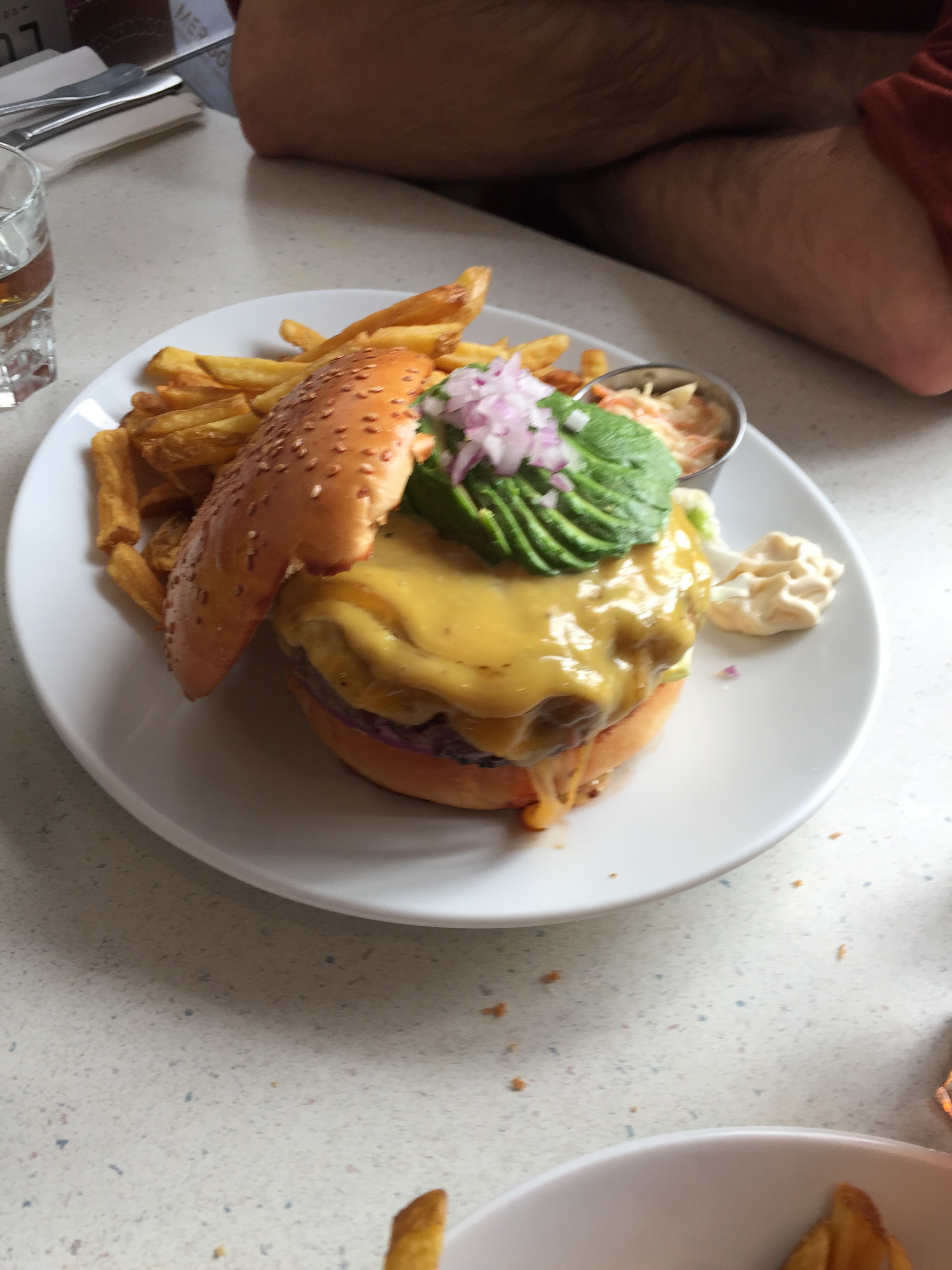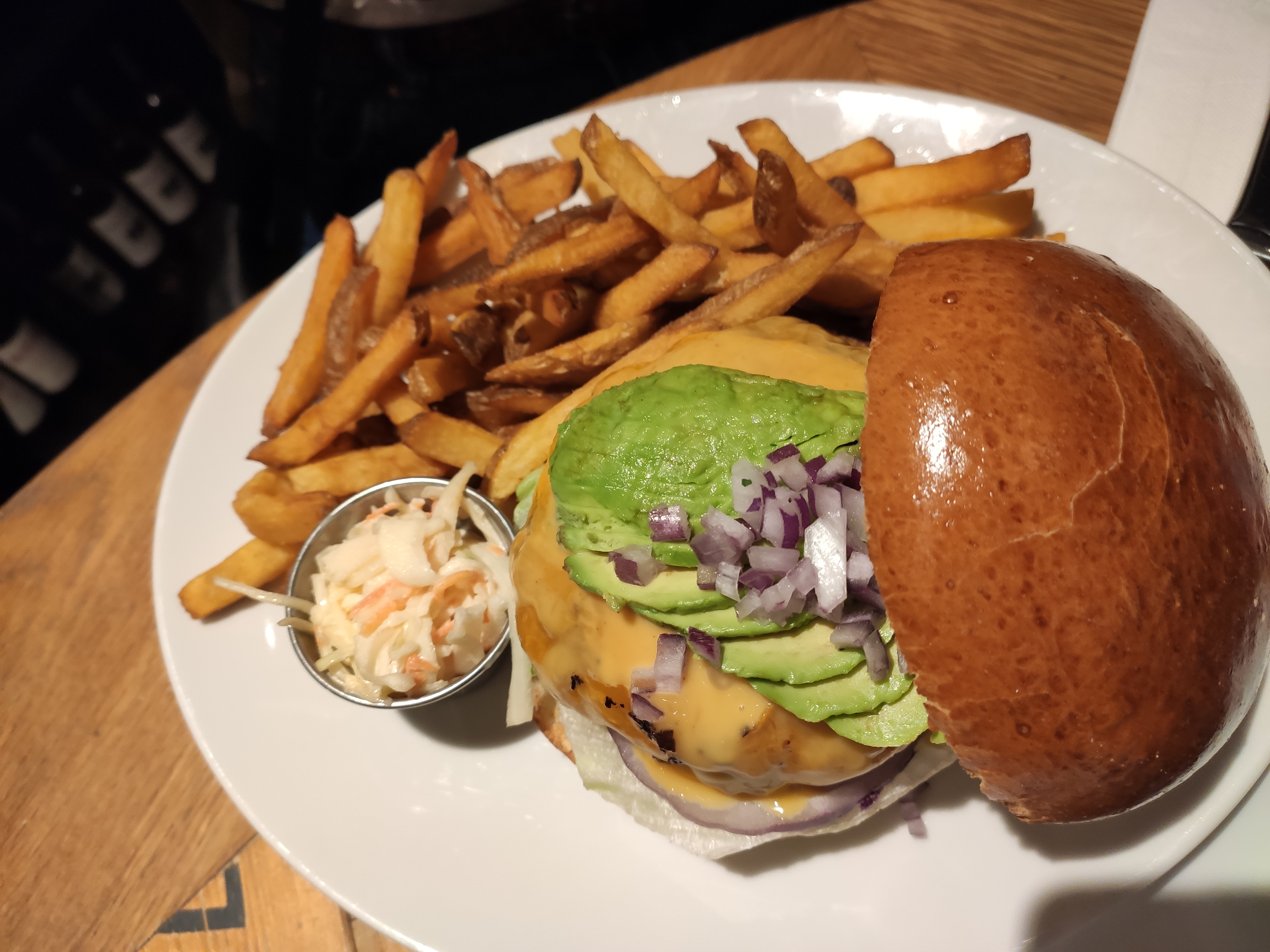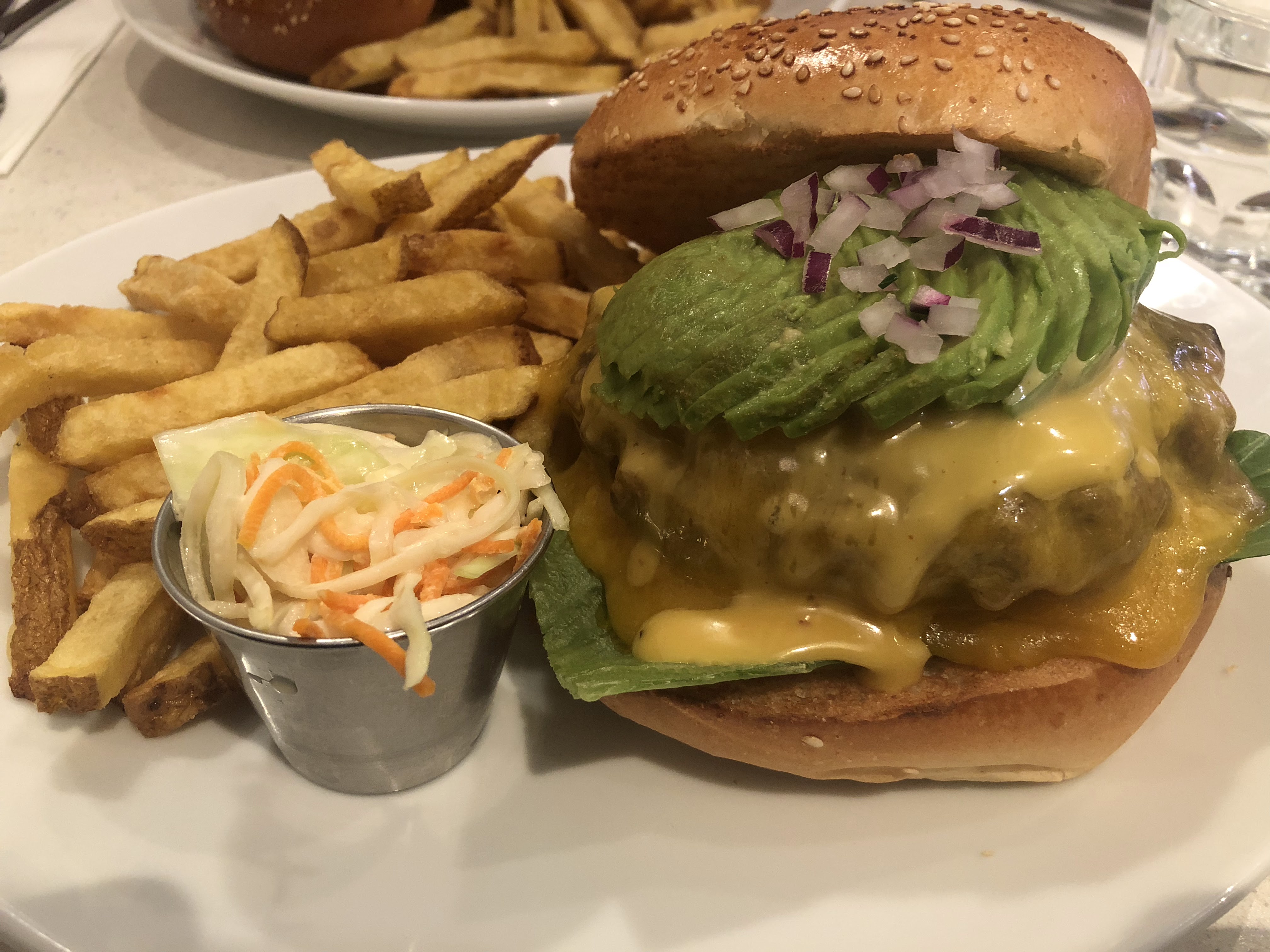 Un bon burger 🍔 de chez schwartz deli ! Un cheese-burger supplément avocat 🥑 ! La viande était enooooorme (elle est masquée sous le cheddar coulant).. le pain est bon, le cheddar est bon, la viande est excellente.. un bémol : les frites sans vraies saveur..