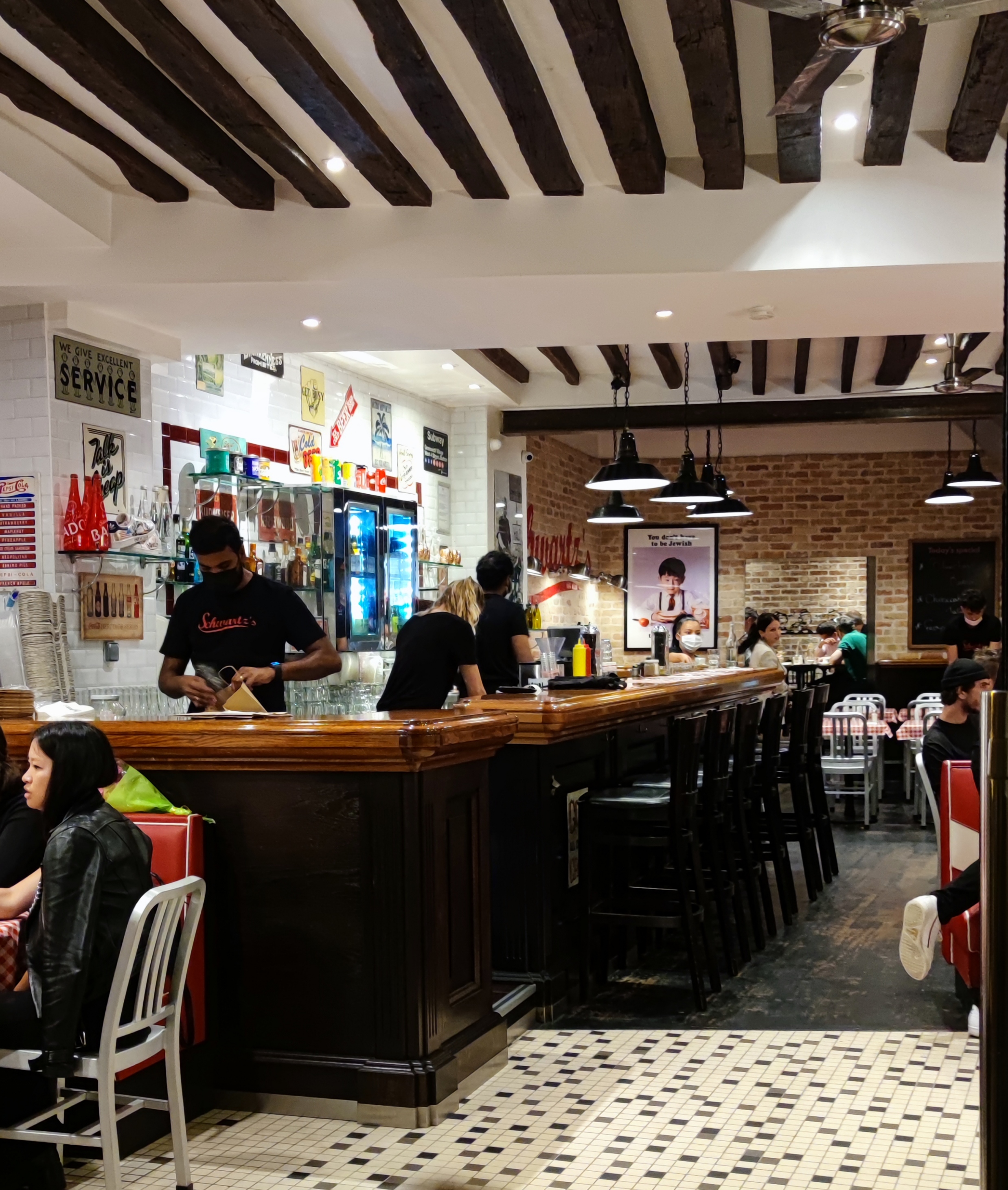 Accueil top ! Les serveurs et serveuses sont très attentionné(e)s. Je vous conseille le sandwich au pastrami qui fait parti des plats incontournables de chez Schwartz's. Pour les connaisseurs, il est légèrement différent de celui de Montréal. Ici, on ne choisit pas la taille et la variété de la viande (grasse, medium, sèche). Un conseil, pensez à arriver tôt si vous voulez éviter d'attendre qu'une table se libère...