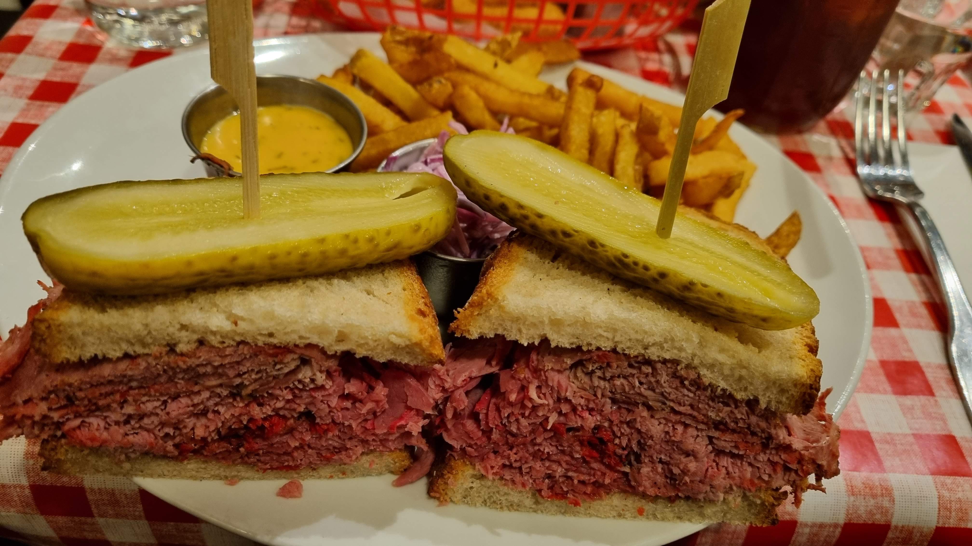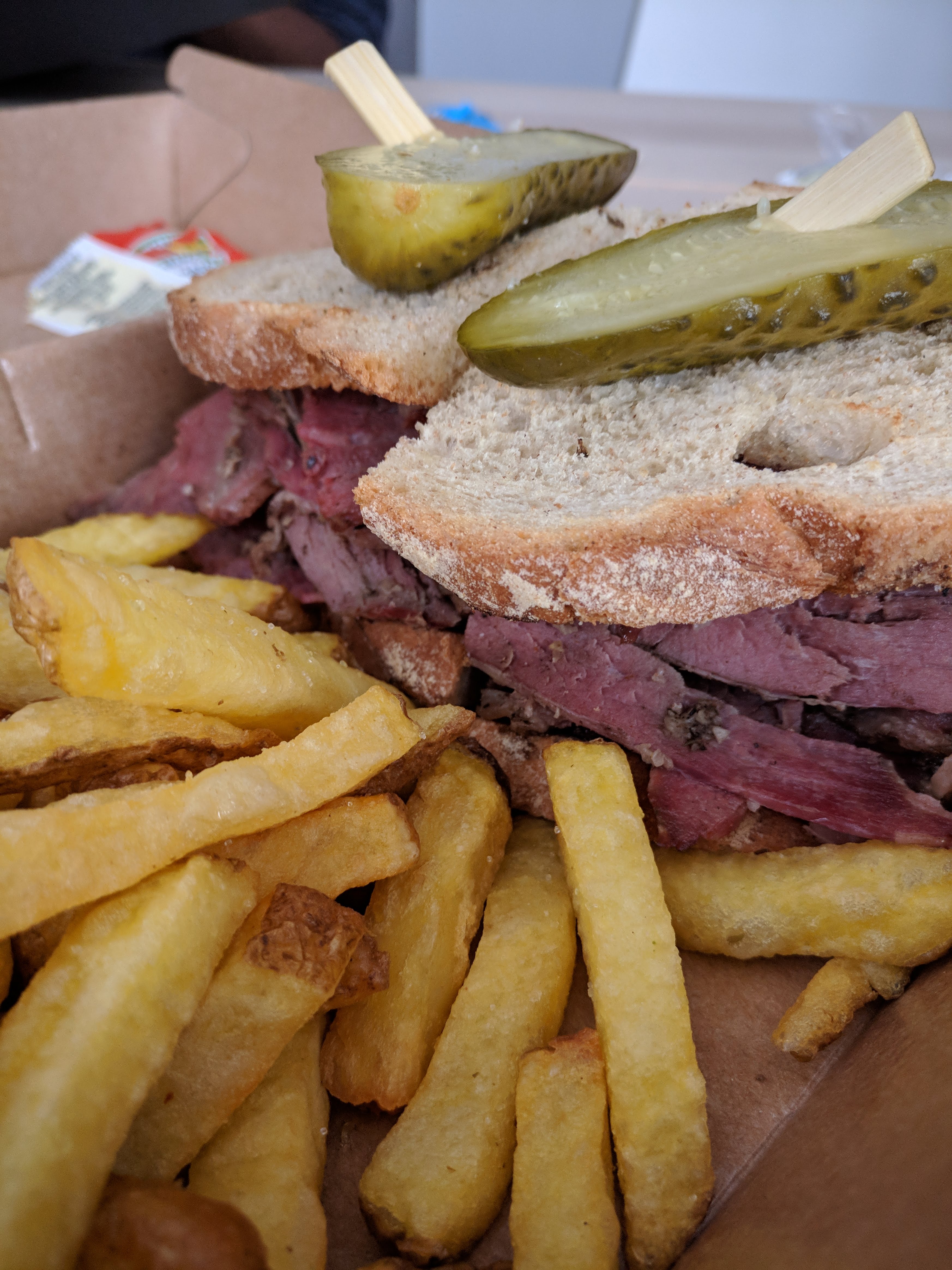 Un régal le sandwich au boeuf pastrami ! Les fines tranches de viande étaient succulentes, macéré au cumin, ce qui donne une note gustative qui démarque. Les frites étaient assez bonnes, ni trop mole ni trop croustillante, ni trop cuite. Seul petit bémol, le prix un petit peu élevé et on est un peu à l'étroit.