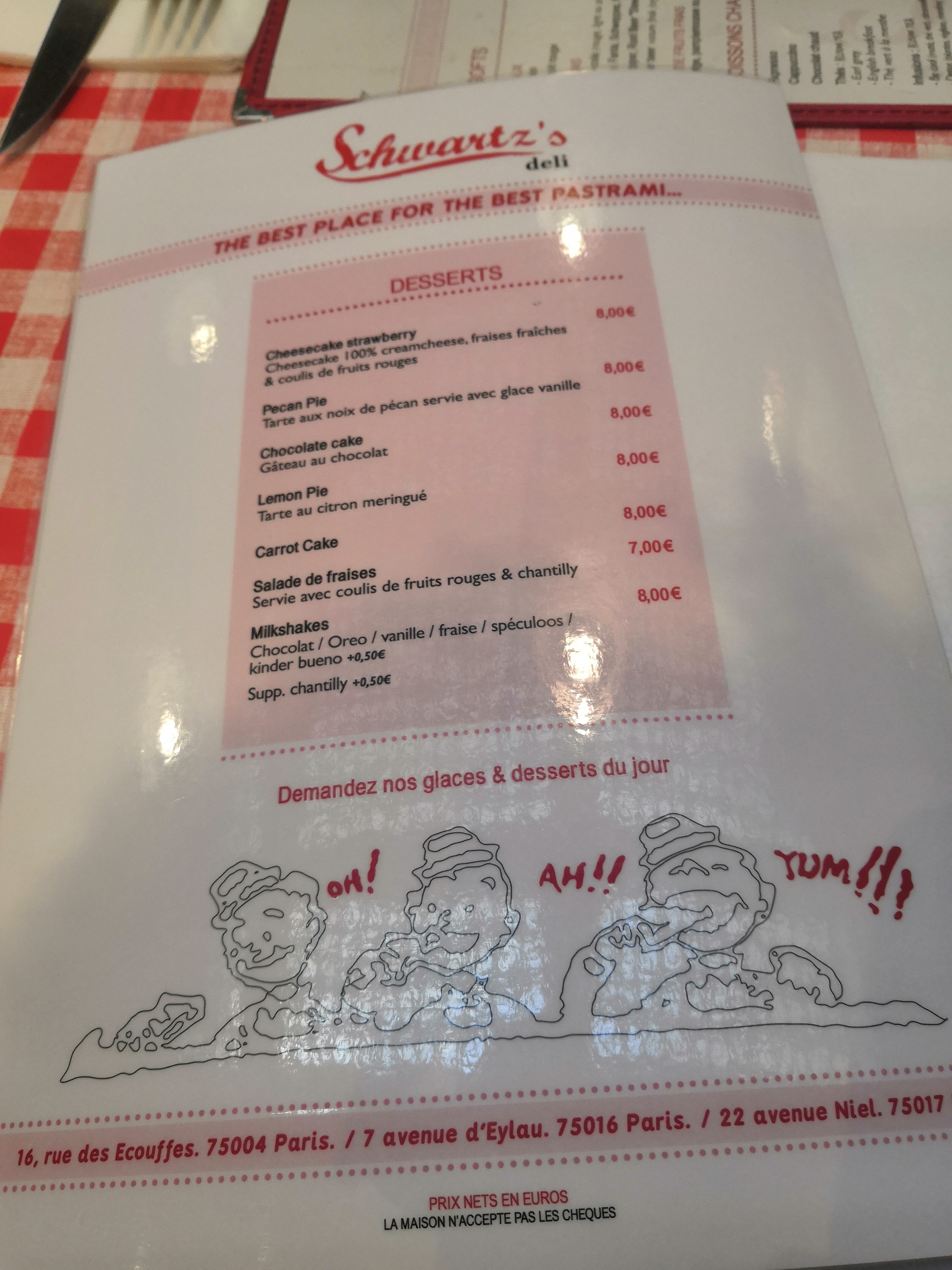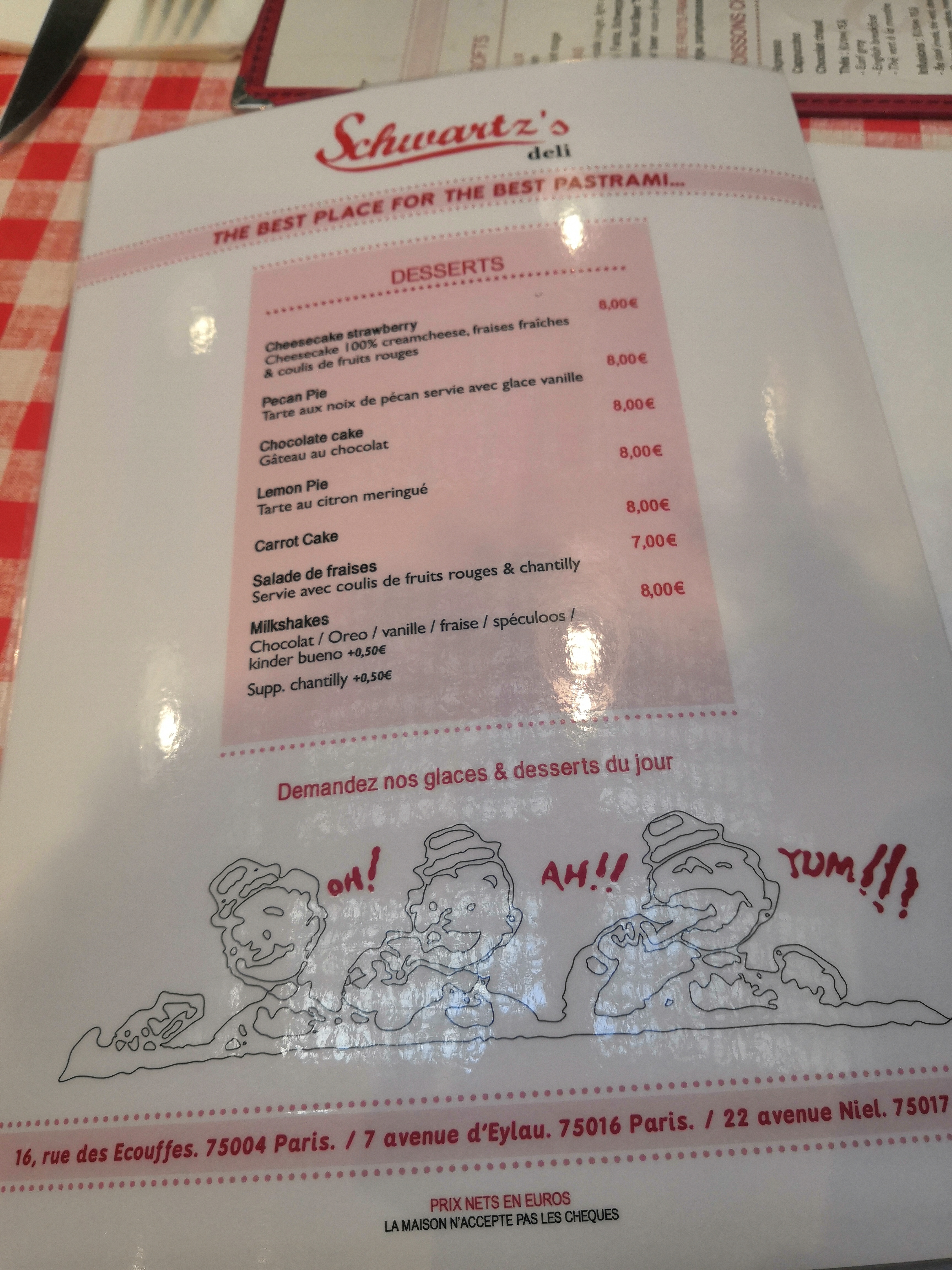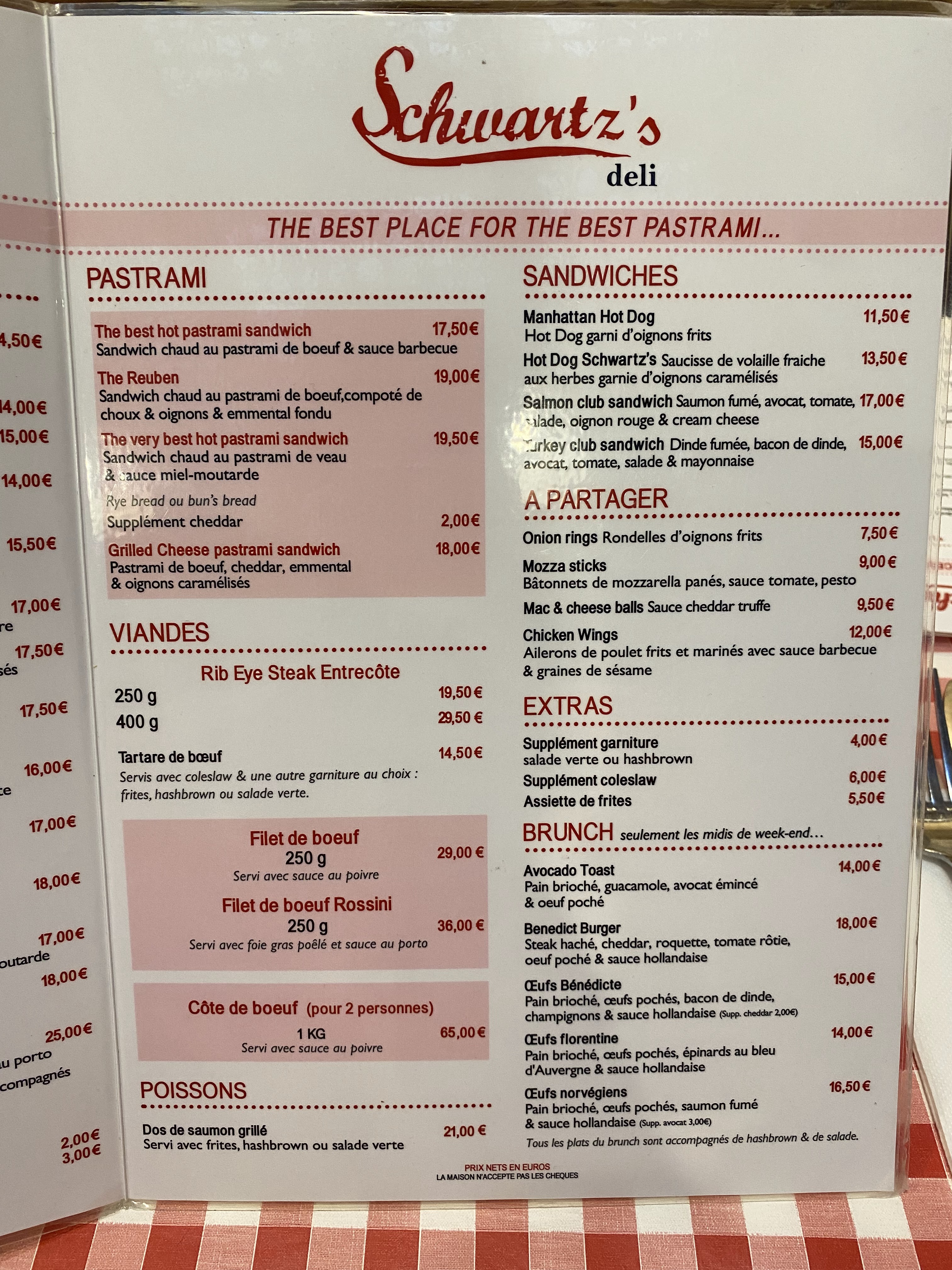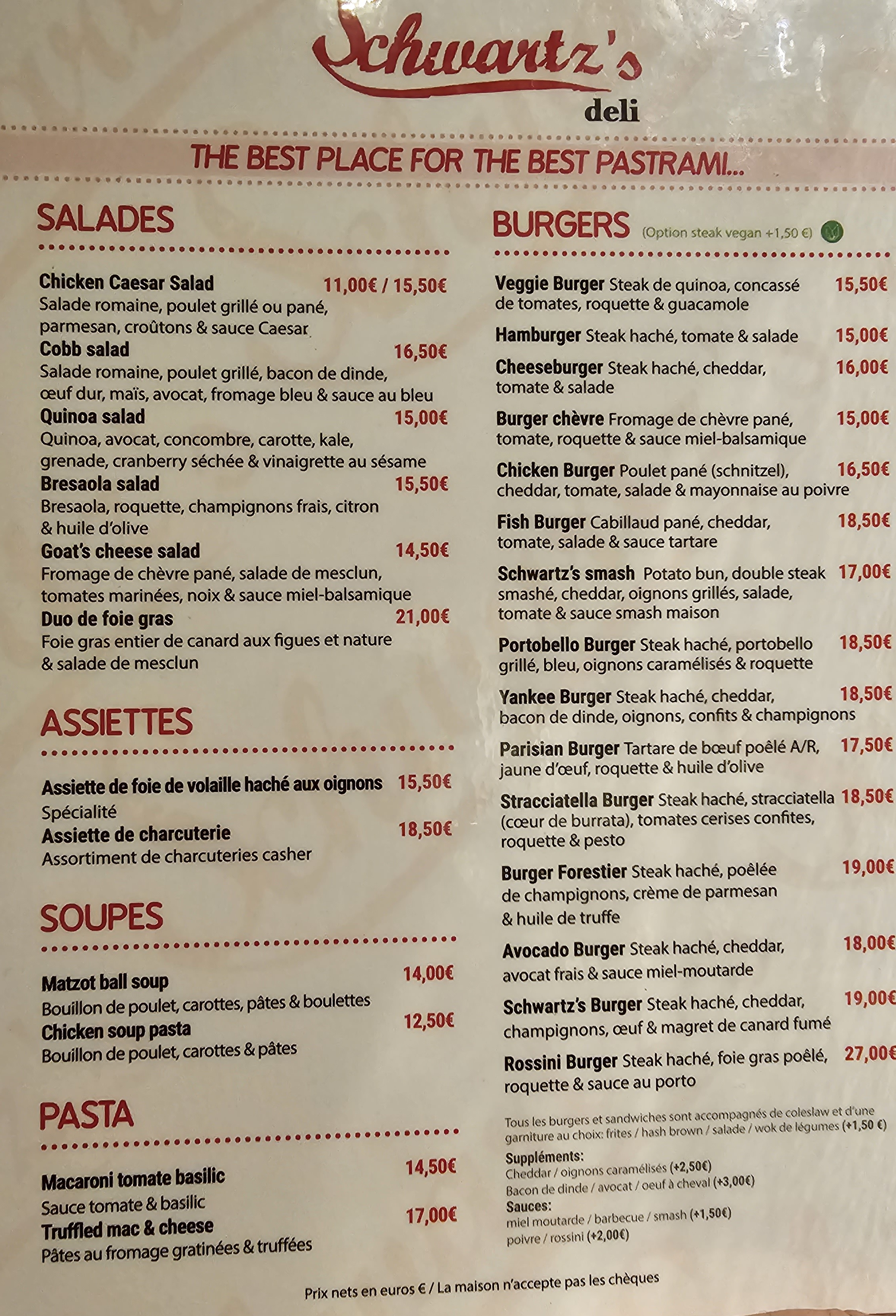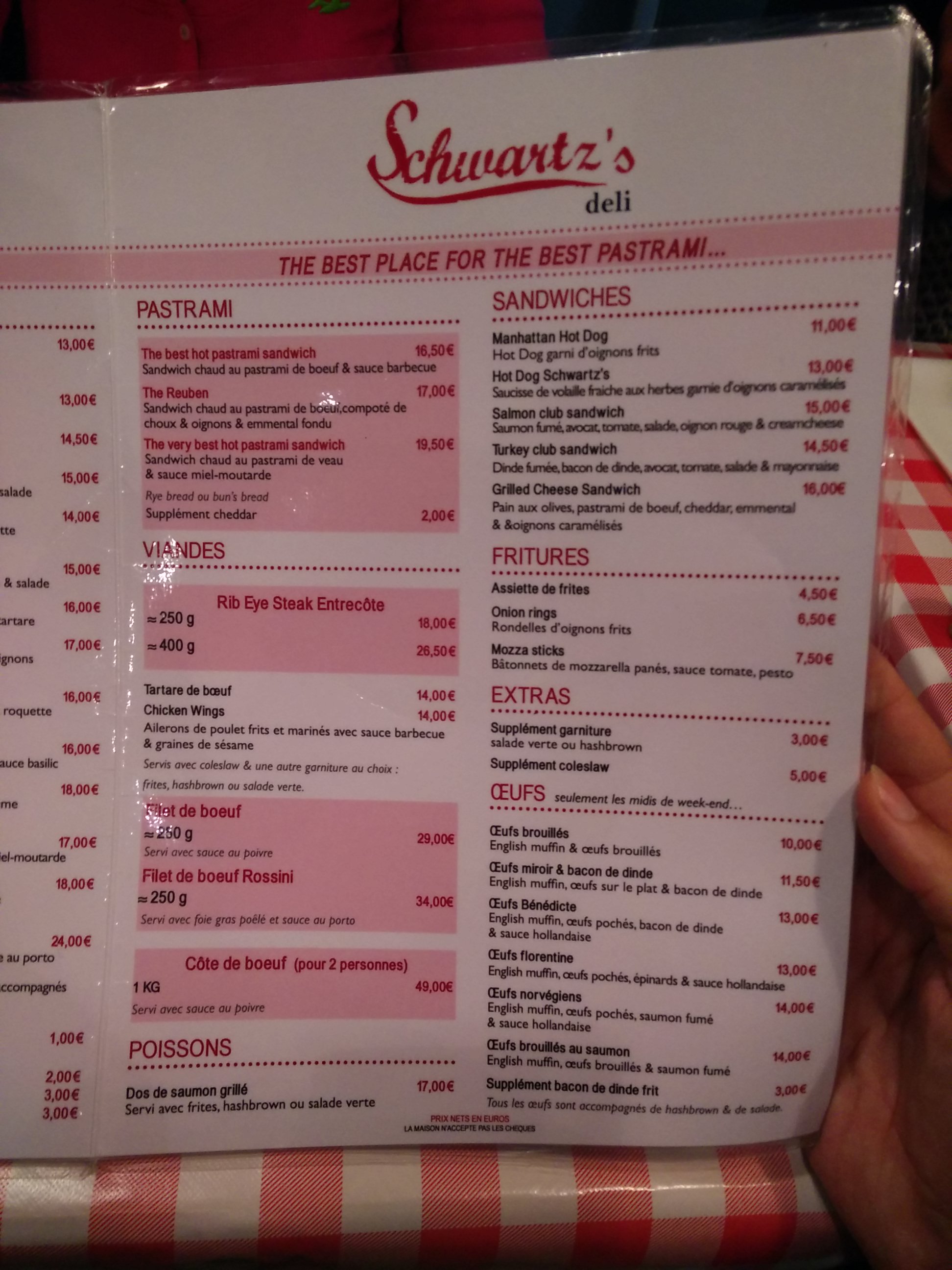 Nous avions mangé il y a qqs années au Schwartz’s du Trocadéro où nous avions passé un moment mémorable. Même si l’expérience fut bonne elle est en deçà. Les frites n’étaient pas chaudes; on vous installe vite pour que vous partiez aussi vite et les tables sont très très collées. Gustativement, cela reste bon et copieux.