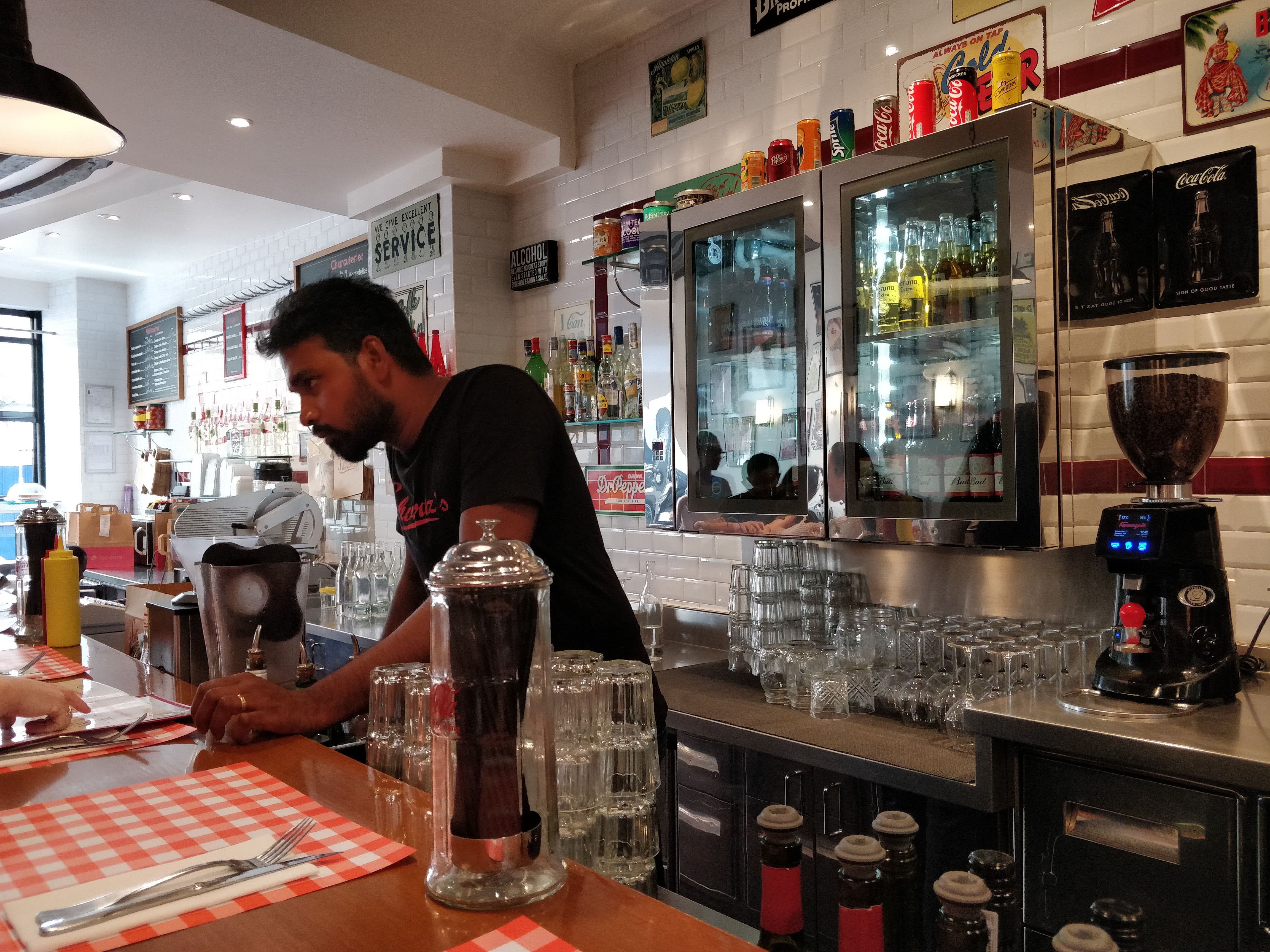 Intérieur un peu étriqué mais sympa. Les serveurs(euses) font preuves de professionnalisme. Si vous cherchez un tres bon et copieux burger ou pastrami vous ne serez pas déçu