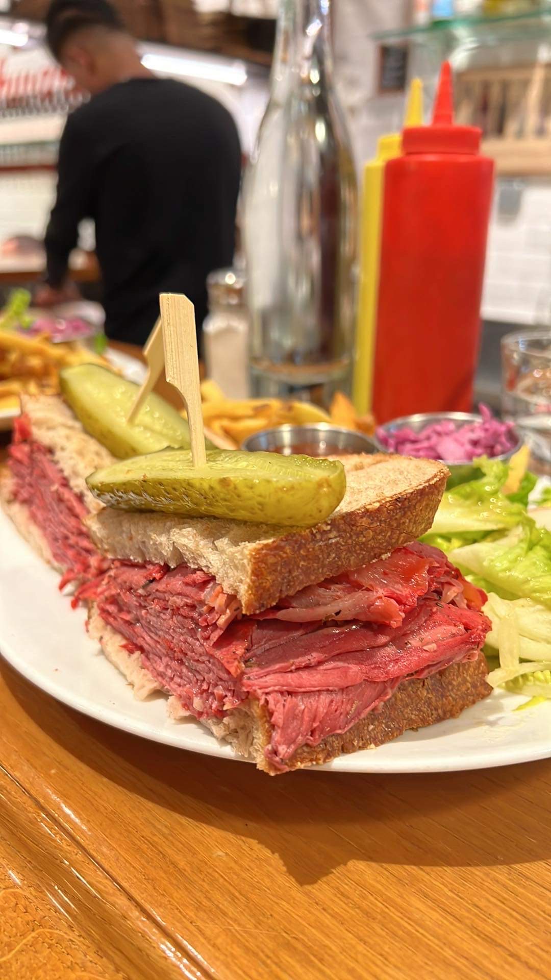 Bien que le repas soit copieux, le goût n'y est pas, en tout cas pour le sandwich pastrami que j'ai commandé. Il faut s'attendre à beaucoup de monde entre midi et deux, mais les serveurs sont accueillants. Le prix est quand même élevé selon moi, bon après on est Paris 🙄